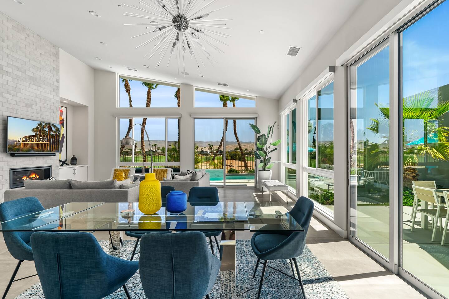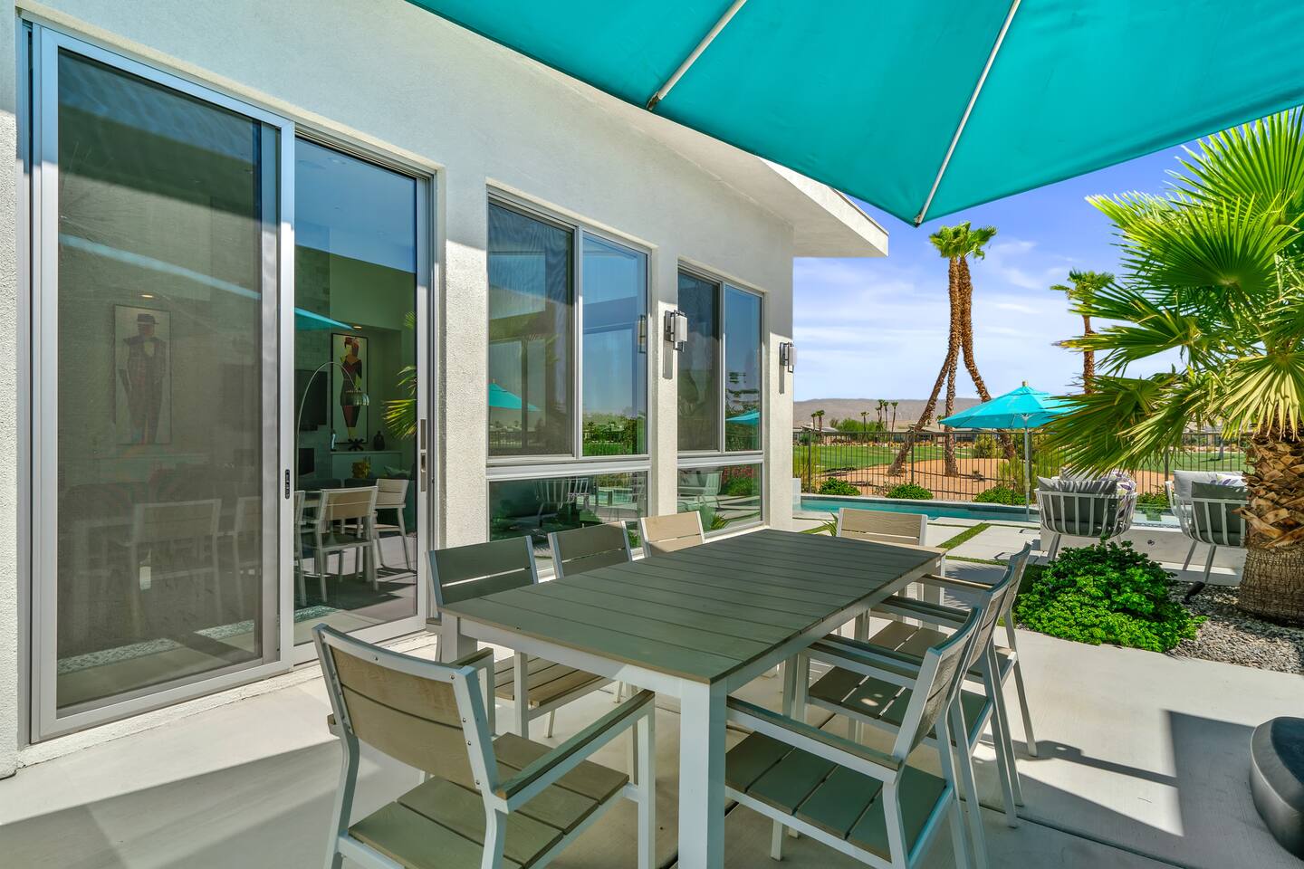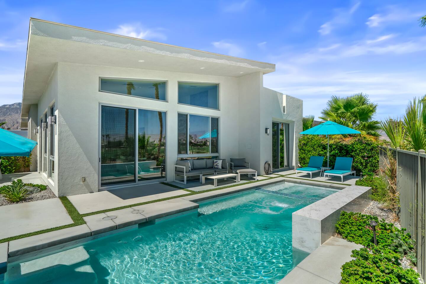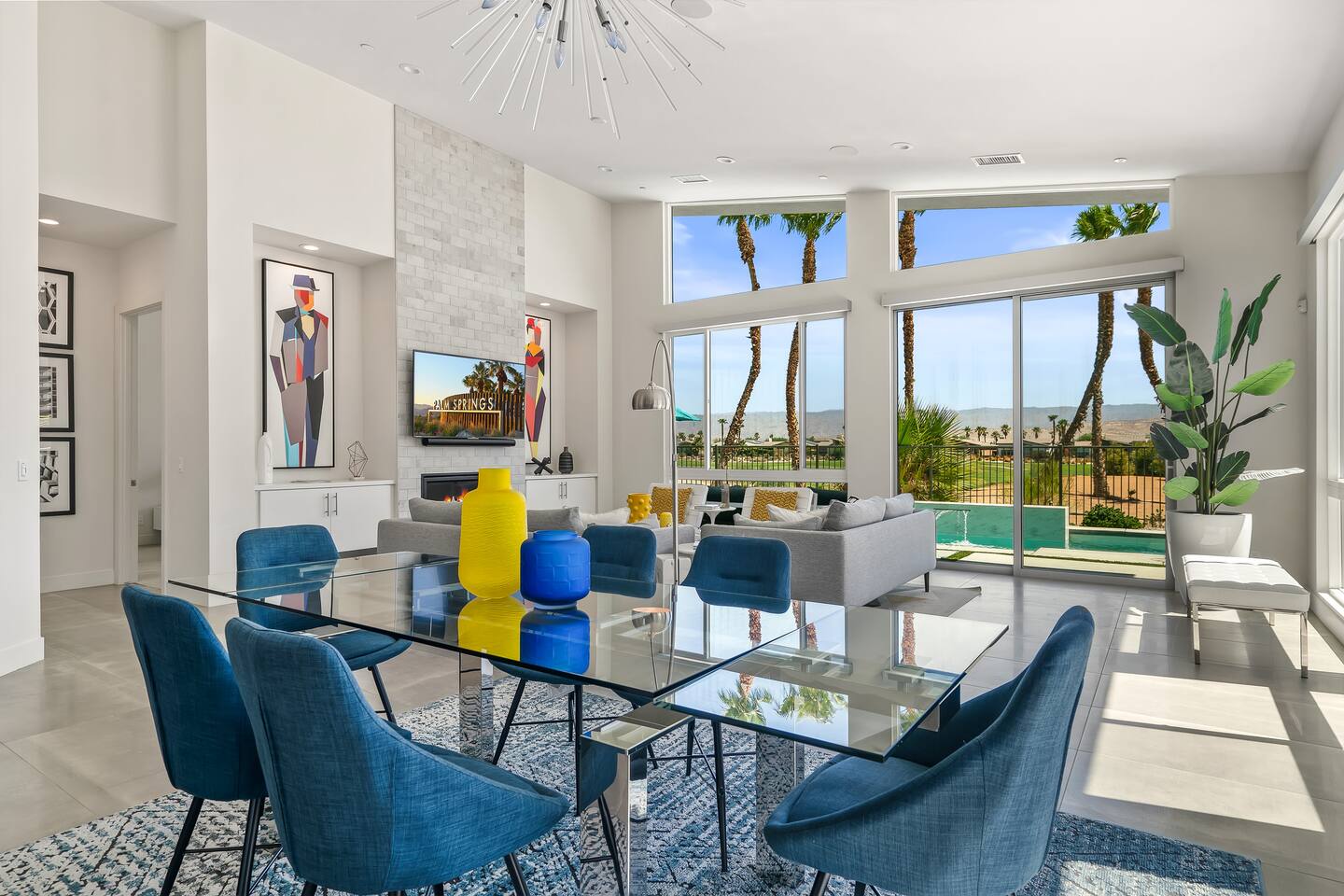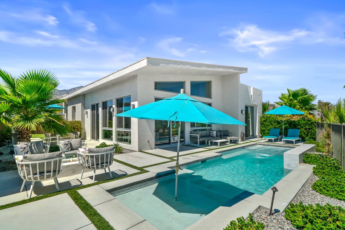 Gather around the two comfy, contemporary sofas and over-scaled steel coffee table to watch your favorite shows on the 65in Sony Smart TV equipped with Apple TV and Sonos soundbar. Just push a button to lower or raise the state-of-the-art window shades for the beautiful mountain view to create a delightful evening mood. A fully-equipped chef's kitchen features new stainless steel appliances, plenty of counter space for preparing meals, with seating at the kitchen island for a snack or breakfast. Fire up the Blaze Pro natural gas grill for sunset al fresco dinners with patio dining for 6. If you’re planning on staying a while, take advantage of the huge laundry room with washer/dryer, decorated in Mid Century Modern art. Cozy up in the teal themed master bedroom with a gorgeous velvet king-size bed with Apple TV and Sonos soundbar and bask in luxury in the fabulous free-standing tub in the large ensuite bathroom. The guest room features a navy velvet queen-size bed and sophisticated white and gold glam furnishings along with TV and Sonos soundbar. The 3rd room/den is smartly decorated as additional lounge seating with Smart TV or just lower the Murphy bed to reveal a queen-size bed! A nod to the “Rat Pack” adds a hipster retro feel. Relax by the pool by day in the patio loungers, do a few putts on the putting green, or soak in the hot tub under the stars in beautiful Palm Springs. Bask in contemporary luxury at the Celadon House! Amenities: Accommodations for 6 1 King Bed and 2 Queen beds with plush hotel quality mattresses. 2 En-suite bathroom and 1 full hall bathroom Luxury Brooklinen linens Private heated pool (upon request) Spa (heating included with stay) Pool towels and floatation toys 4 Sun lounges Shade umbrellas 1 Fire pit OutdoorBBQ Wall-mounted TV in the living room Fully equipped kitchen Dining table with seating for 6 Laundry with full-size washer and dryer 2 car garage