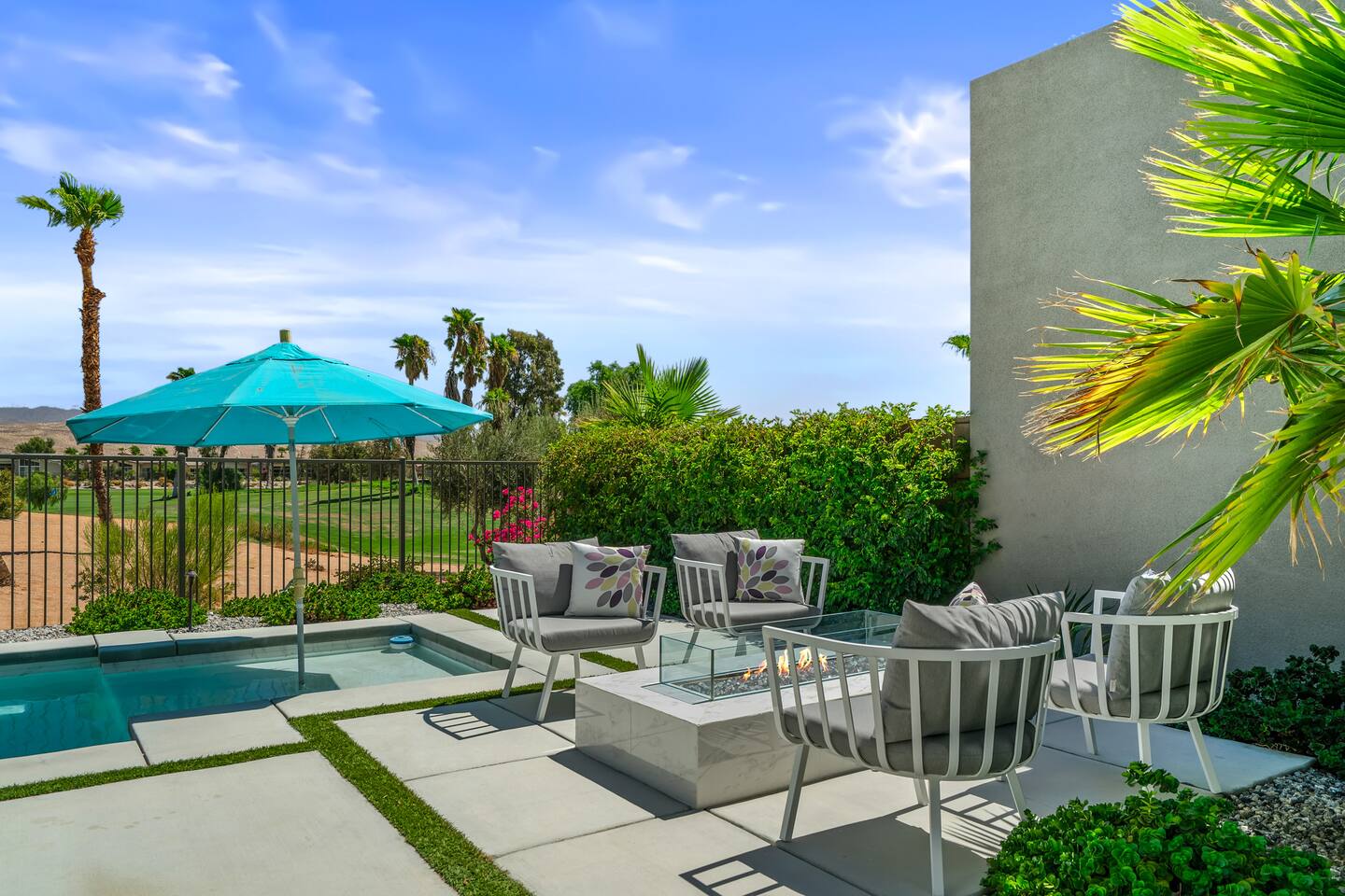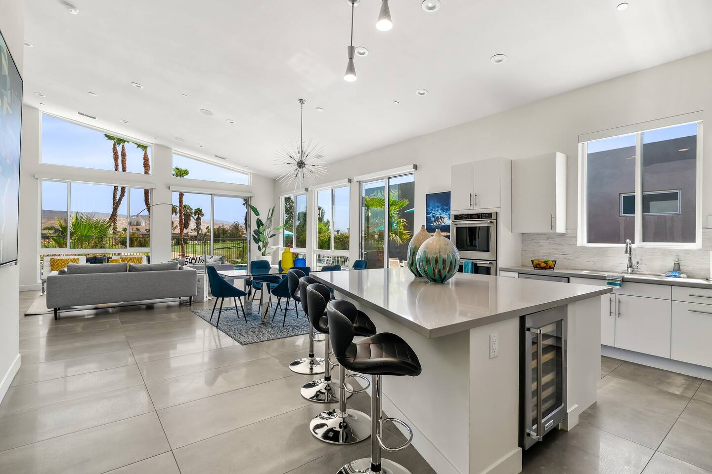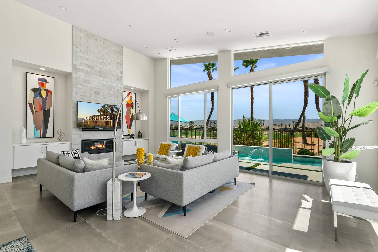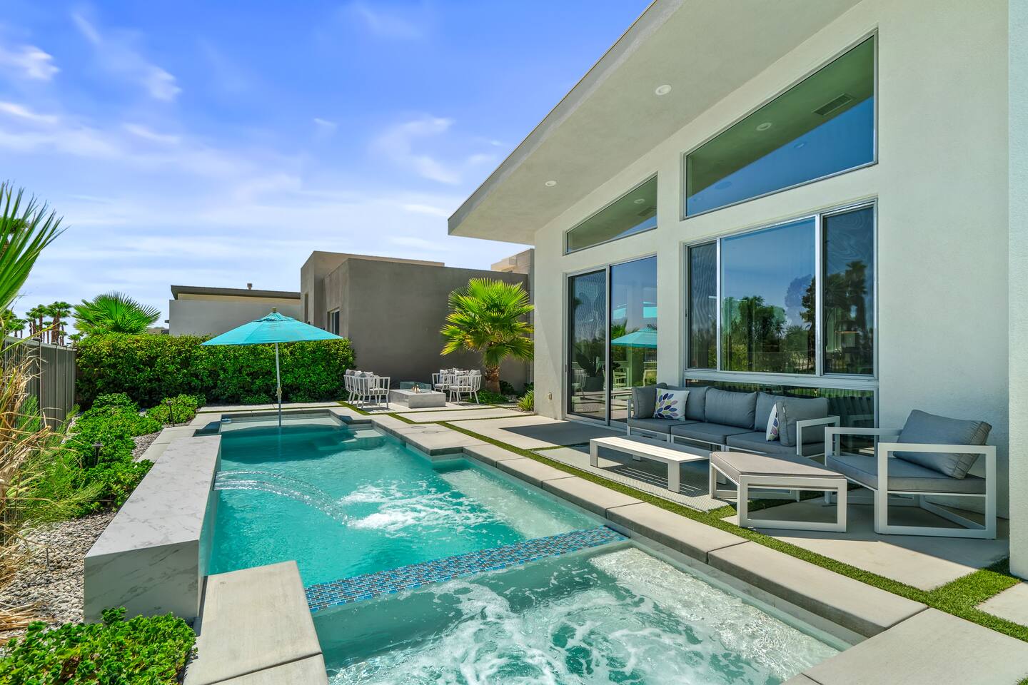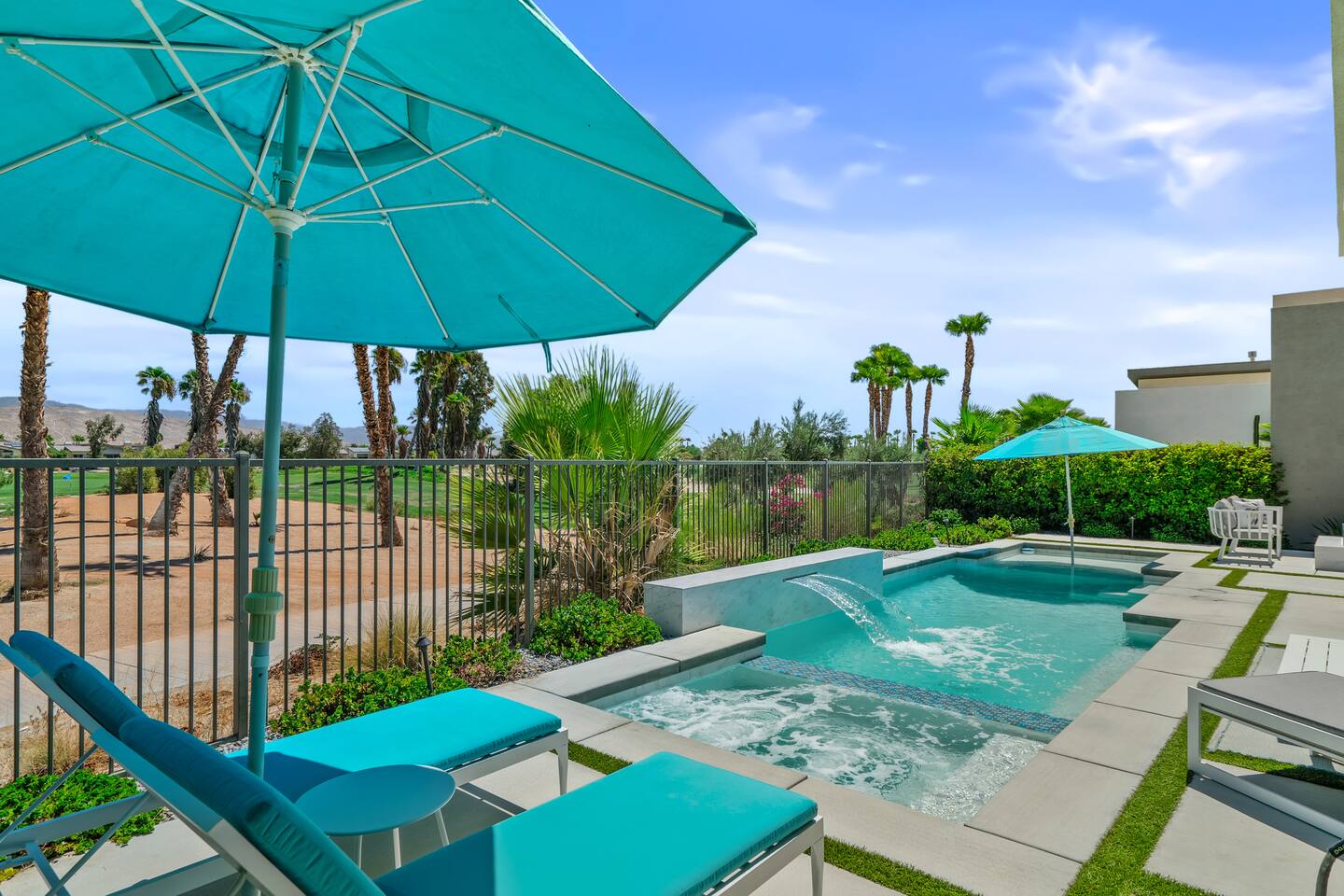 Gather around the two comfy, contemporary sofas and over-scaled steel coffee table to watch your favorite shows on the 65in Sony Smart TV equipped with Apple TV and Sonos soundbar. Just push a button to lower or raise the state-of-the-art window shades for the beautiful mountain view to create a delightful evening mood. A fully-equipped chef's kitchen features new stainless steel appliances, plenty of counter space for preparing meals, with seating at the kitchen island for a snack or breakfast. Fire up the Blaze Pro natural gas grill for sunset al fresco dinners with patio dining for 6. If you’re planning on staying a while, take advantage of the huge laundry room with washer/dryer, decorated in Mid Century Modern art. Cozy up in the teal themed master bedroom with a gorgeous velvet king-size bed with Apple TV and Sonos soundbar and bask in luxury in the fabulous free-standing tub in the large ensuite bathroom. The guest room features a navy velvet queen-size bed and sophisticated white and gold glam furnishings along with TV and Sonos soundbar. The 3rd room/den is smartly decorated as additional lounge seating with Smart TV or just lower the Murphy bed to reveal a queen-size bed! A nod to the “Rat Pack” adds a hipster retro feel. Relax by the pool by day in the patio loungers, do a few putts on the putting green, or soak in the hot tub under the stars in beautiful Palm Springs. Bask in contemporary luxury at the Celadon House! Amenities: Accommodations for 6 1 King Bed and 2 Queen beds with plush hotel quality mattresses. 2 En-suite bathroom and 1 full hall bathroom Luxury Brooklinen linens Private heated pool (upon request) Spa (heating included with stay) Pool towels and floatation toys 4 Sun lounges Shade umbrellas 1 Fire pit OutdoorBBQ Wall-mounted TV in the living room Fully equipped kitchen Dining table with seating for 6 Laundry with full-size washer and dryer 2 car garage