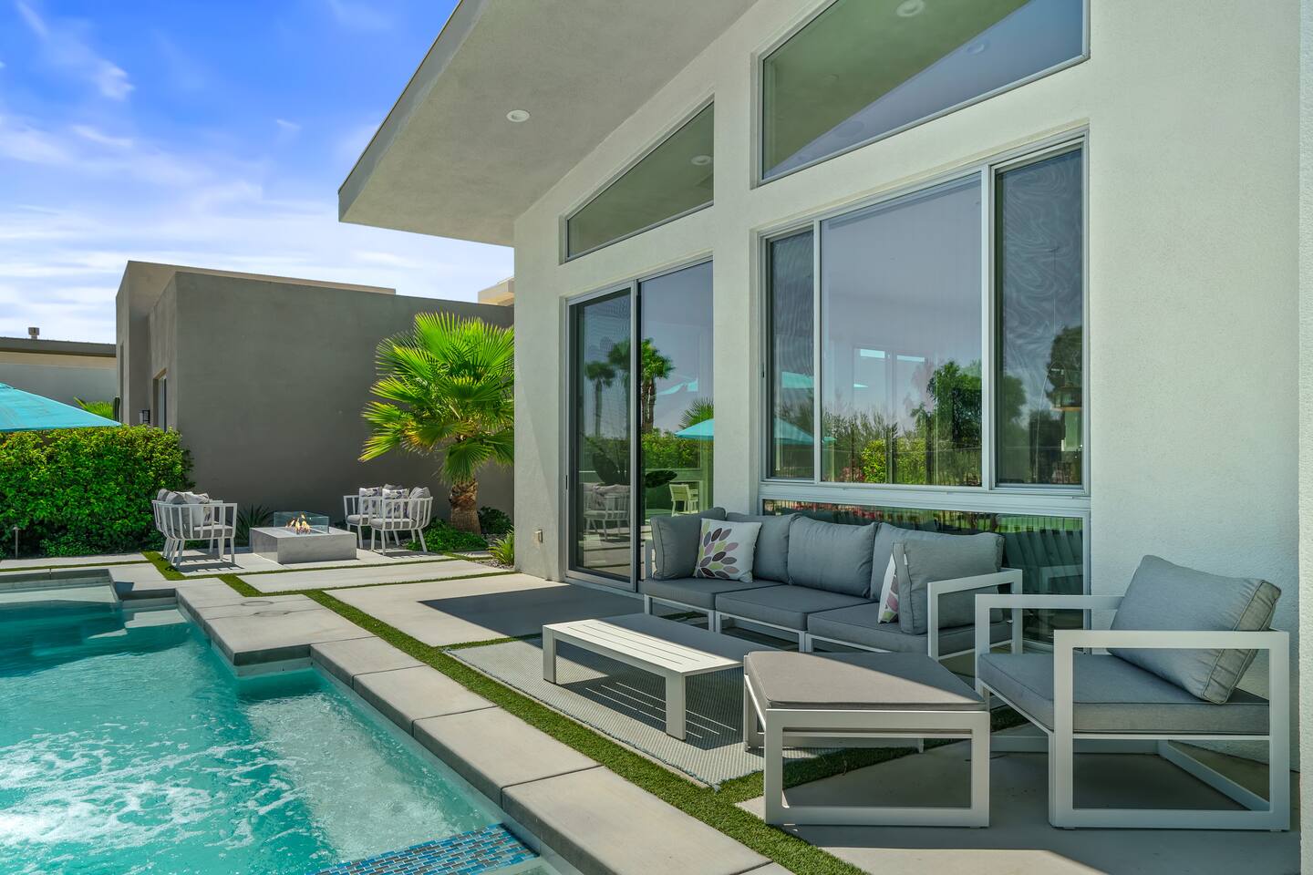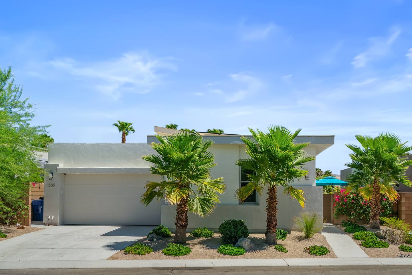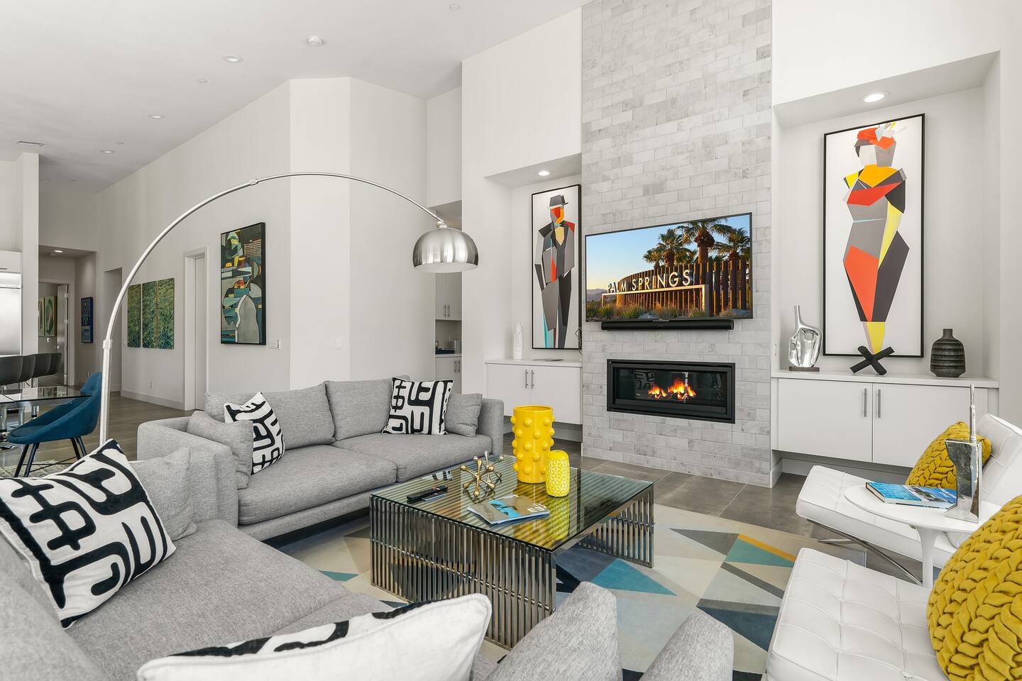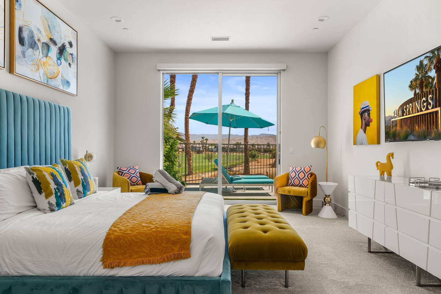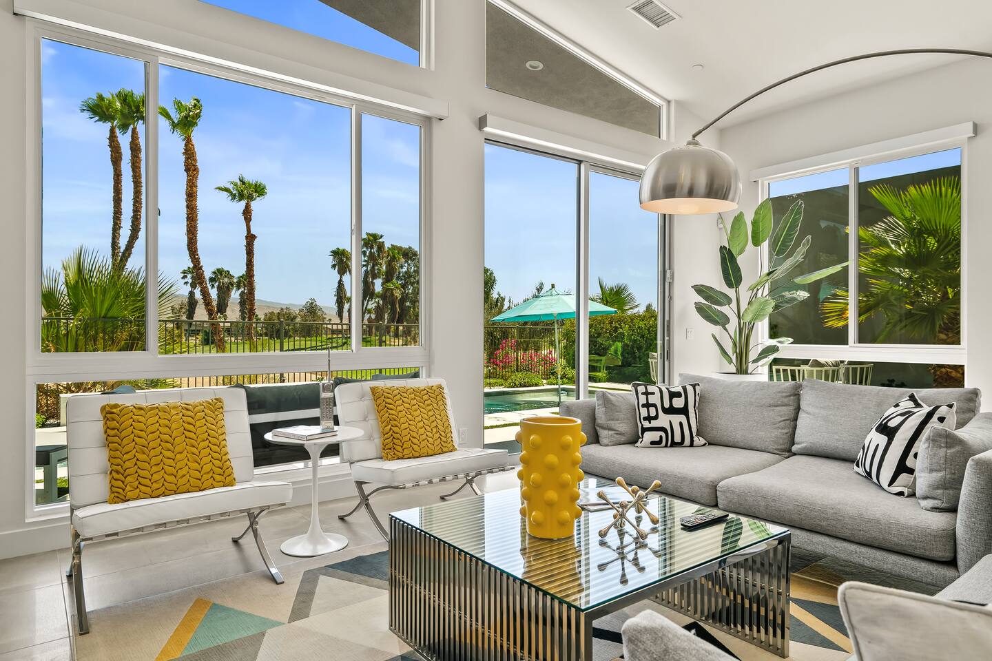Gather around the two comfy, contemporary sofas and over-scaled steel coffee table to watch your favorite shows on the 65in Sony Smart TV equipped with Apple TV and Sonos soundbar. Just push a button to lower or raise the state-of-the-art window shades for the beautiful mountain view to create a delightful evening mood. A fully-equipped chef's kitchen features new stainless steel appliances, plenty of counter space for preparing meals, with seating at the kitchen island for a snack or breakfast. Fire up the Blaze Pro natural gas grill for sunset al fresco dinners with patio dining for 6. If you’re planning on staying a while, take advantage of the huge laundry room with washer/dryer, decorated in Mid Century Modern art. Cozy up in the teal themed master bedroom with a gorgeous velvet king-size bed with Apple TV and Sonos soundbar and bask in luxury in the fabulous free-standing tub in the large ensuite bathroom. The guest room features a navy velvet queen-size bed and sophisticated white and gold glam furnishings along with TV and Sonos soundbar. The 3rd room/den is smartly decorated as additional lounge seating with Smart TV or just lower the Murphy bed to reveal a queen-size bed! A nod to the “Rat Pack” adds a hipster retro feel. Relax by the pool by day in the patio loungers, do a few putts on the putting green, or soak in the hot tub under the stars in beautiful Palm Springs. Bask in contemporary luxury at the Celadon House! Amenities: Accommodations for 6 1 King Bed and 2 Queen beds with plush hotel quality mattresses. 2 En-suite bathroom and 1 full hall bathroom Luxury Brooklinen linens Private heated pool (upon request) Spa (heating included with stay) Pool towels and floatation toys 4 Sun lounges Shade umbrellas 1 Fire pit OutdoorBBQ Wall-mounted TV in the living room Fully equipped kitchen Dining table with seating for 6 Laundry with full-size washer and dryer 2 car garage