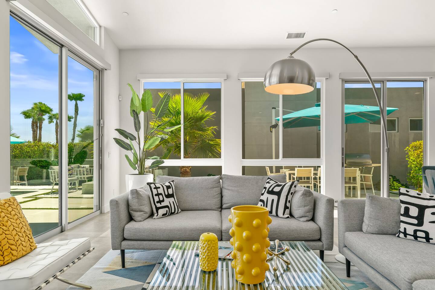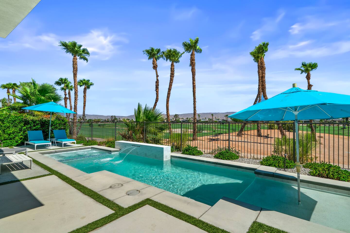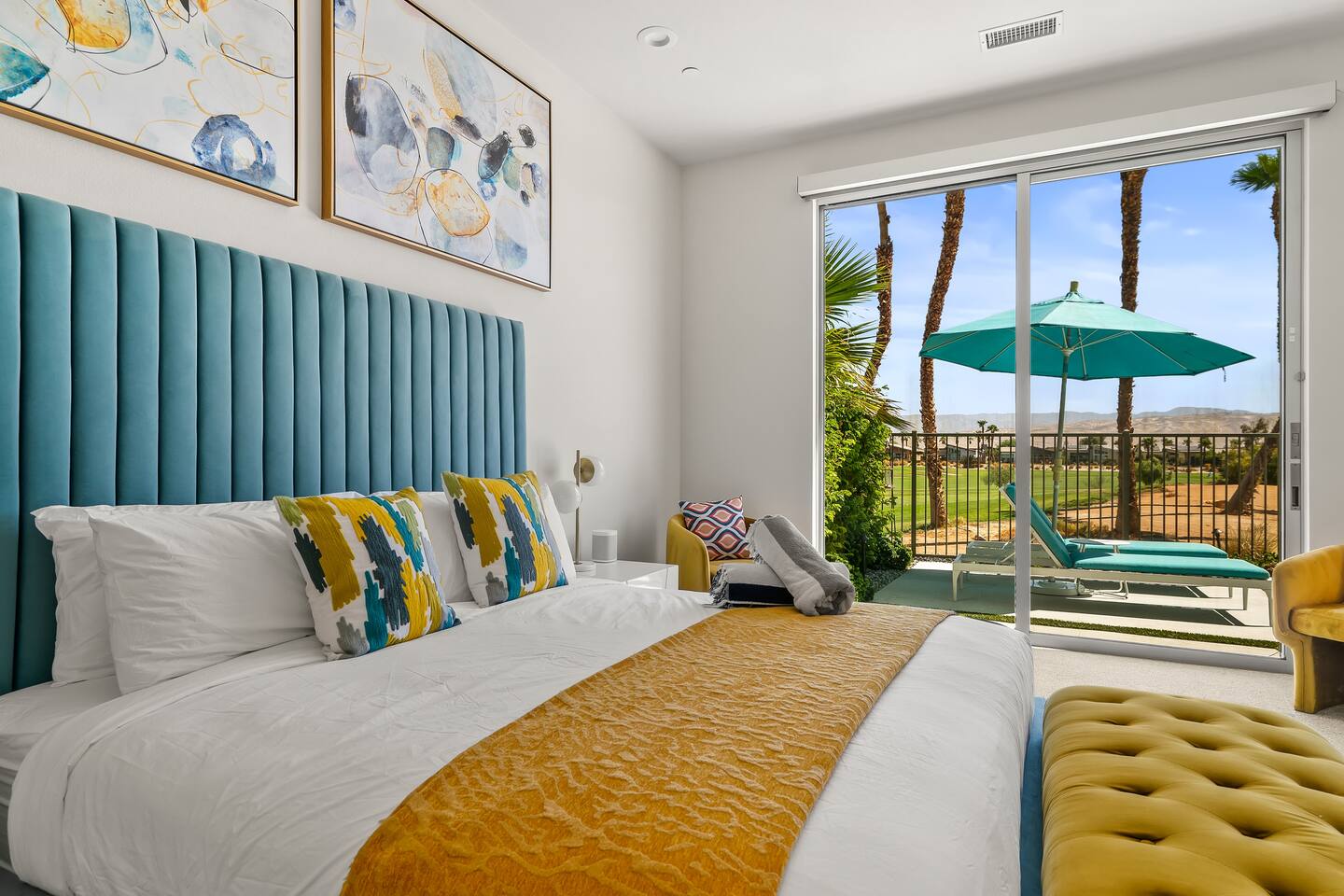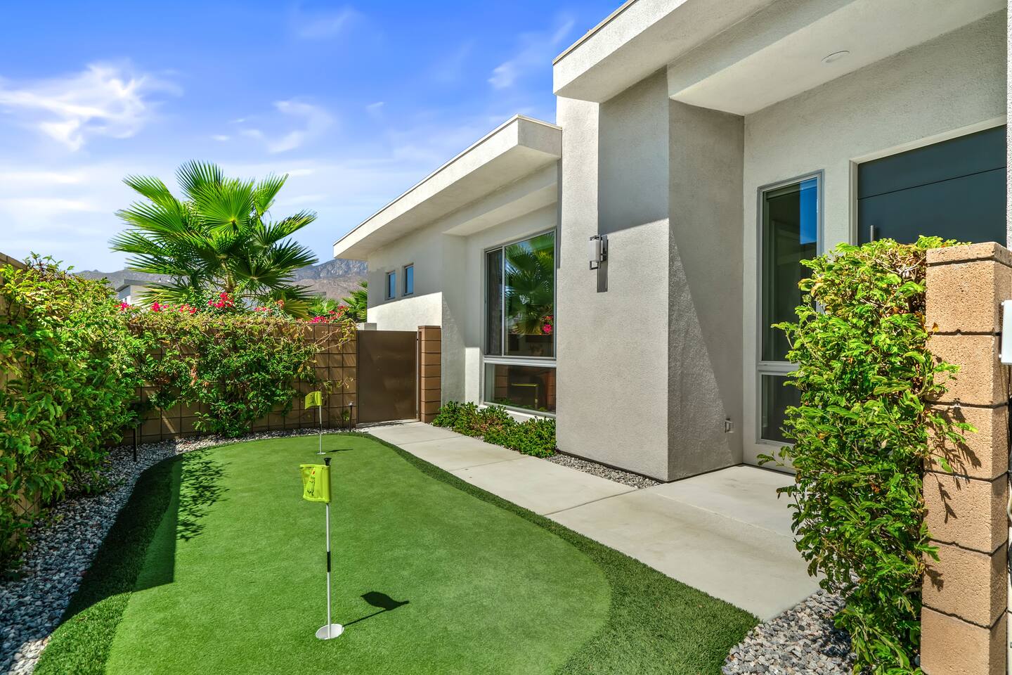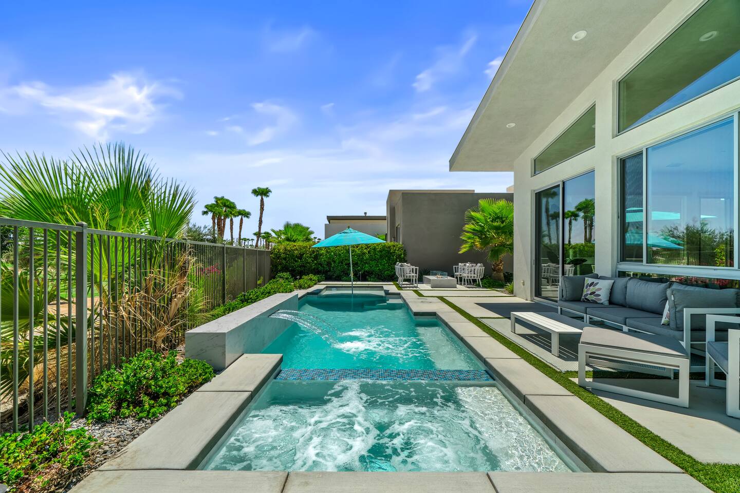 Gather around the two comfy, contemporary sofas and over-scaled steel coffee table to watch your favorite shows on the 65in Sony Smart TV equipped with Apple TV and Sonos soundbar. Just push a button to lower or raise the state-of-the-art window shades for the beautiful mountain view to create a delightful evening mood. A fully-equipped chef's kitchen features new stainless steel appliances, plenty of counter space for preparing meals, with seating at the kitchen island for a snack or breakfast. Fire up the Blaze Pro natural gas grill for sunset al fresco dinners with patio dining for 6. If you’re planning on staying a while, take advantage of the huge laundry room with washer/dryer, decorated in Mid Century Modern art. Cozy up in the teal themed master bedroom with a gorgeous velvet king-size bed with Apple TV and Sonos soundbar and bask in luxury in the fabulous free-standing tub in the large ensuite bathroom. The guest room features a navy velvet queen-size bed and sophisticated white and gold glam furnishings along with TV and Sonos soundbar. The 3rd room/den is smartly decorated as additional lounge seating with Smart TV or just lower the Murphy bed to reveal a queen-size bed! A nod to the “Rat Pack” adds a hipster retro feel. Relax by the pool by day in the patio loungers, do a few putts on the putting green, or soak in the hot tub under the stars in beautiful Palm Springs. Bask in contemporary luxury at the Celadon House! Amenities: Accommodations for 6 1 King Bed and 2 Queen beds with plush hotel quality mattresses. 2 En-suite bathroom and 1 full hall bathroom Luxury Brooklinen linens Private heated pool (upon request) Spa (heating included with stay) Pool towels and floatation toys 4 Sun lounges Shade umbrellas 1 Fire pit OutdoorBBQ Wall-mounted TV in the living room Fully equipped kitchen Dining table with seating for 6 Laundry with full-size washer and dryer 2 car garage