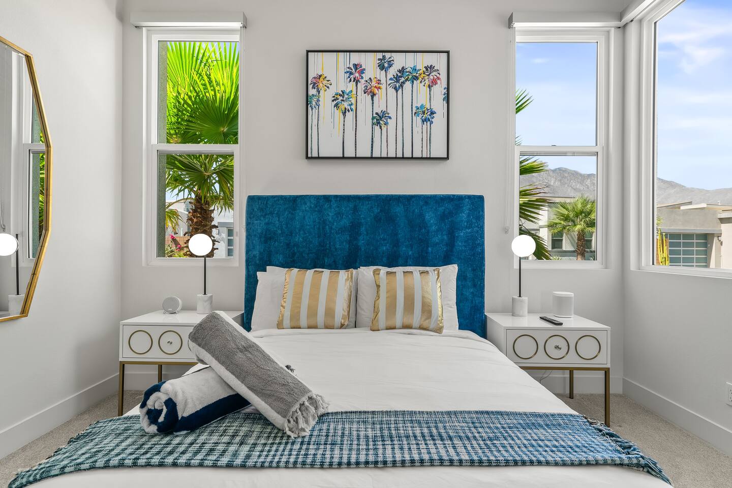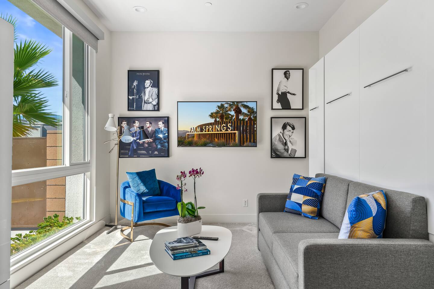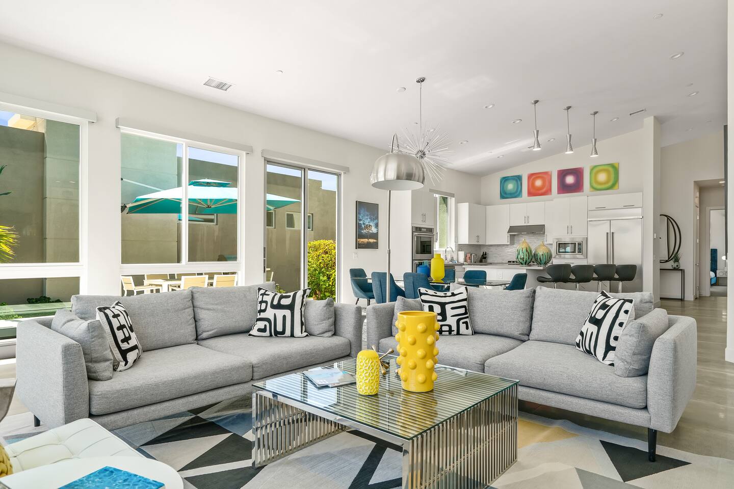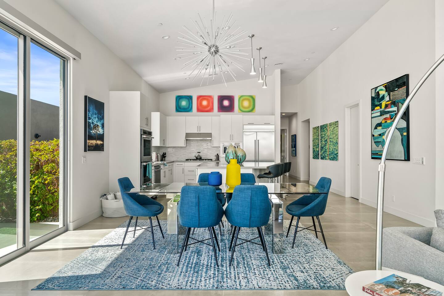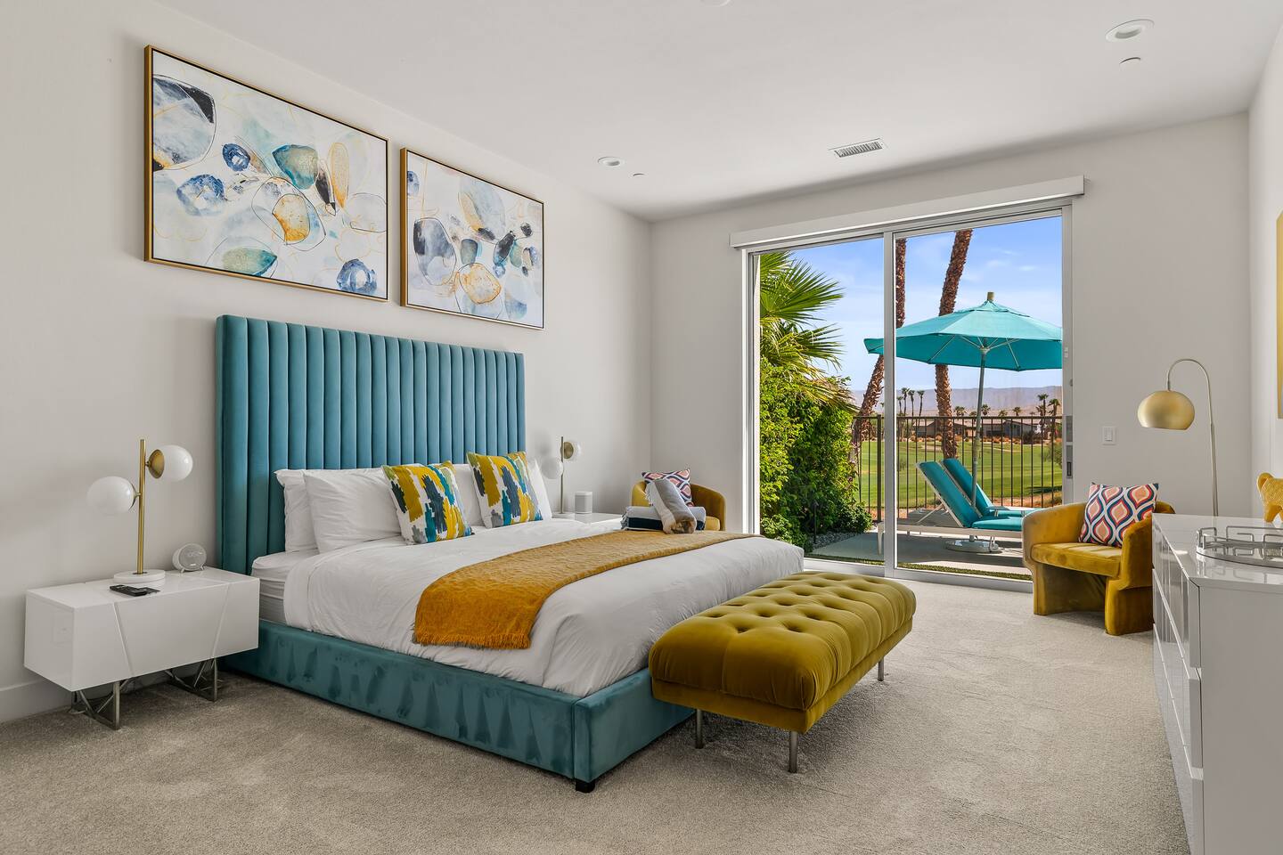 Gather around the two comfy, contemporary sofas and over-scaled steel coffee table to watch your favorite shows on the 65in Sony Smart TV equipped with Apple TV and Sonos soundbar. Just push a button to lower or raise the state-of-the-art window shades for the beautiful mountain view to create a delightful evening mood. A fully-equipped chef's kitchen features new stainless steel appliances, plenty of counter space for preparing meals, with seating at the kitchen island for a snack or breakfast. Fire up the Blaze Pro natural gas grill for sunset al fresco dinners with patio dining for 6. If you’re planning on staying a while, take advantage of the huge laundry room with washer/dryer, decorated in Mid Century Modern art. Cozy up in the teal themed master bedroom with a gorgeous velvet king-size bed with Apple TV and Sonos soundbar and bask in luxury in the fabulous free-standing tub in the large ensuite bathroom. The guest room features a navy velvet queen-size bed and sophisticated white and gold glam furnishings along with TV and Sonos soundbar. The 3rd room/den is smartly decorated as additional lounge seating with Smart TV or just lower the Murphy bed to reveal a queen-size bed! A nod to the “Rat Pack” adds a hipster retro feel. Relax by the pool by day in the patio loungers, do a few putts on the putting green, or soak in the hot tub under the stars in beautiful Palm Springs. Bask in contemporary luxury at the Celadon House! Amenities: Accommodations for 6 1 King Bed and 2 Queen beds with plush hotel quality mattresses. 2 En-suite bathroom and 1 full hall bathroom Luxury Brooklinen linens Private heated pool (upon request) Spa (heating included with stay) Pool towels and floatation toys 4 Sun lounges Shade umbrellas 1 Fire pit OutdoorBBQ Wall-mounted TV in the living room Fully equipped kitchen Dining table with seating for 6 Laundry with full-size washer and dryer 2 car garage