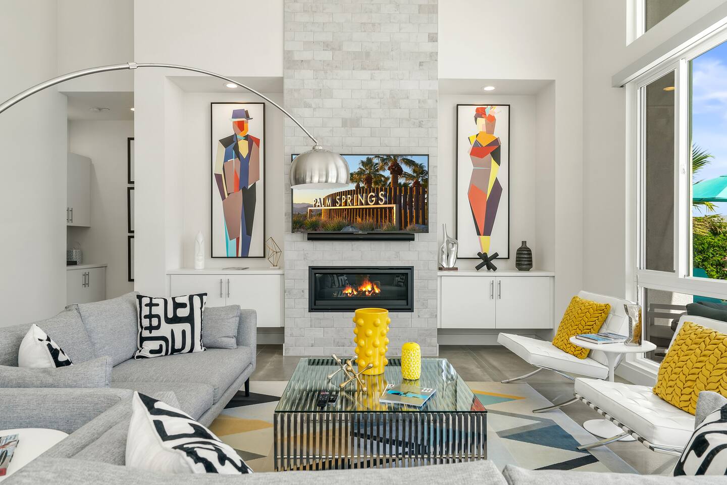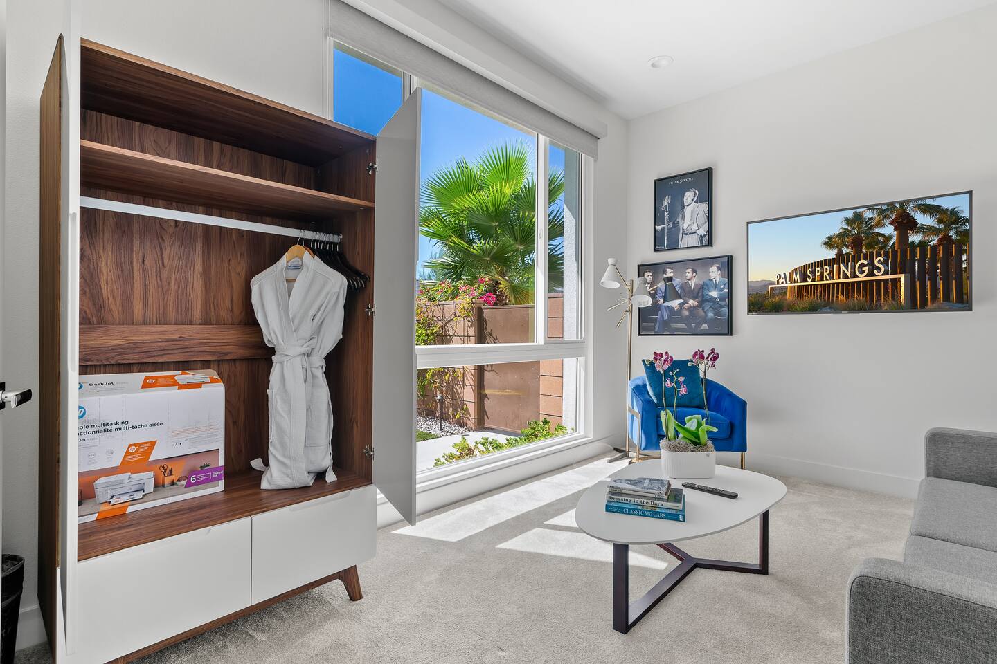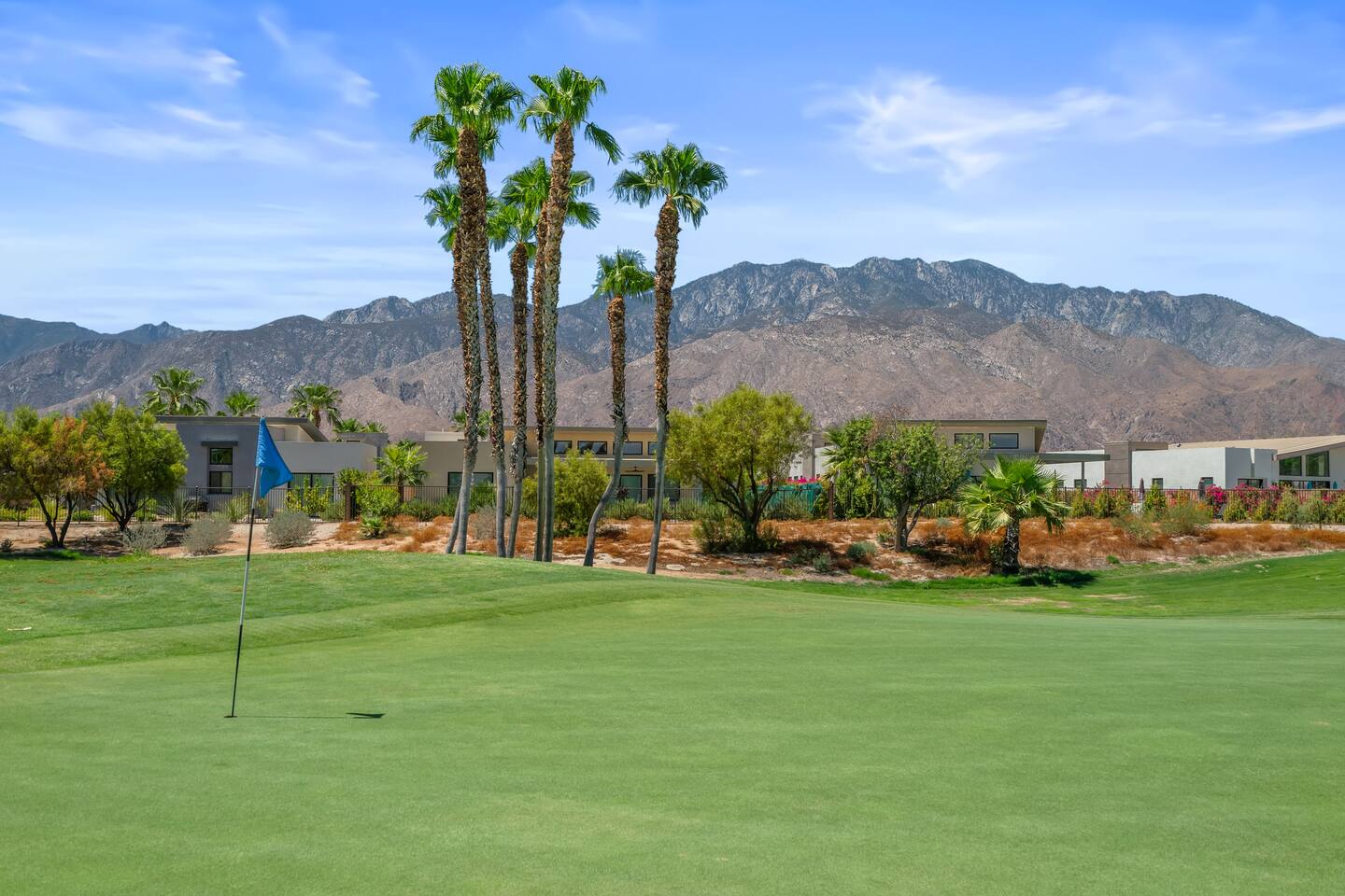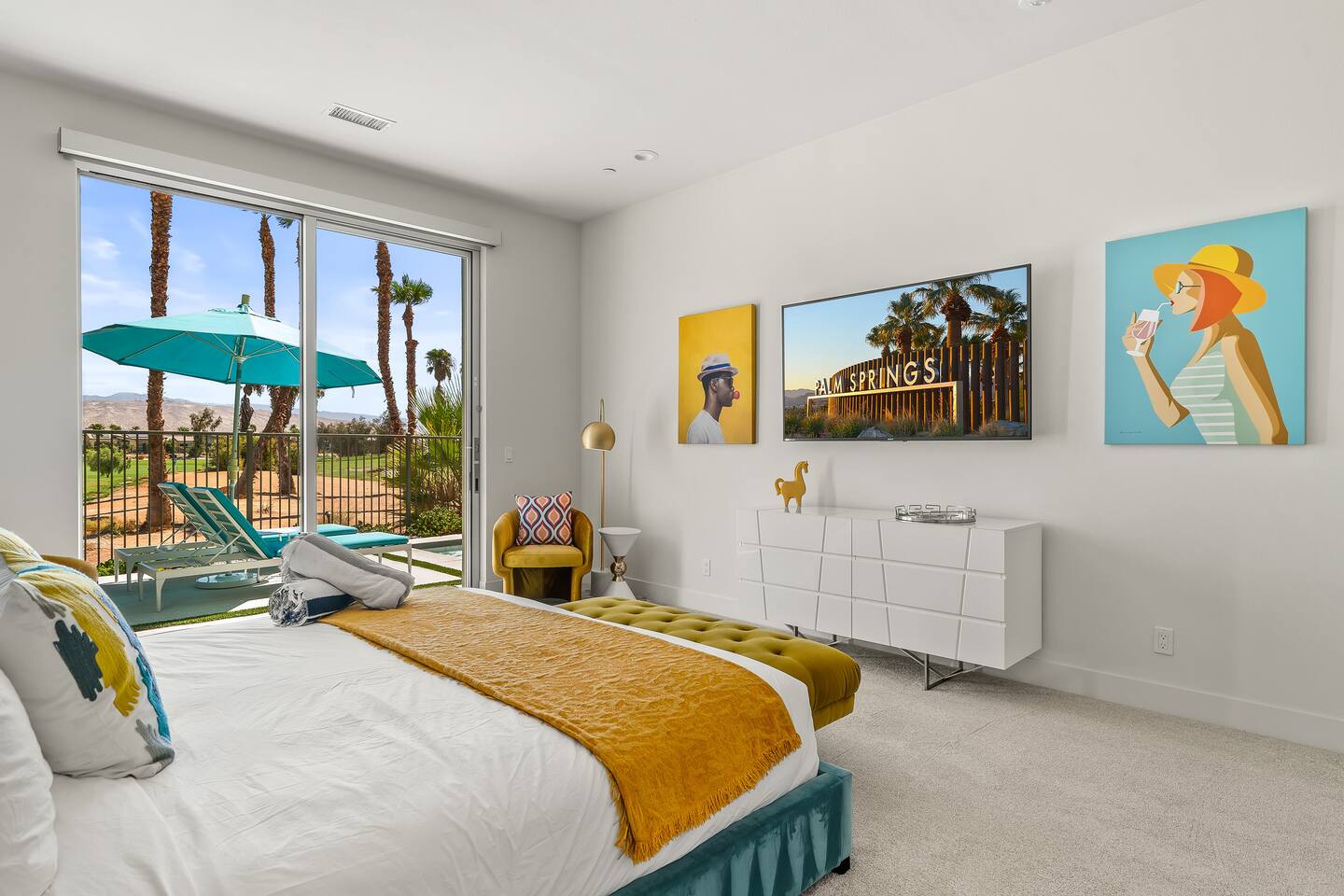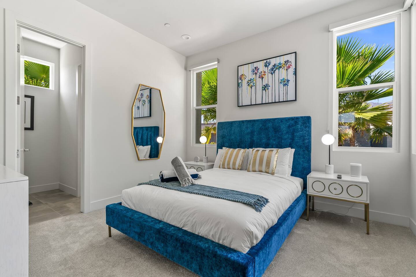 Gather around the two comfy, contemporary sofas and over-scaled steel coffee table to watch your favorite shows on the 65in Sony Smart TV equipped with Apple TV and Sonos soundbar. Just push a button to lower or raise the state-of-the-art window shades for the beautiful mountain view to create a delightful evening mood. A fully-equipped chef's kitchen features new stainless steel appliances, plenty of counter space for preparing meals, with seating at the kitchen island for a snack or breakfast. Fire up the Blaze Pro natural gas grill for sunset al fresco dinners with patio dining for 6. If you’re planning on staying a while, take advantage of the huge laundry room with washer/dryer, decorated in Mid Century Modern art. Cozy up in the teal themed master bedroom with a gorgeous velvet king-size bed with Apple TV and Sonos soundbar and bask in luxury in the fabulous free-standing tub in the large ensuite bathroom. The guest room features a navy velvet queen-size bed and sophisticated white and gold glam furnishings along with TV and Sonos soundbar. The 3rd room/den is smartly decorated as additional lounge seating with Smart TV or just lower the Murphy bed to reveal a queen-size bed! A nod to the “Rat Pack” adds a hipster retro feel. Relax by the pool by day in the patio loungers, do a few putts on the putting green, or soak in the hot tub under the stars in beautiful Palm Springs. Bask in contemporary luxury at the Celadon House! Amenities: Accommodations for 6 1 King Bed and 2 Queen beds with plush hotel quality mattresses. 2 En-suite bathroom and 1 full hall bathroom Luxury Brooklinen linens Private heated pool (upon request) Spa (heating included with stay) Pool towels and floatation toys 4 Sun lounges Shade umbrellas 1 Fire pit OutdoorBBQ Wall-mounted TV in the living room Fully equipped kitchen Dining table with seating for 6 Laundry with full-size washer and dryer 2 car garage