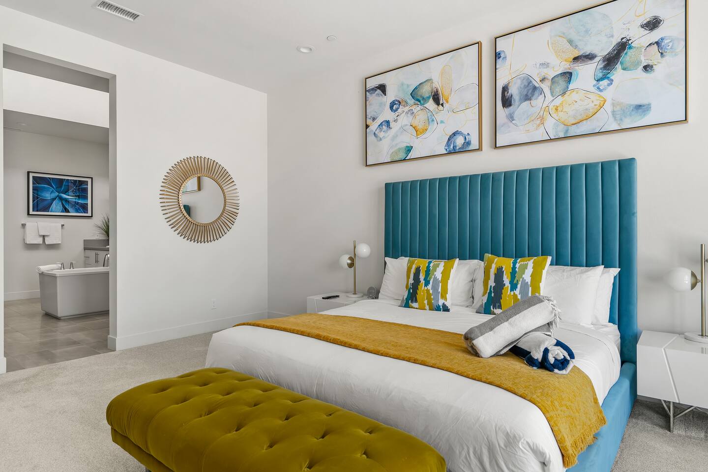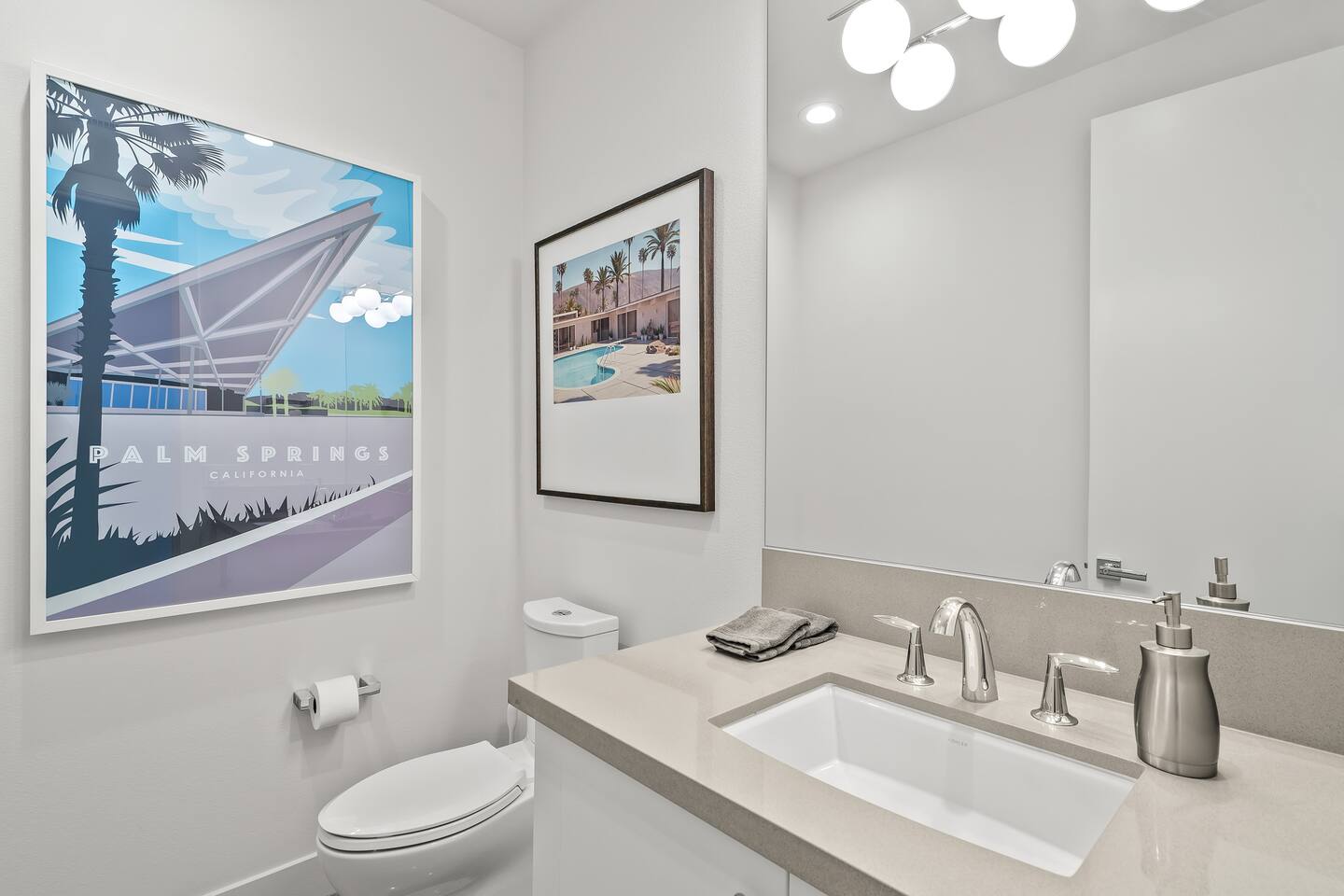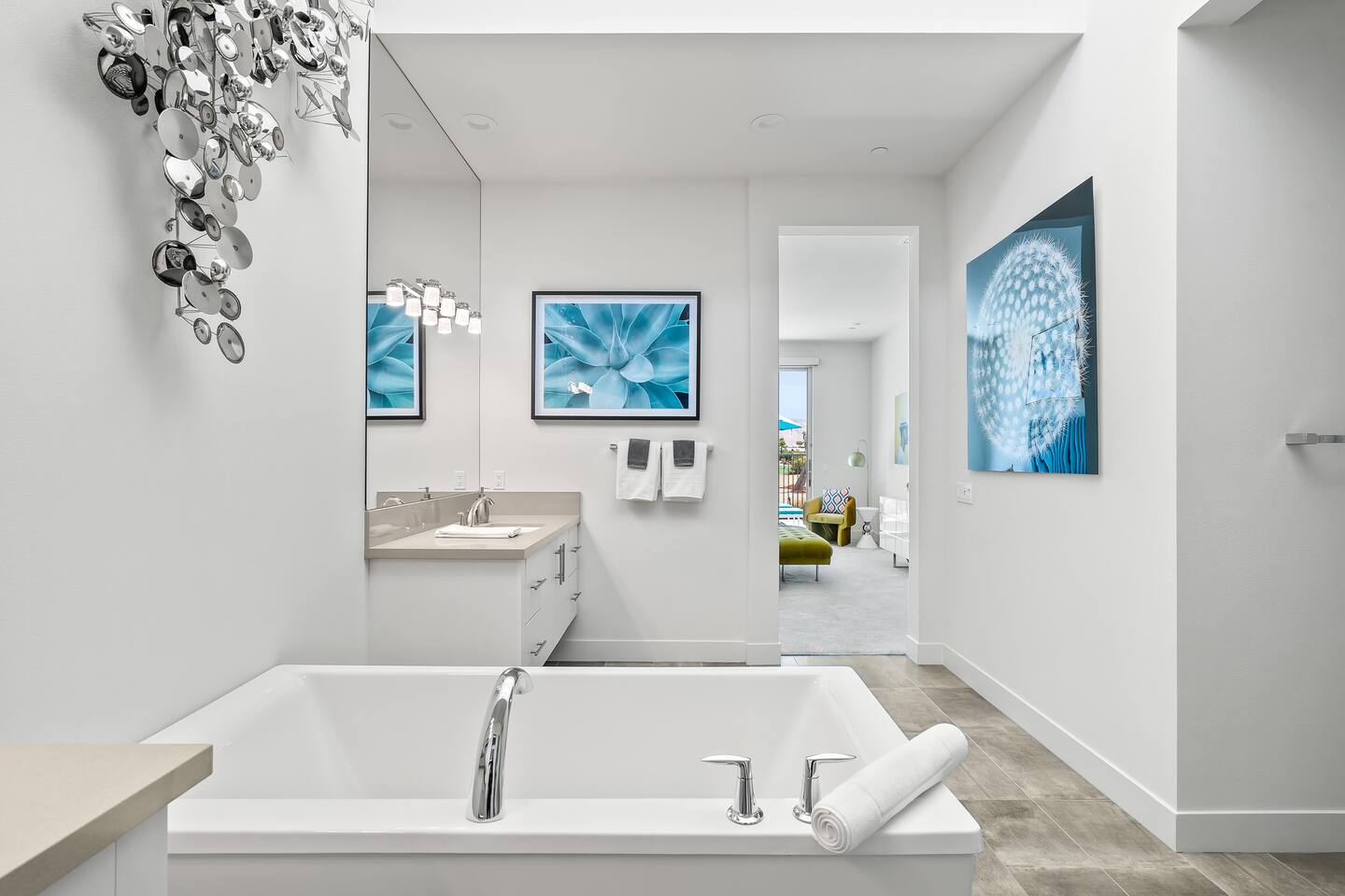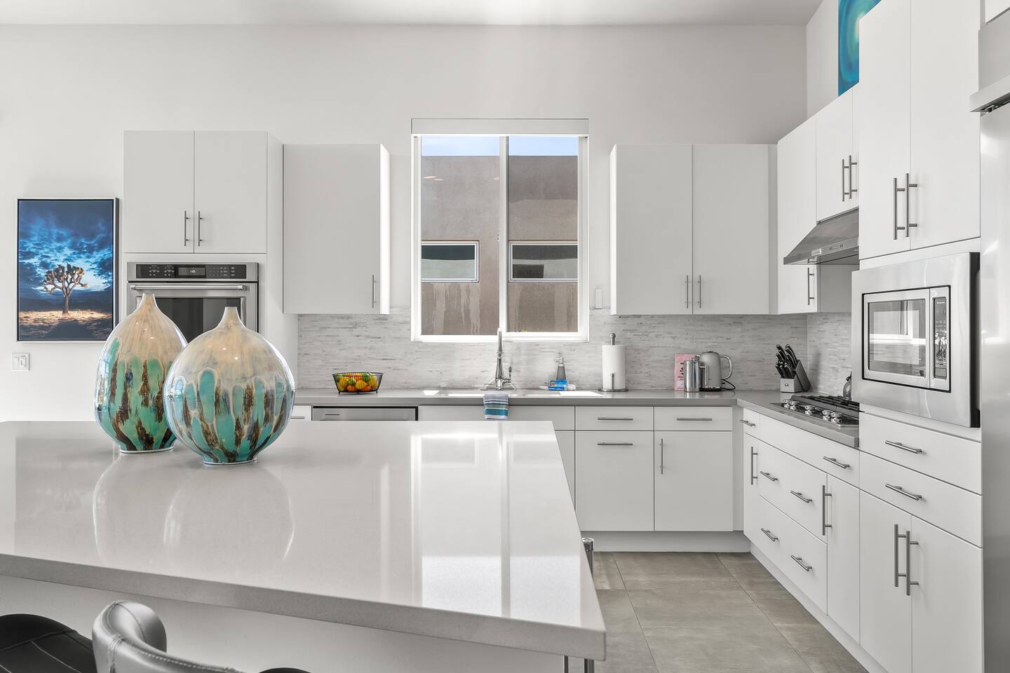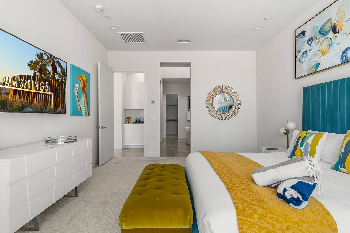 Gather around the two comfy, contemporary sofas and over-scaled steel coffee table to watch your favorite shows on the 65in Sony Smart TV equipped with Apple TV and Sonos soundbar. Just push a button to lower or raise the state-of-the-art window shades for the beautiful mountain view to create a delightful evening mood. A fully-equipped chef's kitchen features new stainless steel appliances, plenty of counter space for preparing meals, with seating at the kitchen island for a snack or breakfast. Fire up the Blaze Pro natural gas grill for sunset al fresco dinners with patio dining for 6. If you’re planning on staying a while, take advantage of the huge laundry room with washer/dryer, decorated in Mid Century Modern art. Cozy up in the teal themed master bedroom with a gorgeous velvet king-size bed with Apple TV and Sonos soundbar and bask in luxury in the fabulous free-standing tub in the large ensuite bathroom. The guest room features a navy velvet queen-size bed and sophisticated white and gold glam furnishings along with TV and Sonos soundbar. The 3rd room/den is smartly decorated as additional lounge seating with Smart TV or just lower the Murphy bed to reveal a queen-size bed! A nod to the “Rat Pack” adds a hipster retro feel. Relax by the pool by day in the patio loungers, do a few putts on the putting green, or soak in the hot tub under the stars in beautiful Palm Springs. Bask in contemporary luxury at the Celadon House! Amenities: Accommodations for 6 1 King Bed and 2 Queen beds with plush hotel quality mattresses. 2 En-suite bathroom and 1 full hall bathroom Luxury Brooklinen linens Private heated pool (upon request) Spa (heating included with stay) Pool towels and floatation toys 4 Sun lounges Shade umbrellas 1 Fire pit OutdoorBBQ Wall-mounted TV in the living room Fully equipped kitchen Dining table with seating for 6 Laundry with full-size washer and dryer 2 car garage