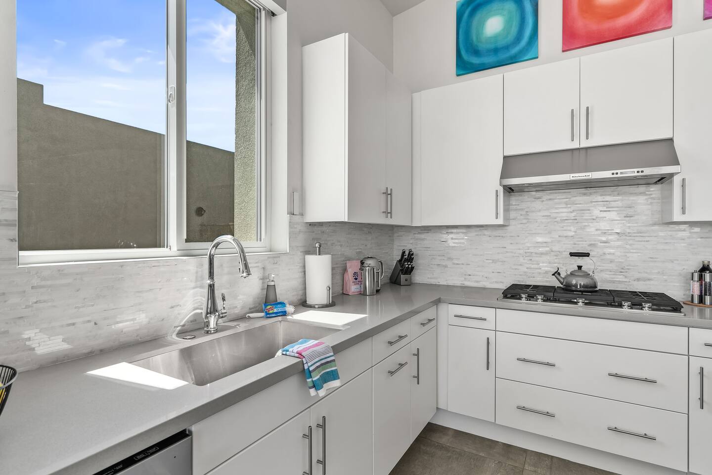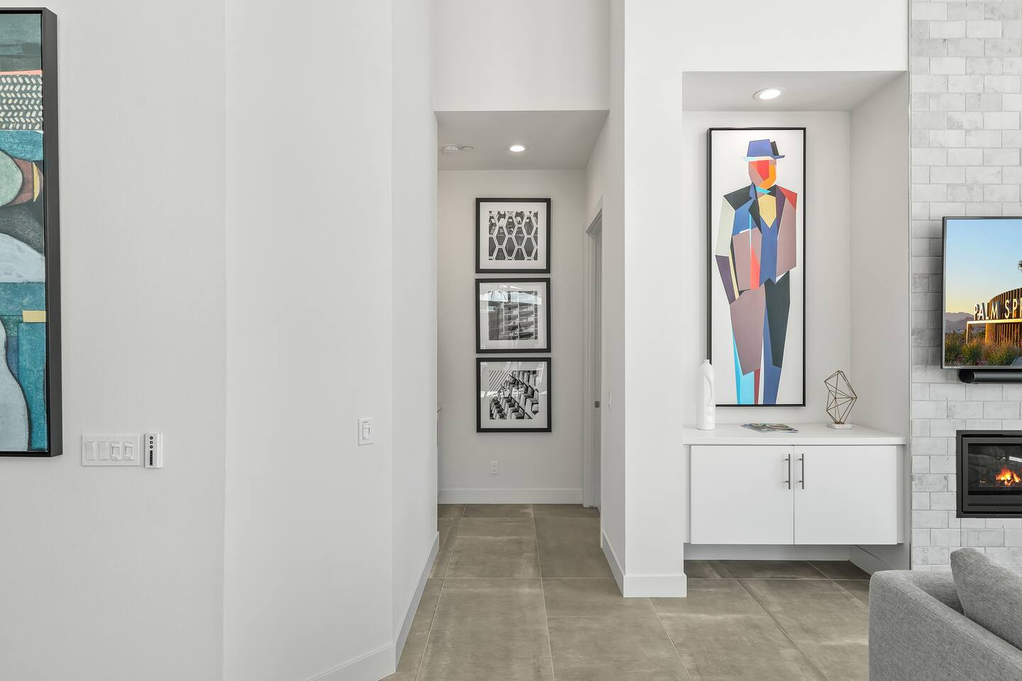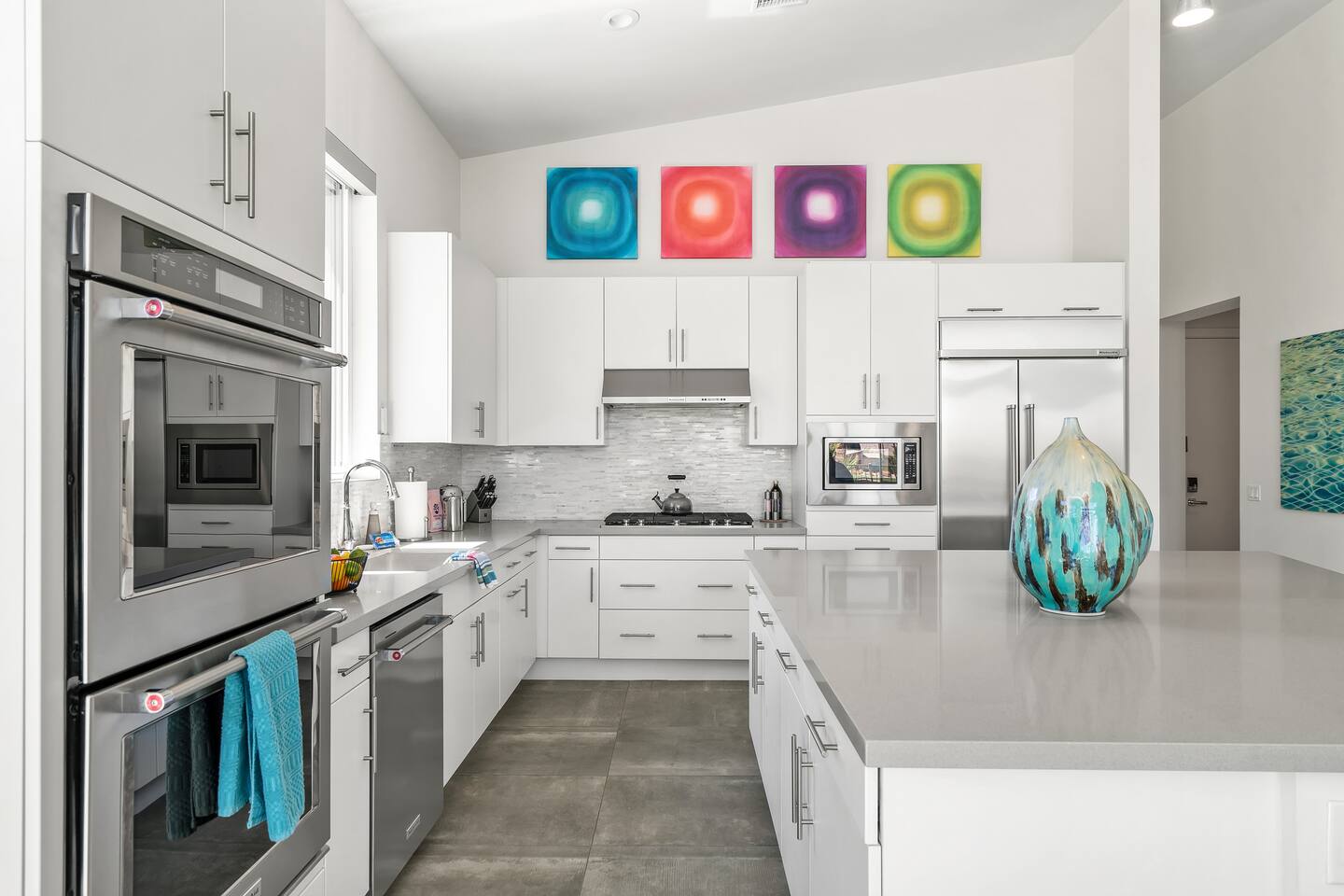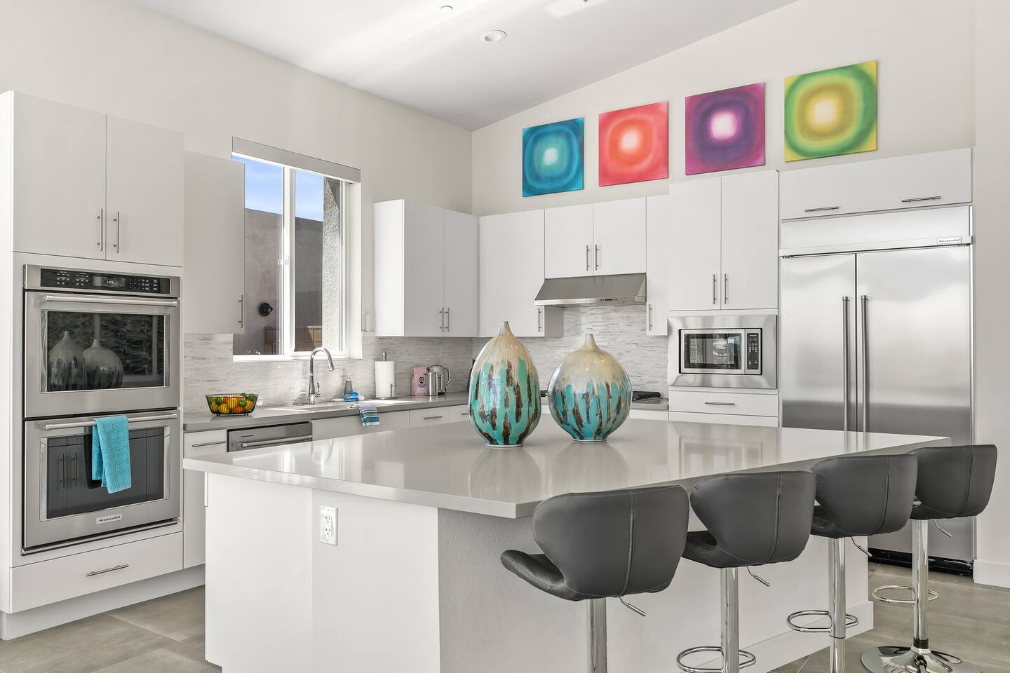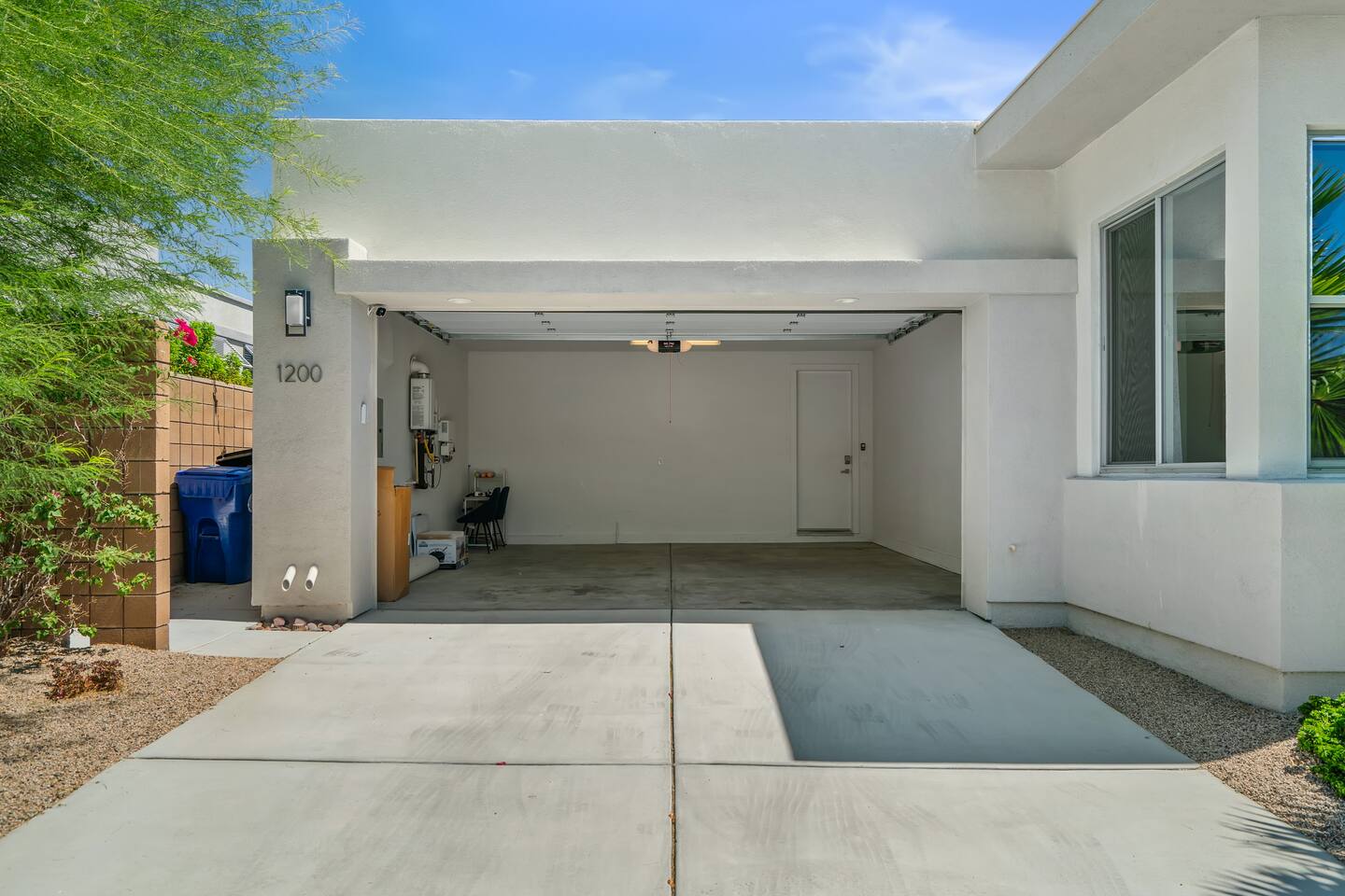 Gather around the two comfy, contemporary sofas and over-scaled steel coffee table to watch your favorite shows on the 65in Sony Smart TV equipped with Apple TV and Sonos soundbar. Just push a button to lower or raise the state-of-the-art window shades for the beautiful mountain view to create a delightful evening mood. A fully-equipped chef's kitchen features new stainless steel appliances, plenty of counter space for preparing meals, with seating at the kitchen island for a snack or breakfast. Fire up the Blaze Pro natural gas grill for sunset al fresco dinners with patio dining for 6. If you’re planning on staying a while, take advantage of the huge laundry room with washer/dryer, decorated in Mid Century Modern art. Cozy up in the teal themed master bedroom with a gorgeous velvet king-size bed with Apple TV and Sonos soundbar and bask in luxury in the fabulous free-standing tub in the large ensuite bathroom. The guest room features a navy velvet queen-size bed and sophisticated white and gold glam furnishings along with TV and Sonos soundbar. The 3rd room/den is smartly decorated as additional lounge seating with Smart TV or just lower the Murphy bed to reveal a queen-size bed! A nod to the “Rat Pack” adds a hipster retro feel. Relax by the pool by day in the patio loungers, do a few putts on the putting green, or soak in the hot tub under the stars in beautiful Palm Springs. Bask in contemporary luxury at the Celadon House! Amenities: Accommodations for 6 1 King Bed and 2 Queen beds with plush hotel quality mattresses. 2 En-suite bathroom and 1 full hall bathroom Luxury Brooklinen linens Private heated pool (upon request) Spa (heating included with stay) Pool towels and floatation toys 4 Sun lounges Shade umbrellas 1 Fire pit OutdoorBBQ Wall-mounted TV in the living room Fully equipped kitchen Dining table with seating for 6 Laundry with full-size washer and dryer 2 car garage
