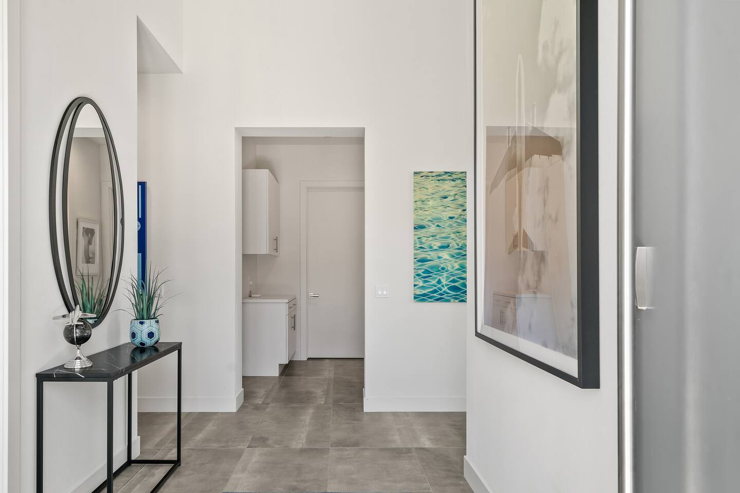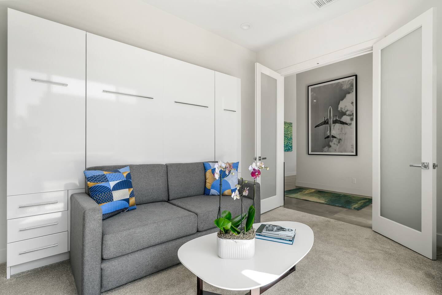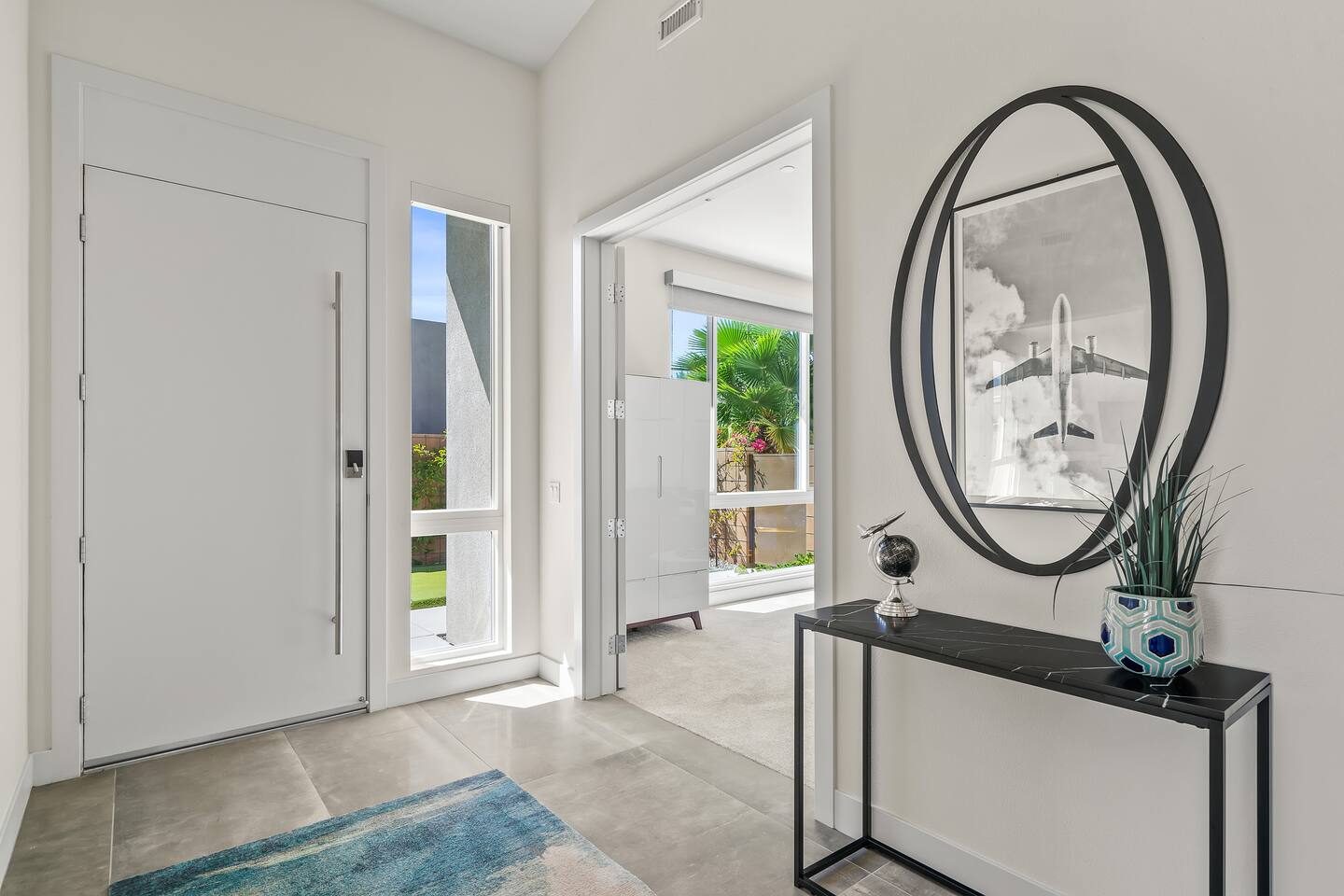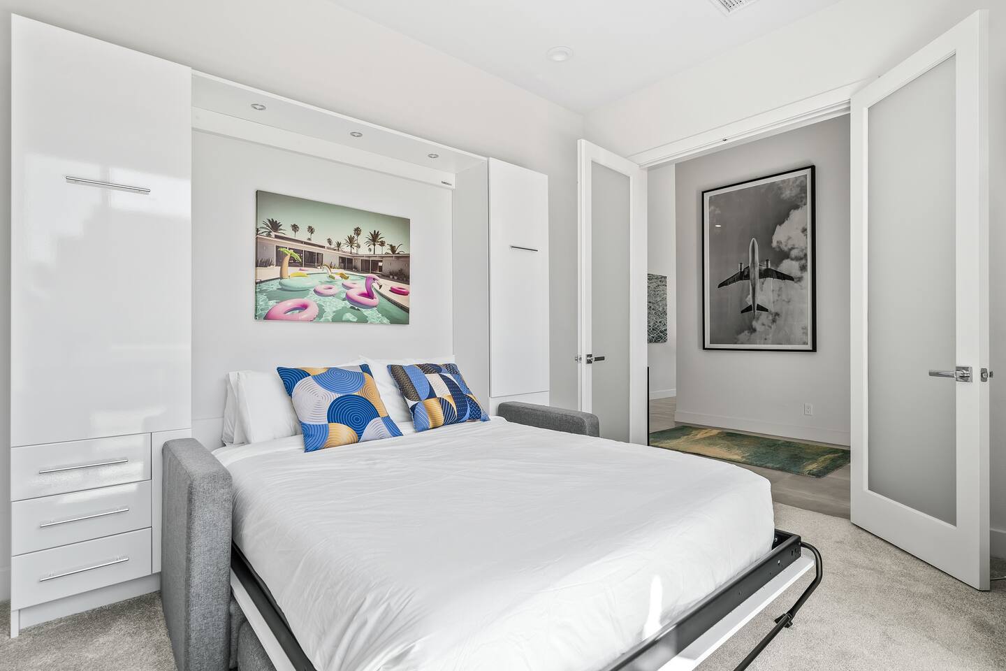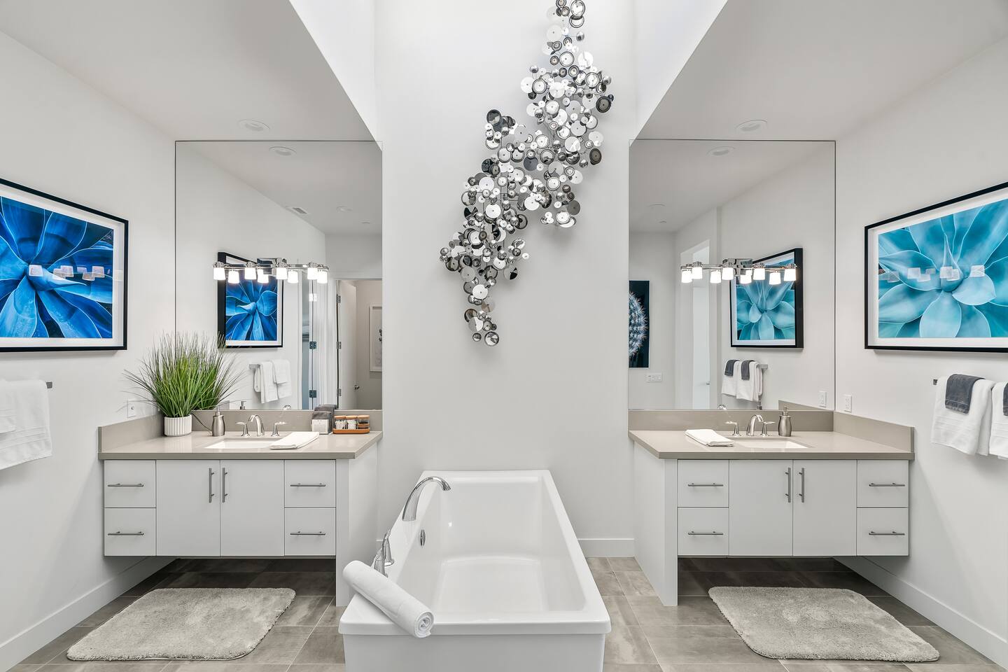 Gather around the two comfy, contemporary sofas and over-scaled steel coffee table to watch your favorite shows on the 65in Sony Smart TV equipped with Apple TV and Sonos soundbar. Just push a button to lower or raise the state-of-the-art window shades for the beautiful mountain view to create a delightful evening mood. A fully-equipped chef's kitchen features new stainless steel appliances, plenty of counter space for preparing meals, with seating at the kitchen island for a snack or breakfast. Fire up the Blaze Pro natural gas grill for sunset al fresco dinners with patio dining for 6. If you’re planning on staying a while, take advantage of the huge laundry room with washer/dryer, decorated in Mid Century Modern art. Cozy up in the teal themed master bedroom with a gorgeous velvet king-size bed with Apple TV and Sonos soundbar and bask in luxury in the fabulous free-standing tub in the large ensuite bathroom. The guest room features a navy velvet queen-size bed and sophisticated white and gold glam furnishings along with TV and Sonos soundbar. The 3rd room/den is smartly decorated as additional lounge seating with Smart TV or just lower the Murphy bed to reveal a queen-size bed! A nod to the “Rat Pack” adds a hipster retro feel. Relax by the pool by day in the patio loungers, do a few putts on the putting green, or soak in the hot tub under the stars in beautiful Palm Springs. Bask in contemporary luxury at the Celadon House! Amenities: Accommodations for 6 1 King Bed and 2 Queen beds with plush hotel quality mattresses. 2 En-suite bathroom and 1 full hall bathroom Luxury Brooklinen linens Private heated pool (upon request) Spa (heating included with stay) Pool towels and floatation toys 4 Sun lounges Shade umbrellas 1 Fire pit OutdoorBBQ Wall-mounted TV in the living room Fully equipped kitchen Dining table with seating for 6 Laundry with full-size washer and dryer 2 car garage