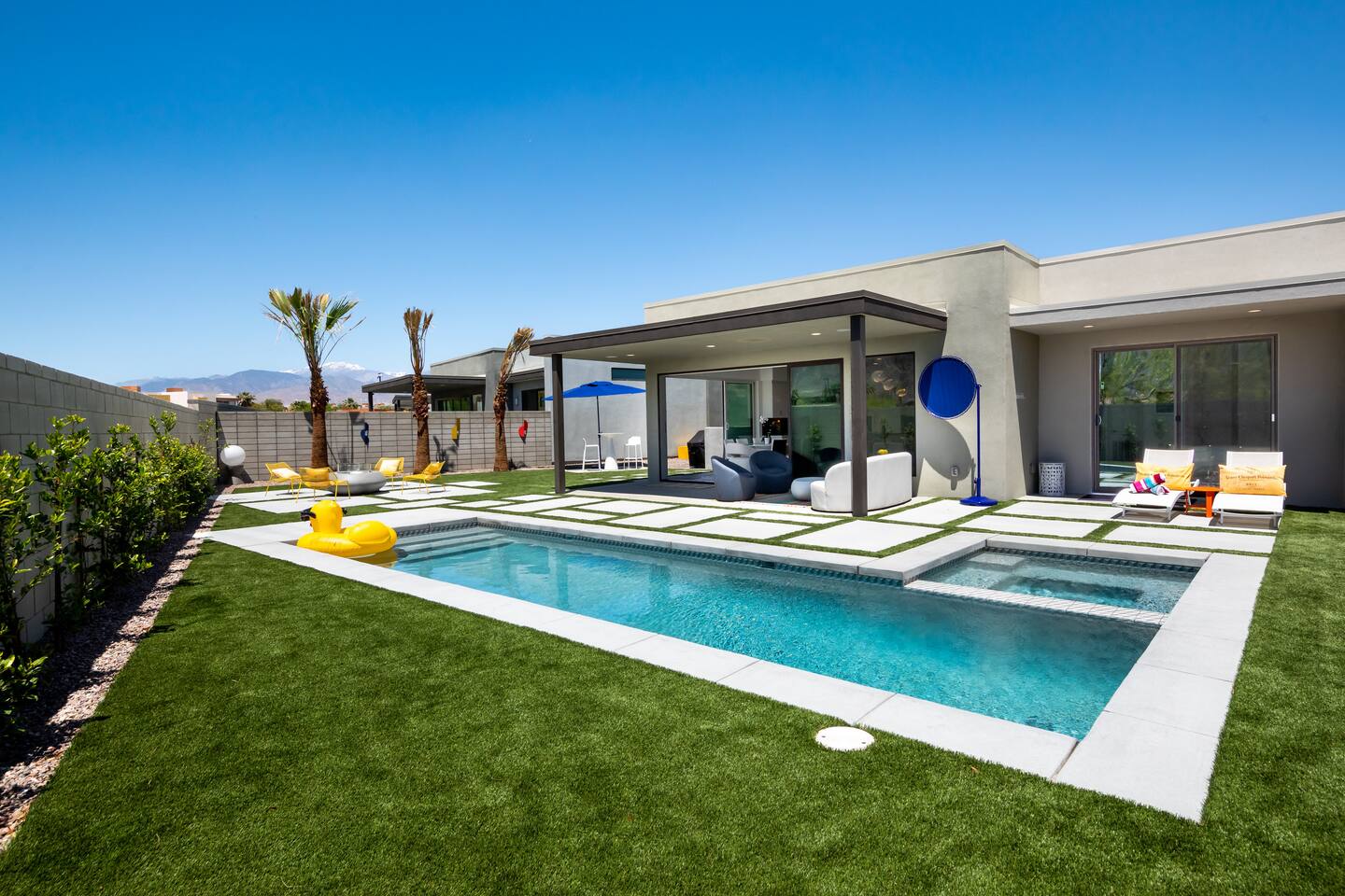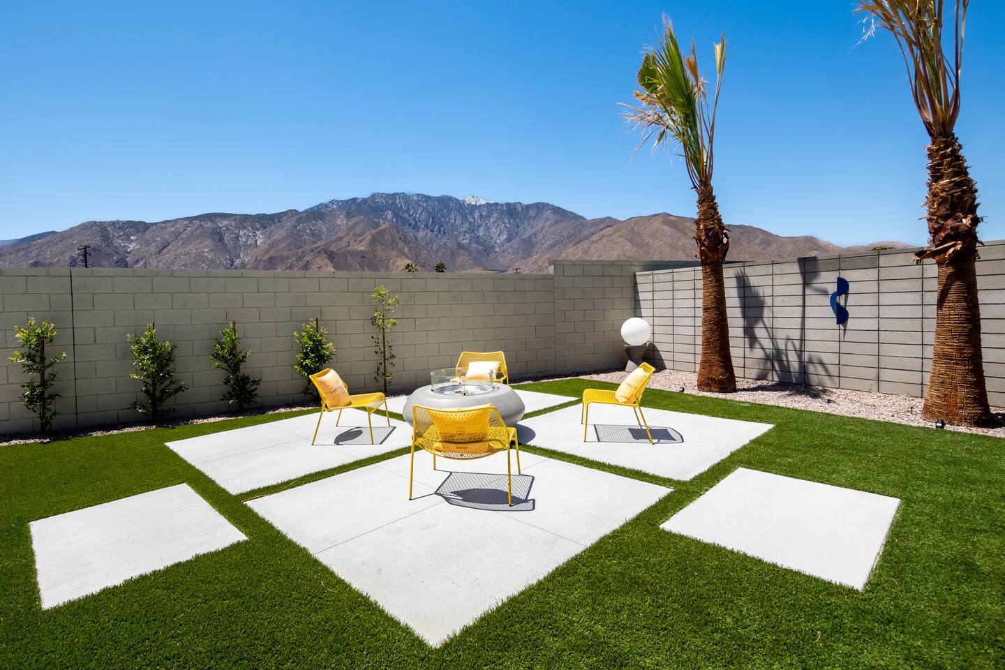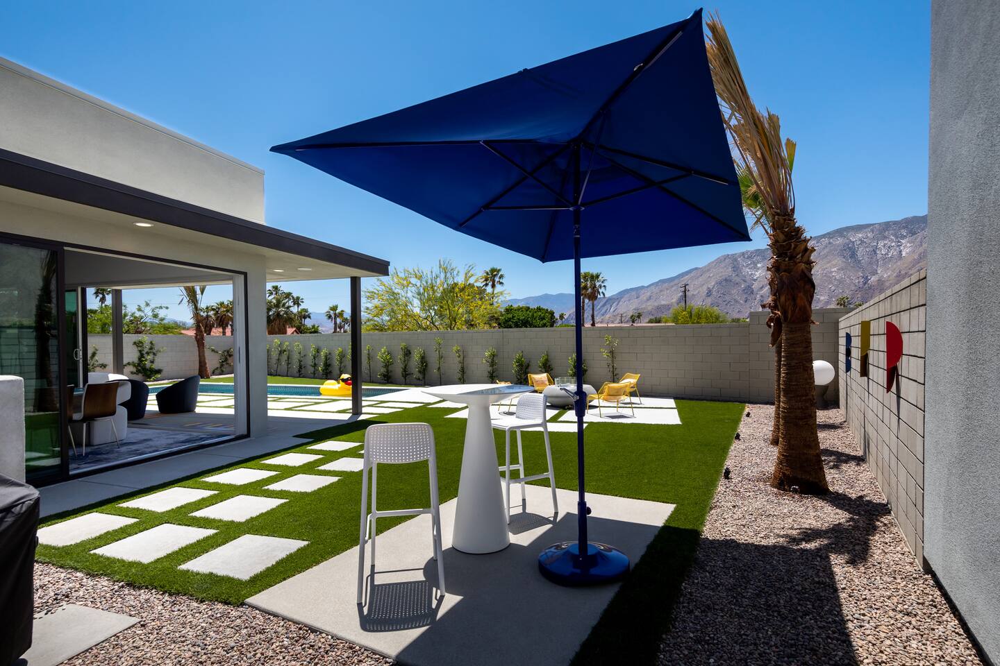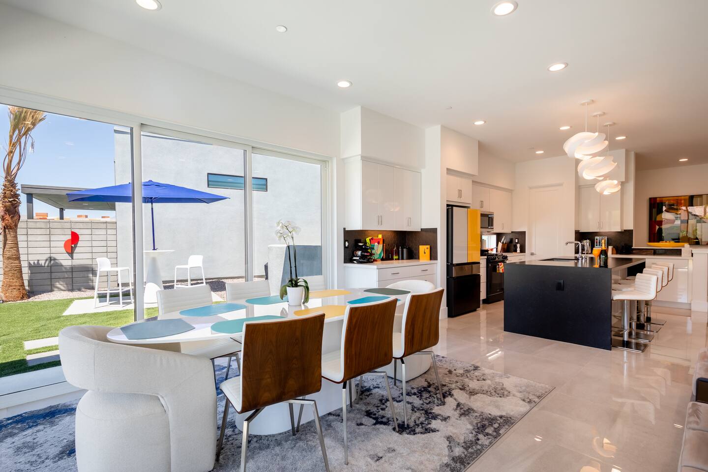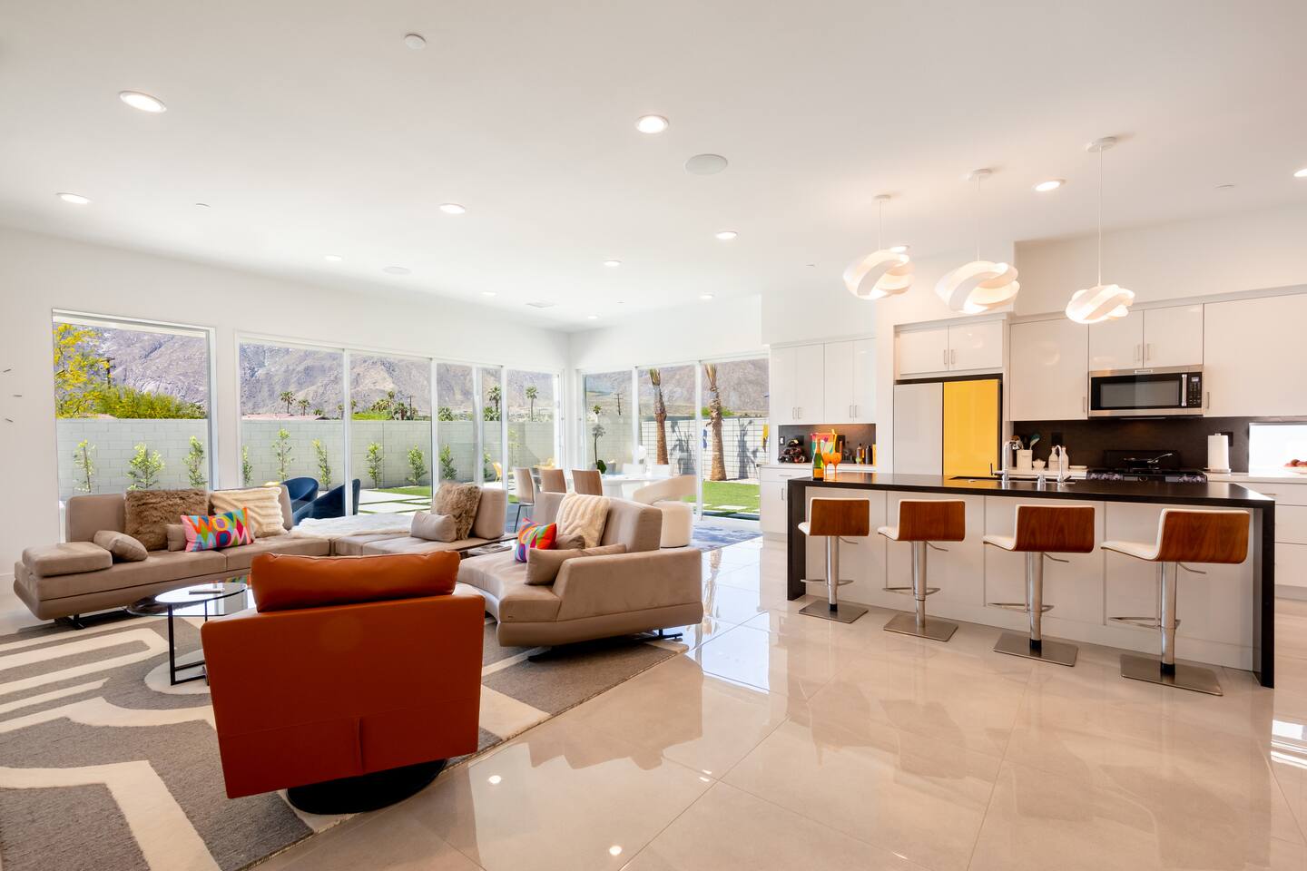 A day in the life: Imagine waking up in the desert in a white modern high ceiling gallery, full of natural light through huge sliders. Grab a cup of coffee and sit on the bouclé outdoor sofa by the 30 foot pool (one of the largest in our community!) and hot tub and stare at the best view of Mount San Jacinto in Palm Springs. Totally private. All yours. Once caffeinated, you can choose to kickstart your day with a walk through acres of olive groves, a lululemon studio yoga class in the front bedroom, a workout with provided kettlebells in the compound, a trip to the complex’s super modern gym and/or yoga studio, a lap swim, or a long soak in the hot tub with a view of the tram at the top of San Jacinto. Breakfast at the dining table provides a full indoor/outdoor lifestyle with an incredible view of the mountains while you plan your day. Work at one of two electric sit/stand desks (one with a 49 inch curved monitor like nothing you’ve ever seen), or vacation by taking a tram trip up the mountains for a hot chocolate at the peak! Go out in Palm Springs for the huge variety of fun places, great restaurants (Sherman’s Bakery! Sandfish Sushi! Clandestino!), incredible bars and social scene! Try a drag brunch at the Saguaro. Thursday nights downtown Palm Springs shuts down for a street fair full of local artists and chefs – easy parking, easy walking, easy fun. Shop for art on El Paseo for first Fridays (free champagne!). Friday and Saturday nights before heading out stop by the community complex, where a private bar serves the most delicious drinks and great company! When you’re done with any outing, return to a serene gated community to relax in front of one of four art tvs (85 inch in the living room, 75 inch in the primary suite) or a late night swim with a yard that is fully illuminated with its own palm trees and gas fire pit. Play a game of pool or ping pong on the brand new outdoor pool table! This home was completed in December 2022 and is brand new, with ten foot ceilings, floor-to-ceiling glass/tile showers that cannot be beat, separated sinks in the primary suite, blackout curtains in all bedrooms, and direct access to the hot tub and outdoors from two of the three bedrooms (including the primary, where its just a few steps!). Professionally designed for maximum comfort, functionality, and aesthetics, this incredible retreat offers the private indoor/outdoor lifestyle that Palm Springs is famous for! Three bedrooms and two and half bathrooms are in this giant 2300+ sq foot house (a rare size in Palm Springs), complete with another 4000+ sq ft of outdoor space and an attached two car garage, including Level 2 EV Charger. The appliances are all brand new and all Samsung smart devices, including a colorful refrigerator with glass doors, two ice cube sizes, a self-filling water pitcher, a beverage center, and more! The oven has an air fryer built in, perfect for leftover French fries or onion rings. The four televisions are all smart Frame TVs, which means when you turn them off they display curated art in dimmed lighting inside a picture frame so that you cannot tell they are not actually framed pieces of art on the walls (see the photos). The outdoor space includes a lap pool, hot tub, outdoor dining, a gas fire pit with four chairs around it, a soothing meditation space we call the ‘Green Room’, a workout space, a living space, and two sun worshipping loungers – all under the palm trees and artful multicolor outdoor lighting. Amenities: Accommodations for 6 King Bed in Primary with plush hotel quality mattresses 2 Queen pullout beds in guest bedrooms Luxury Brooklinen linens 2 office set ups in each guest bedroom for remote work 2 full en-suite bathrooms plus powder room TV’s in all bedrooms Heated (upon request) pool and spa (spa heating included with all reservations) Pool towels and floatation toys Gas grill on site Wall-mounted 4K TV in the living room Fully equipped kitchen Dining table with seating for 8 In-home laundry with full-size washer and dryer 2 car garage (space for one vehicle) EV Charger MIRALON Community offers: Heated Community Pool and Spa (open 6AM-10PM) Community gym Dog park