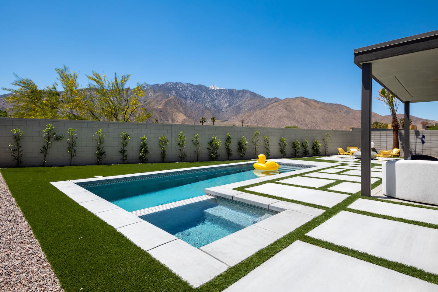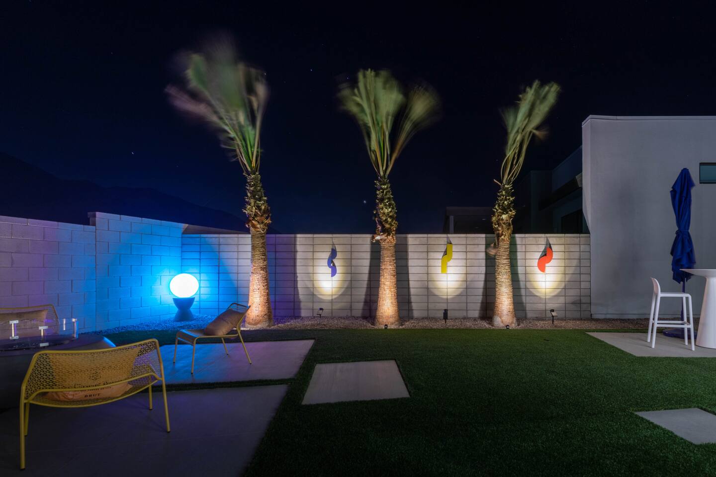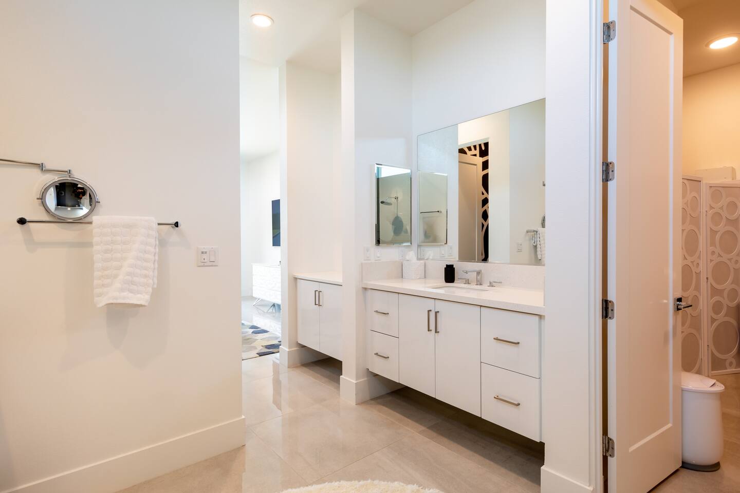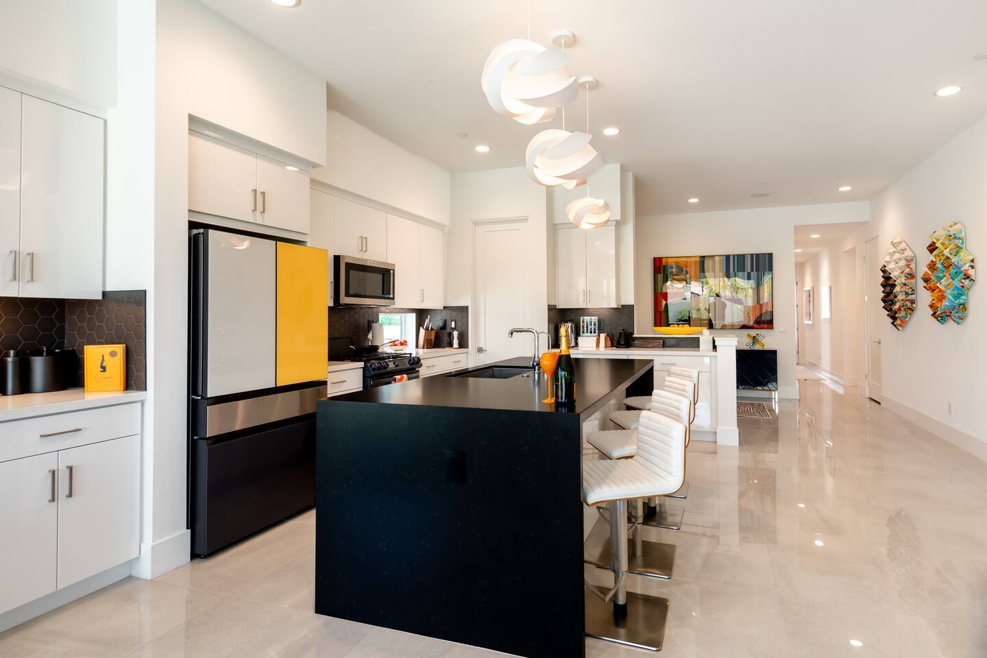 A day in the life: Imagine waking up in the desert in a white modern high ceiling gallery, full of natural light through huge sliders. Grab a cup of coffee and sit on the bouclé outdoor sofa by the 30 foot pool (one of the largest in our community!) and hot tub and stare at the best view of Mount San Jacinto in Palm Springs. Totally private. All yours. Once caffeinated, you can choose to kickstart your day with a walk through acres of olive groves, a lululemon studio yoga class in the front bedroom, a workout with provided kettlebells in the compound, a trip to the complex’s super modern gym and/or yoga studio, a lap swim, or a long soak in the hot tub with a view of the tram at the top of San Jacinto. Breakfast at the dining table provides a full indoor/outdoor lifestyle with an incredible view of the mountains while you plan your day. Work at one of two electric sit/stand desks (one with a 49 inch curved monitor like nothing you’ve ever seen), or vacation by taking a tram trip up the mountains for a hot chocolate at the peak! Go out in Palm Springs for the huge variety of fun places, great restaurants (Sherman’s Bakery! Sandfish Sushi! Clandestino!), incredible bars and social scene! Try a drag brunch at the Saguaro. Thursday nights downtown Palm Springs shuts down for a street fair full of local artists and chefs – easy parking, easy walking, easy fun. Shop for art on El Paseo for first Fridays (free champagne!). Friday and Saturday nights before heading out stop by the community complex, where a private bar serves the most delicious drinks and great company! When you’re done with any outing, return to a serene gated community to relax in front of one of four art tvs (85 inch in the living room, 75 inch in the primary suite) or a late night swim with a yard that is fully illuminated with its own palm trees and gas fire pit. Play a game of pool or ping pong on the brand new outdoor pool table! This home was completed in December 2022 and is brand new, with ten foot ceilings, floor-to-ceiling glass/tile showers that cannot be beat, separated sinks in the primary suite, blackout curtains in all bedrooms, and direct access to the hot tub and outdoors from two of the three bedrooms (including the primary, where its just a few steps!). Professionally designed for maximum comfort, functionality, and aesthetics, this incredible retreat offers the private indoor/outdoor lifestyle that Palm Springs is famous for! Three bedrooms and two and half bathrooms are in this giant 2300+ sq foot house (a rare size in Palm Springs), complete with another 4000+ sq ft of outdoor space and an attached two car garage, including Level 2 EV Charger. The appliances are all brand new and all Samsung smart devices, including a colorful refrigerator with glass doors, two ice cube sizes, a self-filling water pitcher, a beverage center, and more! The oven has an air fryer built in, perfect for leftover French fries or onion rings. The four televisions are all smart Frame TVs, which means when you turn them off they display curated art in dimmed lighting inside a picture frame so that you cannot tell they are not actually framed pieces of art on the walls (see the photos). The outdoor space includes a lap pool, hot tub, outdoor dining, a gas fire pit with four chairs around it, a soothing meditation space we call the ‘Green Room’, a workout space, a living space, and two sun worshipping loungers – all under the palm trees and artful multicolor outdoor lighting. Amenities: Accommodations for 6 King Bed in Primary with plush hotel quality mattresses 2 Queen pullout beds in guest bedrooms Luxury Brooklinen linens 2 office set ups in each guest bedroom for remote work 2 full en-suite bathrooms plus powder room TV’s in all bedrooms Heated (upon request) pool and spa (spa heating included with all reservations) Pool towels and floatation toys Gas grill on site Wall-mounted 4K TV in the living room Fully equipped kitchen Dining table with seating for 8 In-home laundry with full-size washer and dryer 2 car garage (space for one vehicle) EV Charger MIRALON Community offers: Heated Community Pool and Spa (open 6AM-10PM) Community gym Dog park