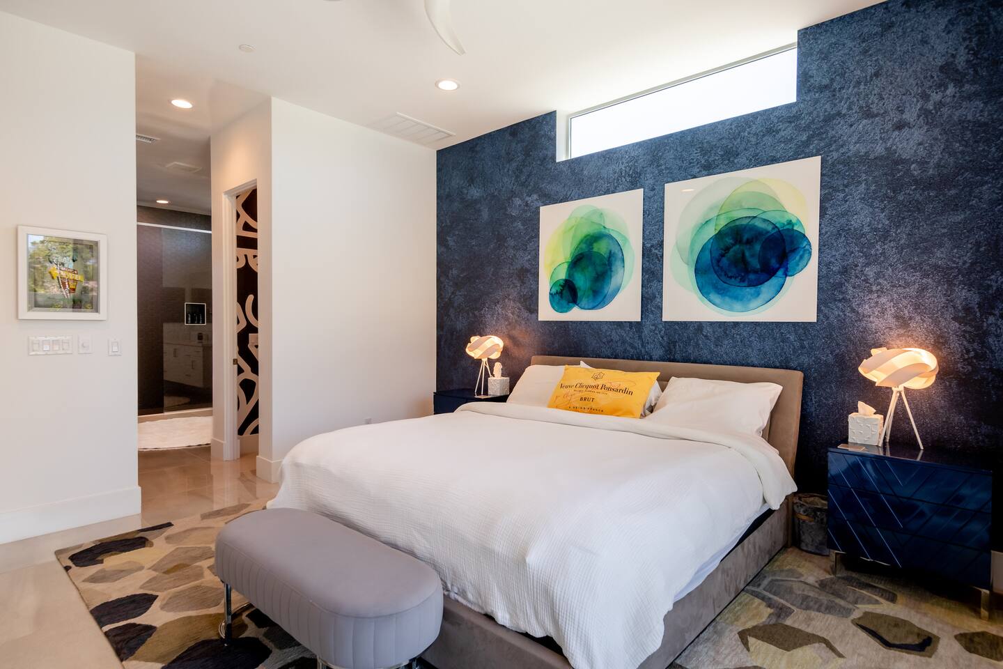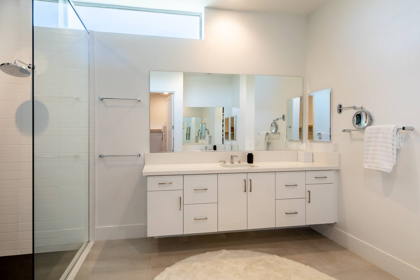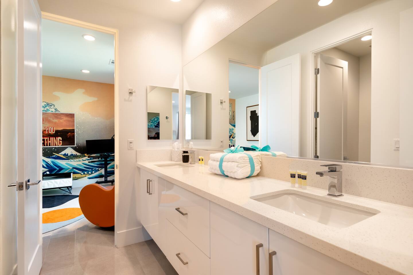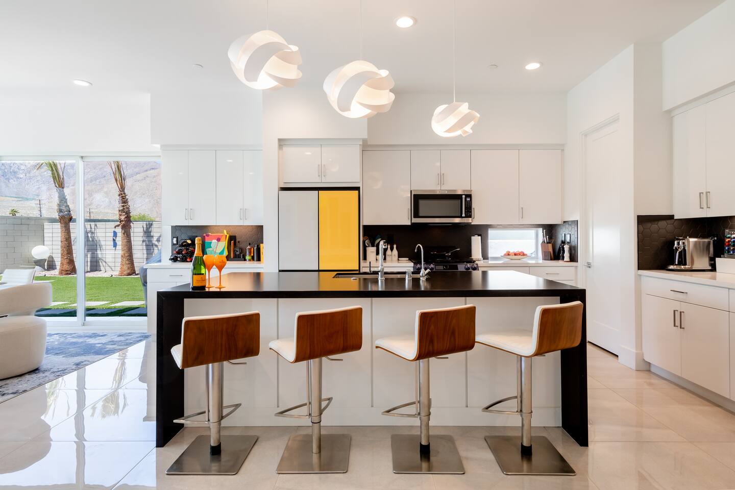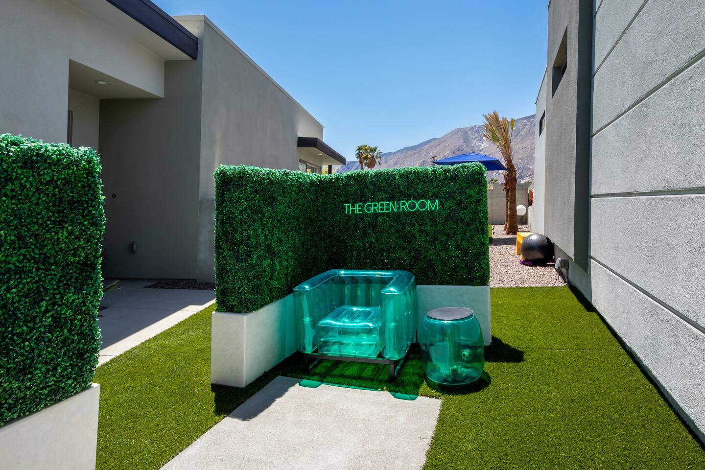 A day in the life: Imagine waking up in the desert in a white modern high ceiling gallery, full of natural light through huge sliders. Grab a cup of coffee and sit on the bouclé outdoor sofa by the 30 foot pool (one of the largest in our community!) and hot tub and stare at the best view of Mount San Jacinto in Palm Springs. Totally private. All yours. Once caffeinated, you can choose to kickstart your day with a walk through acres of olive groves, a lululemon studio yoga class in the front bedroom, a workout with provided kettlebells in the compound, a trip to the complex’s super modern gym and/or yoga studio, a lap swim, or a long soak in the hot tub with a view of the tram at the top of San Jacinto. Breakfast at the dining table provides a full indoor/outdoor lifestyle with an incredible view of the mountains while you plan your day. Work at one of two electric sit/stand desks (one with a 49 inch curved monitor like nothing you’ve ever seen), or vacation by taking a tram trip up the mountains for a hot chocolate at the peak! Go out in Palm Springs for the huge variety of fun places, great restaurants (Sherman’s Bakery! Sandfish Sushi! Clandestino!), incredible bars and social scene! Try a drag brunch at the Saguaro. Thursday nights downtown Palm Springs shuts down for a street fair full of local artists and chefs – easy parking, easy walking, easy fun. Shop for art on El Paseo for first Fridays (free champagne!). Friday and Saturday nights before heading out stop by the community complex, where a private bar serves the most delicious drinks and great company! When you’re done with any outing, return to a serene gated community to relax in front of one of four art tvs (85 inch in the living room, 75 inch in the primary suite) or a late night swim with a yard that is fully illuminated with its own palm trees and gas fire pit. Play a game of pool or ping pong on the brand new outdoor pool table! This home was completed in December 2022 and is brand new, with ten foot ceilings, floor-to-ceiling glass/tile showers that cannot be beat, separated sinks in the primary suite, blackout curtains in all bedrooms, and direct access to the hot tub and outdoors from two of the three bedrooms (including the primary, where its just a few steps!). Professionally designed for maximum comfort, functionality, and aesthetics, this incredible retreat offers the private indoor/outdoor lifestyle that Palm Springs is famous for! Three bedrooms and two and half bathrooms are in this giant 2300+ sq foot house (a rare size in Palm Springs), complete with another 4000+ sq ft of outdoor space and an attached two car garage, including Level 2 EV Charger. The appliances are all brand new and all Samsung smart devices, including a colorful refrigerator with glass doors, two ice cube sizes, a self-filling water pitcher, a beverage center, and more! The oven has an air fryer built in, perfect for leftover French fries or onion rings. The four televisions are all smart Frame TVs, which means when you turn them off they display curated art in dimmed lighting inside a picture frame so that you cannot tell they are not actually framed pieces of art on the walls (see the photos). The outdoor space includes a lap pool, hot tub, outdoor dining, a gas fire pit with four chairs around it, a soothing meditation space we call the ‘Green Room’, a workout space, a living space, and two sun worshipping loungers – all under the palm trees and artful multicolor outdoor lighting. Amenities: Accommodations for 6 King Bed in Primary with plush hotel quality mattresses 2 Queen pullout beds in guest bedrooms Luxury Brooklinen linens 2 office set ups in each guest bedroom for remote work 2 full en-suite bathrooms plus powder room TV’s in all bedrooms Heated (upon request) pool and spa (spa heating included with all reservations) Pool towels and floatation toys Gas grill on site Wall-mounted 4K TV in the living room Fully equipped kitchen Dining table with seating for 8 In-home laundry with full-size washer and dryer 2 car garage (space for one vehicle) EV Charger MIRALON Community offers: Heated Community Pool and Spa (open 6AM-10PM) Community gym Dog park