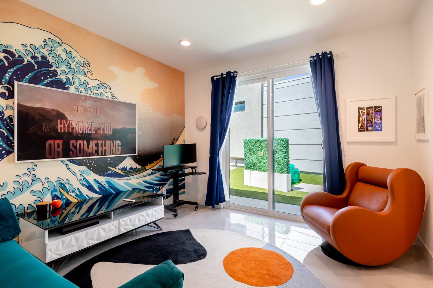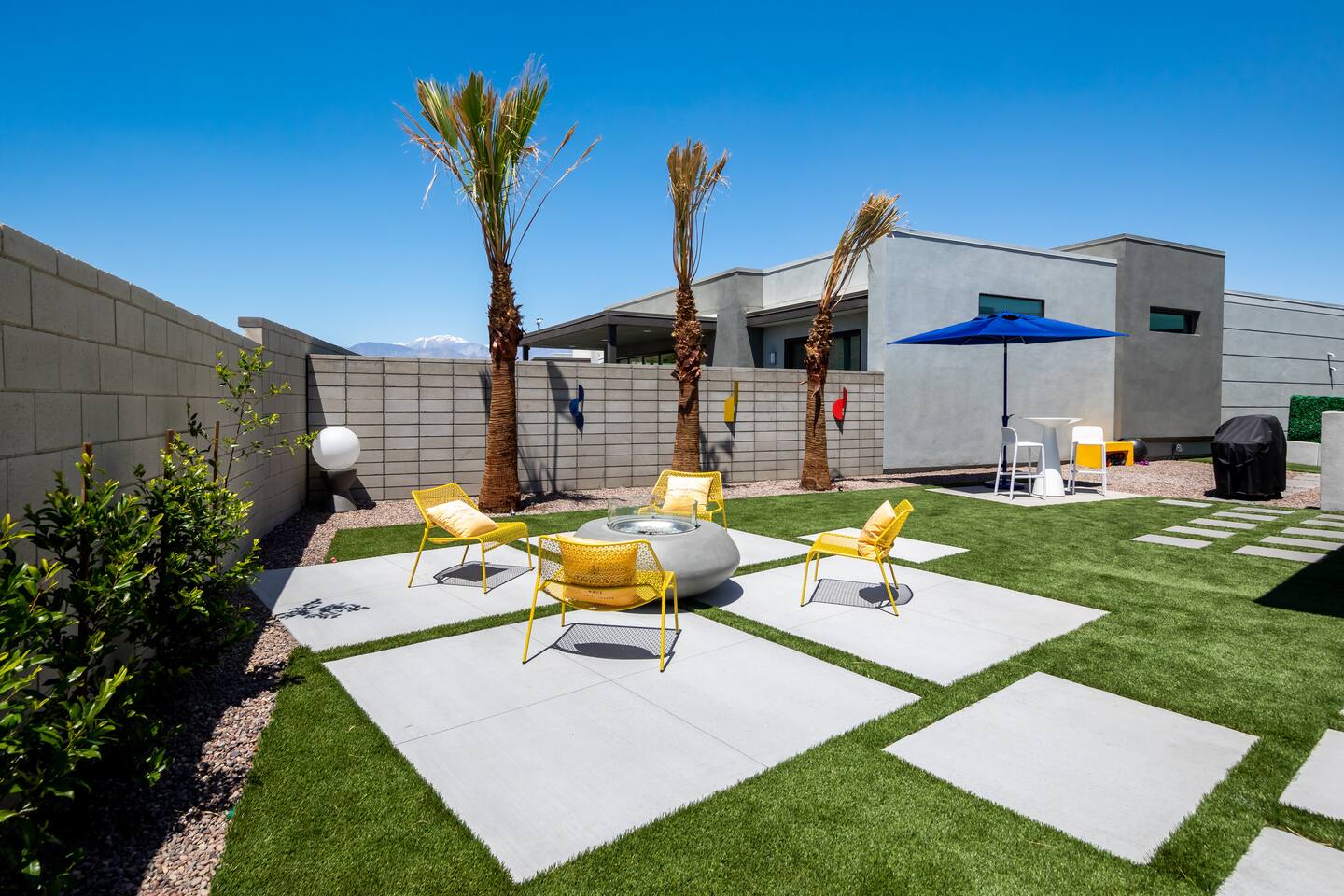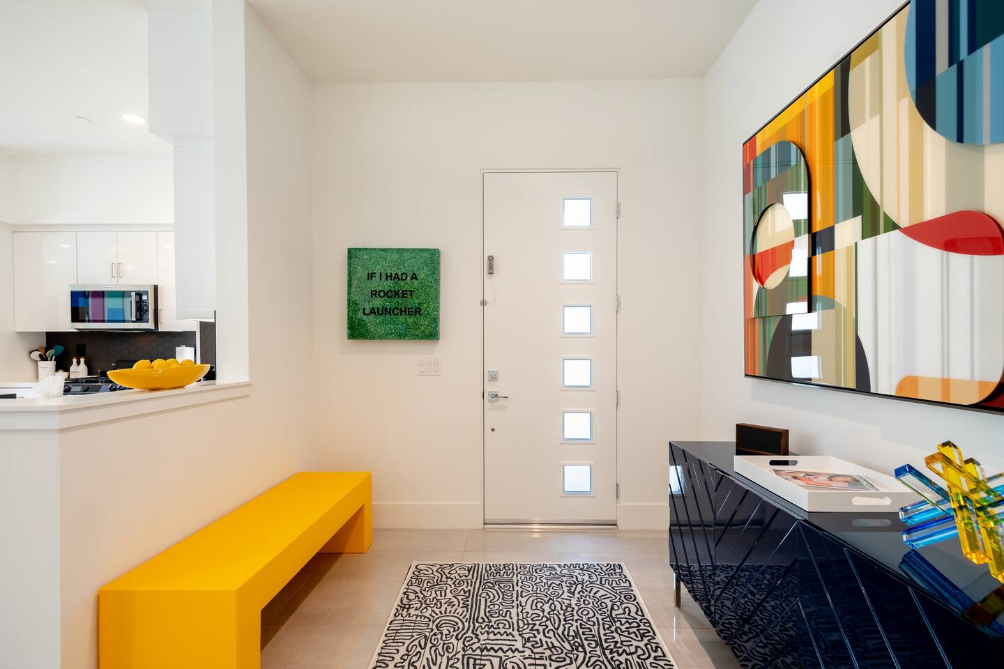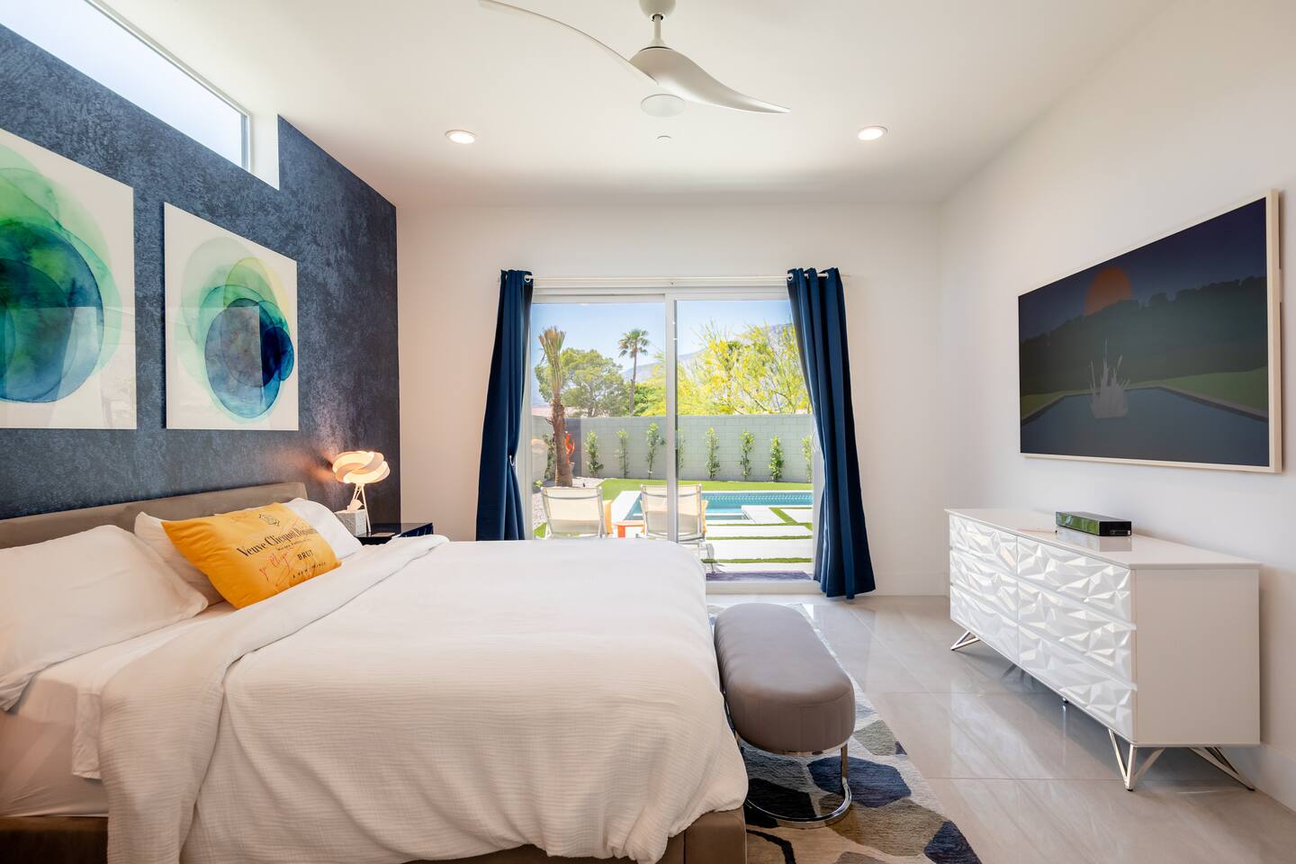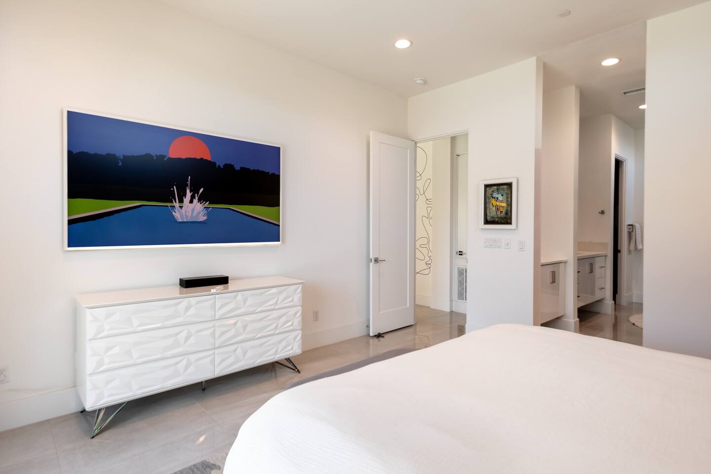 A day in the life: Imagine waking up in the desert in a white modern high ceiling gallery, full of natural light through huge sliders. Grab a cup of coffee and sit on the bouclé outdoor sofa by the 30 foot pool (one of the largest in our community!) and hot tub and stare at the best view of Mount San Jacinto in Palm Springs. Totally private. All yours. Once caffeinated, you can choose to kickstart your day with a walk through acres of olive groves, a lululemon studio yoga class in the front bedroom, a workout with provided kettlebells in the compound, a trip to the complex’s super modern gym and/or yoga studio, a lap swim, or a long soak in the hot tub with a view of the tram at the top of San Jacinto. Breakfast at the dining table provides a full indoor/outdoor lifestyle with an incredible view of the mountains while you plan your day. Work at one of two electric sit/stand desks (one with a 49 inch curved monitor like nothing you’ve ever seen), or vacation by taking a tram trip up the mountains for a hot chocolate at the peak! Go out in Palm Springs for the huge variety of fun places, great restaurants (Sherman’s Bakery! Sandfish Sushi! Clandestino!), incredible bars and social scene! Try a drag brunch at the Saguaro. Thursday nights downtown Palm Springs shuts down for a street fair full of local artists and chefs – easy parking, easy walking, easy fun. Shop for art on El Paseo for first Fridays (free champagne!). Friday and Saturday nights before heading out stop by the community complex, where a private bar serves the most delicious drinks and great company! When you’re done with any outing, return to a serene gated community to relax in front of one of four art tvs (85 inch in the living room, 75 inch in the primary suite) or a late night swim with a yard that is fully illuminated with its own palm trees and gas fire pit. Play a game of pool or ping pong on the brand new outdoor pool table! This home was completed in December 2022 and is brand new, with ten foot ceilings, floor-to-ceiling glass/tile showers that cannot be beat, separated sinks in the primary suite, blackout curtains in all bedrooms, and direct access to the hot tub and outdoors from two of the three bedrooms (including the primary, where its just a few steps!). Professionally designed for maximum comfort, functionality, and aesthetics, this incredible retreat offers the private indoor/outdoor lifestyle that Palm Springs is famous for! Three bedrooms and two and half bathrooms are in this giant 2300+ sq foot house (a rare size in Palm Springs), complete with another 4000+ sq ft of outdoor space and an attached two car garage, including Level 2 EV Charger. The appliances are all brand new and all Samsung smart devices, including a colorful refrigerator with glass doors, two ice cube sizes, a self-filling water pitcher, a beverage center, and more! The oven has an air fryer built in, perfect for leftover French fries or onion rings. The four televisions are all smart Frame TVs, which means when you turn them off they display curated art in dimmed lighting inside a picture frame so that you cannot tell they are not actually framed pieces of art on the walls (see the photos). The outdoor space includes a lap pool, hot tub, outdoor dining, a gas fire pit with four chairs around it, a soothing meditation space we call the ‘Green Room’, a workout space, a living space, and two sun worshipping loungers – all under the palm trees and artful multicolor outdoor lighting. Amenities: Accommodations for 6 King Bed in Primary with plush hotel quality mattresses 2 Queen pullout beds in guest bedrooms Luxury Brooklinen linens 2 office set ups in each guest bedroom for remote work 2 full en-suite bathrooms plus powder room TV’s in all bedrooms Heated (upon request) pool and spa (spa heating included with all reservations) Pool towels and floatation toys Gas grill on site Wall-mounted 4K TV in the living room Fully equipped kitchen Dining table with seating for 8 In-home laundry with full-size washer and dryer 2 car garage (space for one vehicle) EV Charger MIRALON Community offers: Heated Community Pool and Spa (open 6AM-10PM) Community gym Dog park