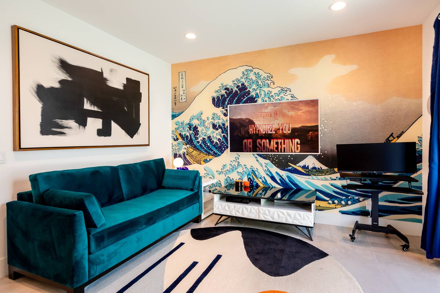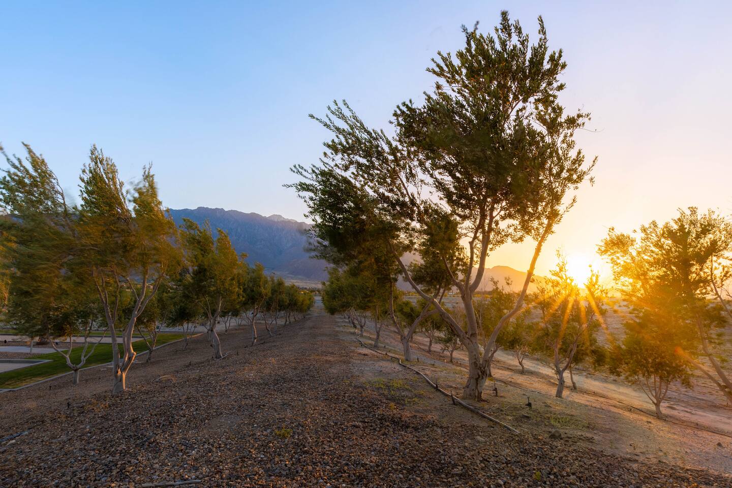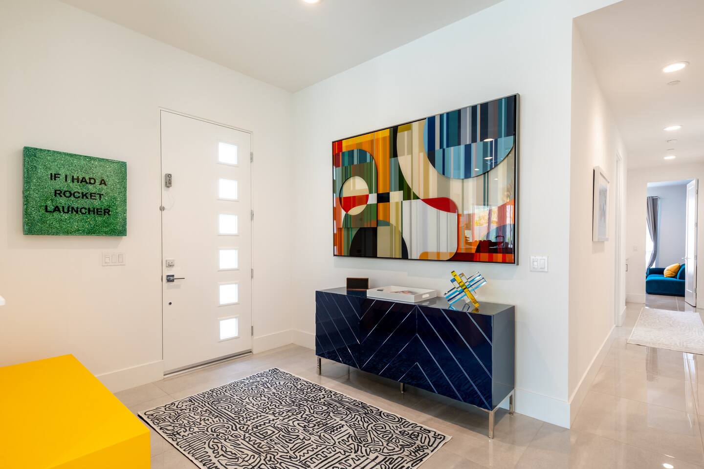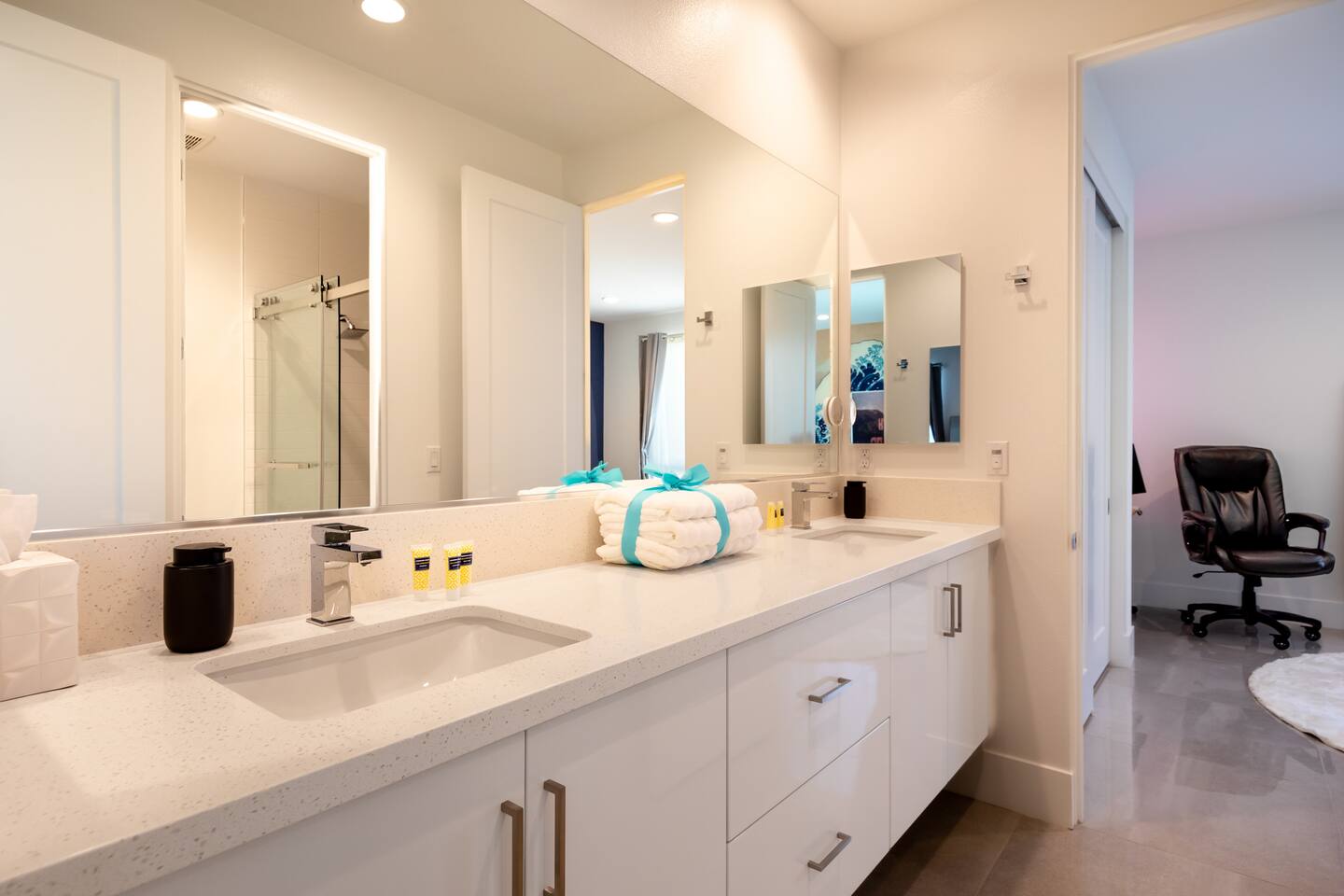 A day in the life: Imagine waking up in the desert in a white modern high ceiling gallery, full of natural light through huge sliders. Grab a cup of coffee and sit on the bouclé outdoor sofa by the 30 foot pool (one of the largest in our community!) and hot tub and stare at the best view of Mount San Jacinto in Palm Springs. Totally private. All yours. Once caffeinated, you can choose to kickstart your day with a walk through acres of olive groves, a lululemon studio yoga class in the front bedroom, a workout with provided kettlebells in the compound, a trip to the complex’s super modern gym and/or yoga studio, a lap swim, or a long soak in the hot tub with a view of the tram at the top of San Jacinto. Breakfast at the dining table provides a full indoor/outdoor lifestyle with an incredible view of the mountains while you plan your day. Work at one of two electric sit/stand desks (one with a 49 inch curved monitor like nothing you’ve ever seen), or vacation by taking a tram trip up the mountains for a hot chocolate at the peak! Go out in Palm Springs for the huge variety of fun places, great restaurants (Sherman’s Bakery! Sandfish Sushi! Clandestino!), incredible bars and social scene! Try a drag brunch at the Saguaro. Thursday nights downtown Palm Springs shuts down for a street fair full of local artists and chefs – easy parking, easy walking, easy fun. Shop for art on El Paseo for first Fridays (free champagne!). Friday and Saturday nights before heading out stop by the community complex, where a private bar serves the most delicious drinks and great company! When you’re done with any outing, return to a serene gated community to relax in front of one of four art tvs (85 inch in the living room, 75 inch in the primary suite) or a late night swim with a yard that is fully illuminated with its own palm trees and gas fire pit. Play a game of pool or ping pong on the brand new outdoor pool table! This home was completed in December 2022 and is brand new, with ten foot ceilings, floor-to-ceiling glass/tile showers that cannot be beat, separated sinks in the primary suite, blackout curtains in all bedrooms, and direct access to the hot tub and outdoors from two of the three bedrooms (including the primary, where its just a few steps!). Professionally designed for maximum comfort, functionality, and aesthetics, this incredible retreat offers the private indoor/outdoor lifestyle that Palm Springs is famous for! Three bedrooms and two and half bathrooms are in this giant 2300+ sq foot house (a rare size in Palm Springs), complete with another 4000+ sq ft of outdoor space and an attached two car garage, including Level 2 EV Charger. The appliances are all brand new and all Samsung smart devices, including a colorful refrigerator with glass doors, two ice cube sizes, a self-filling water pitcher, a beverage center, and more! The oven has an air fryer built in, perfect for leftover French fries or onion rings. The four televisions are all smart Frame TVs, which means when you turn them off they display curated art in dimmed lighting inside a picture frame so that you cannot tell they are not actually framed pieces of art on the walls (see the photos). The outdoor space includes a lap pool, hot tub, outdoor dining, a gas fire pit with four chairs around it, a soothing meditation space we call the ‘Green Room’, a workout space, a living space, and two sun worshipping loungers – all under the palm trees and artful multicolor outdoor lighting. Amenities: Accommodations for 6 King Bed in Primary with plush hotel quality mattresses 2 Queen pullout beds in guest bedrooms Luxury Brooklinen linens 2 office set ups in each guest bedroom for remote work 2 full en-suite bathrooms plus powder room TV’s in all bedrooms Heated (upon request) pool and spa (spa heating included with all reservations) Pool towels and floatation toys Gas grill on site Wall-mounted 4K TV in the living room Fully equipped kitchen Dining table with seating for 8 In-home laundry with full-size washer and dryer 2 car garage (space for one vehicle) EV Charger MIRALON Community offers: Heated Community Pool and Spa (open 6AM-10PM) Community gym Dog park