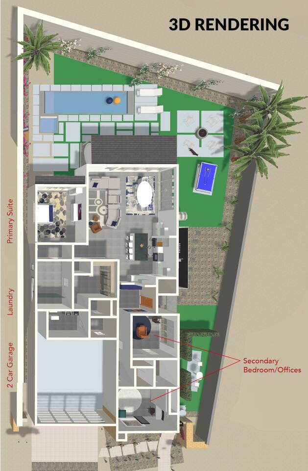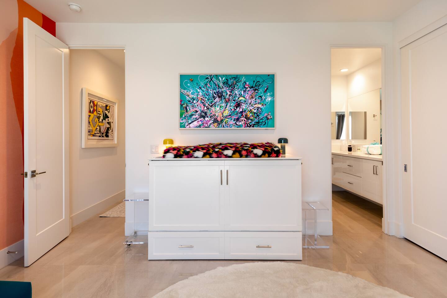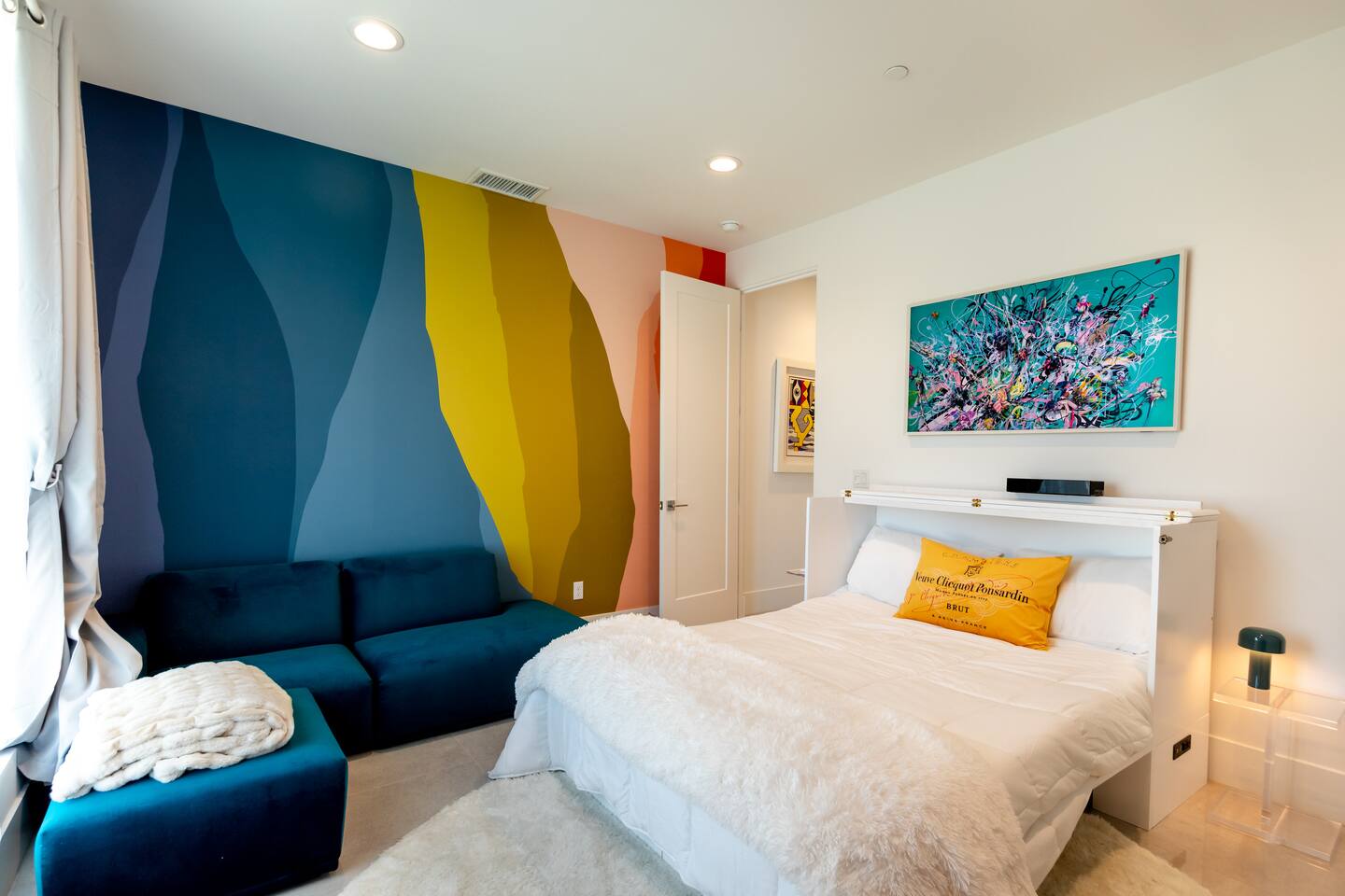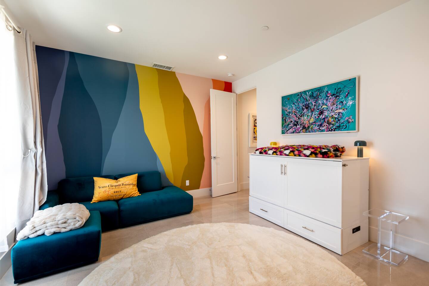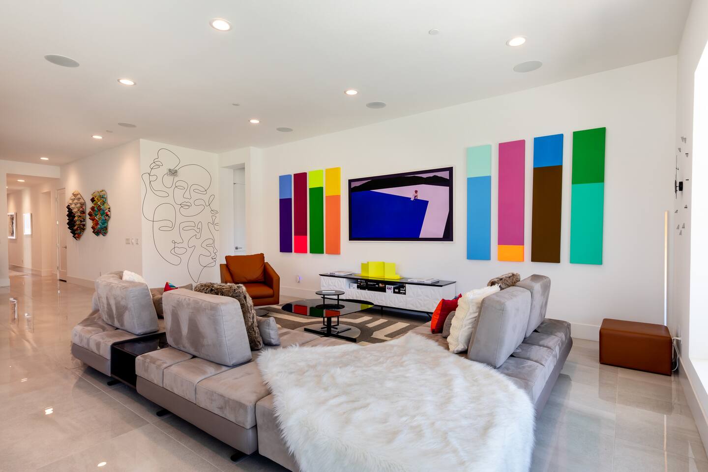 A day in the life: Imagine waking up in the desert in a white modern high ceiling gallery, full of natural light through huge sliders. Grab a cup of coffee and sit on the bouclé outdoor sofa by the 30 foot pool (one of the largest in our community!) and hot tub and stare at the best view of Mount San Jacinto in Palm Springs. Totally private. All yours. Once caffeinated, you can choose to kickstart your day with a walk through acres of olive groves, a lululemon studio yoga class in the front bedroom, a workout with provided kettlebells in the compound, a trip to the complex’s super modern gym and/or yoga studio, a lap swim, or a long soak in the hot tub with a view of the tram at the top of San Jacinto. Breakfast at the dining table provides a full indoor/outdoor lifestyle with an incredible view of the mountains while you plan your day. Work at one of two electric sit/stand desks (one with a 49 inch curved monitor like nothing you’ve ever seen), or vacation by taking a tram trip up the mountains for a hot chocolate at the peak! Go out in Palm Springs for the huge variety of fun places, great restaurants (Sherman’s Bakery! Sandfish Sushi! Clandestino!), incredible bars and social scene! Try a drag brunch at the Saguaro. Thursday nights downtown Palm Springs shuts down for a street fair full of local artists and chefs – easy parking, easy walking, easy fun. Shop for art on El Paseo for first Fridays (free champagne!). Friday and Saturday nights before heading out stop by the community complex, where a private bar serves the most delicious drinks and great company! When you’re done with any outing, return to a serene gated community to relax in front of one of four art tvs (85 inch in the living room, 75 inch in the primary suite) or a late night swim with a yard that is fully illuminated with its own palm trees and gas fire pit. Play a game of pool or ping pong on the brand new outdoor pool table! This home was completed in December 2022 and is brand new, with ten foot ceilings, floor-to-ceiling glass/tile showers that cannot be beat, separated sinks in the primary suite, blackout curtains in all bedrooms, and direct access to the hot tub and outdoors from two of the three bedrooms (including the primary, where its just a few steps!). Professionally designed for maximum comfort, functionality, and aesthetics, this incredible retreat offers the private indoor/outdoor lifestyle that Palm Springs is famous for! Three bedrooms and two and half bathrooms are in this giant 2300+ sq foot house (a rare size in Palm Springs), complete with another 4000+ sq ft of outdoor space and an attached two car garage, including Level 2 EV Charger. The appliances are all brand new and all Samsung smart devices, including a colorful refrigerator with glass doors, two ice cube sizes, a self-filling water pitcher, a beverage center, and more! The oven has an air fryer built in, perfect for leftover French fries or onion rings. The four televisions are all smart Frame TVs, which means when you turn them off they display curated art in dimmed lighting inside a picture frame so that you cannot tell they are not actually framed pieces of art on the walls (see the photos). The outdoor space includes a lap pool, hot tub, outdoor dining, a gas fire pit with four chairs around it, a soothing meditation space we call the ‘Green Room’, a workout space, a living space, and two sun worshipping loungers – all under the palm trees and artful multicolor outdoor lighting. Amenities: Accommodations for 6 King Bed in Primary with plush hotel quality mattresses 2 Queen pullout beds in guest bedrooms Luxury Brooklinen linens 2 office set ups in each guest bedroom for remote work 2 full en-suite bathrooms plus powder room TV’s in all bedrooms Heated (upon request) pool and spa (spa heating included with all reservations) Pool towels and floatation toys Gas grill on site Wall-mounted 4K TV in the living room Fully equipped kitchen Dining table with seating for 8 In-home laundry with full-size washer and dryer 2 car garage (space for one vehicle) EV Charger MIRALON Community offers: Heated Community Pool and Spa (open 6AM-10PM) Community gym Dog park