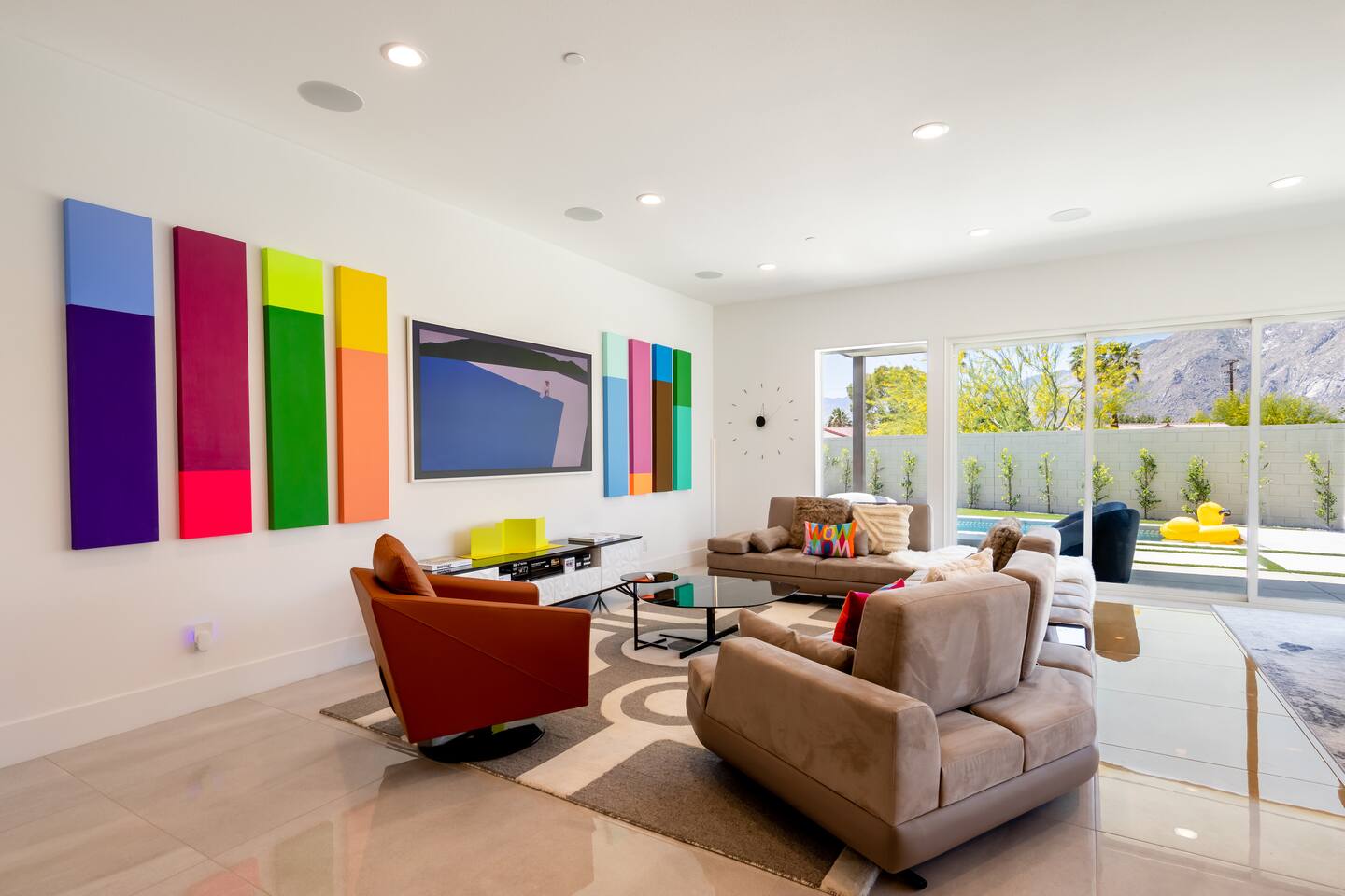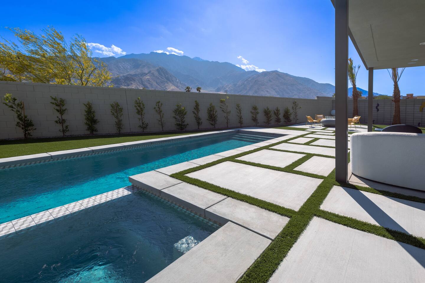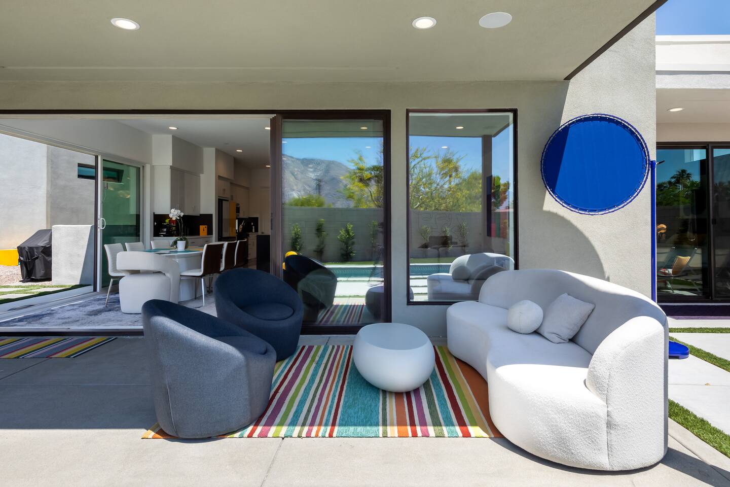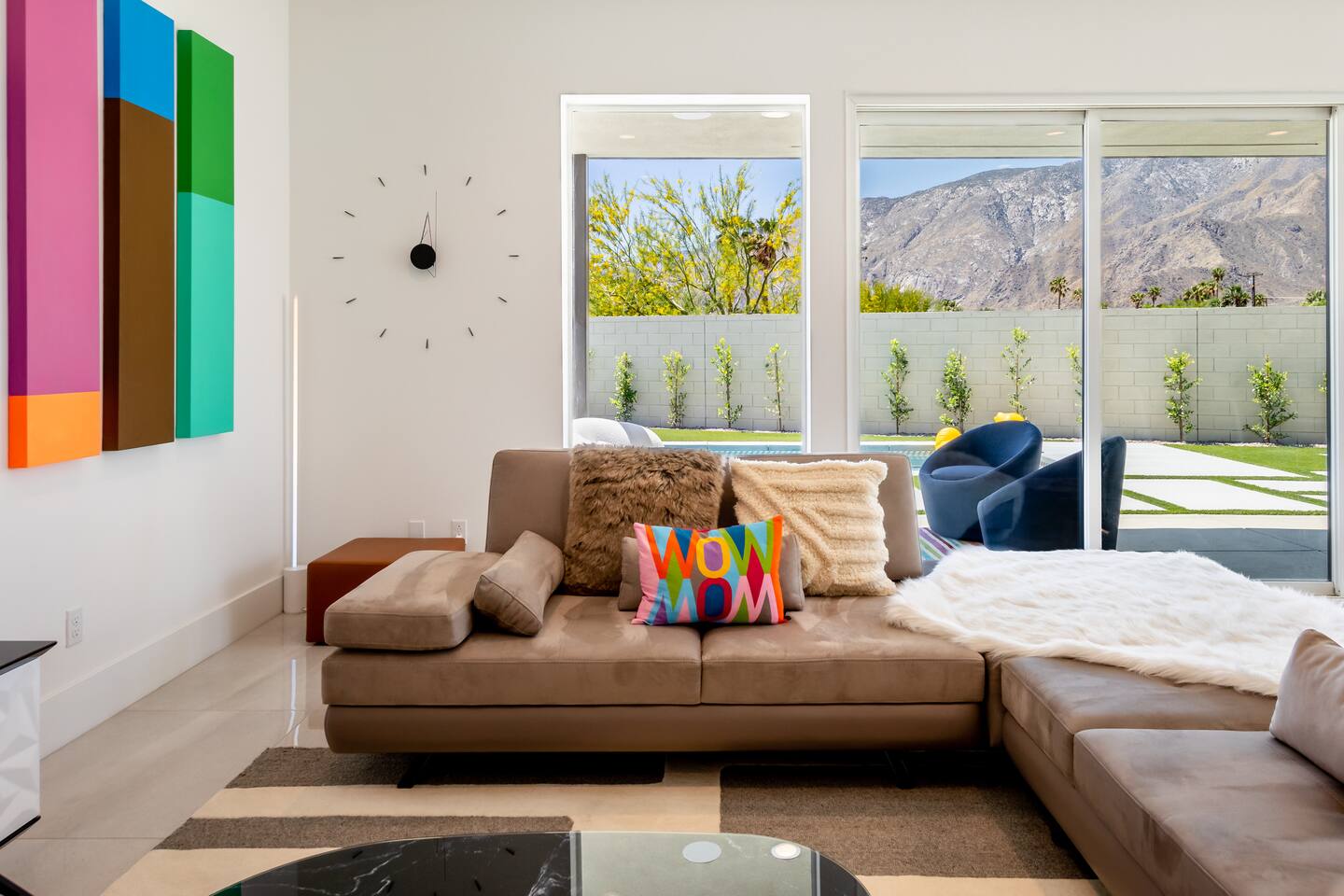 Art-filled, stylish, brand new construction home in Palm Springs at the foot of San Jacinto with a 180 degree panoramic mountain view. There is truly no better view in the Coachella Valley, architecturally framed by two sets of giant foldaway doors in the great room which open to the mountains while you hang out, dine, swim, workout, & more! With a separated primary suite & two other bedrooms/offices, this place is ready for your work from home adventure or your rest & relax vacation! PS#067826