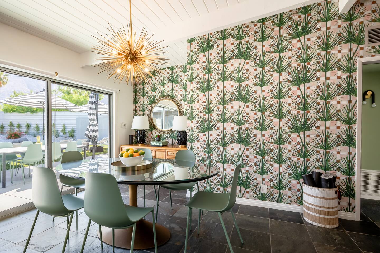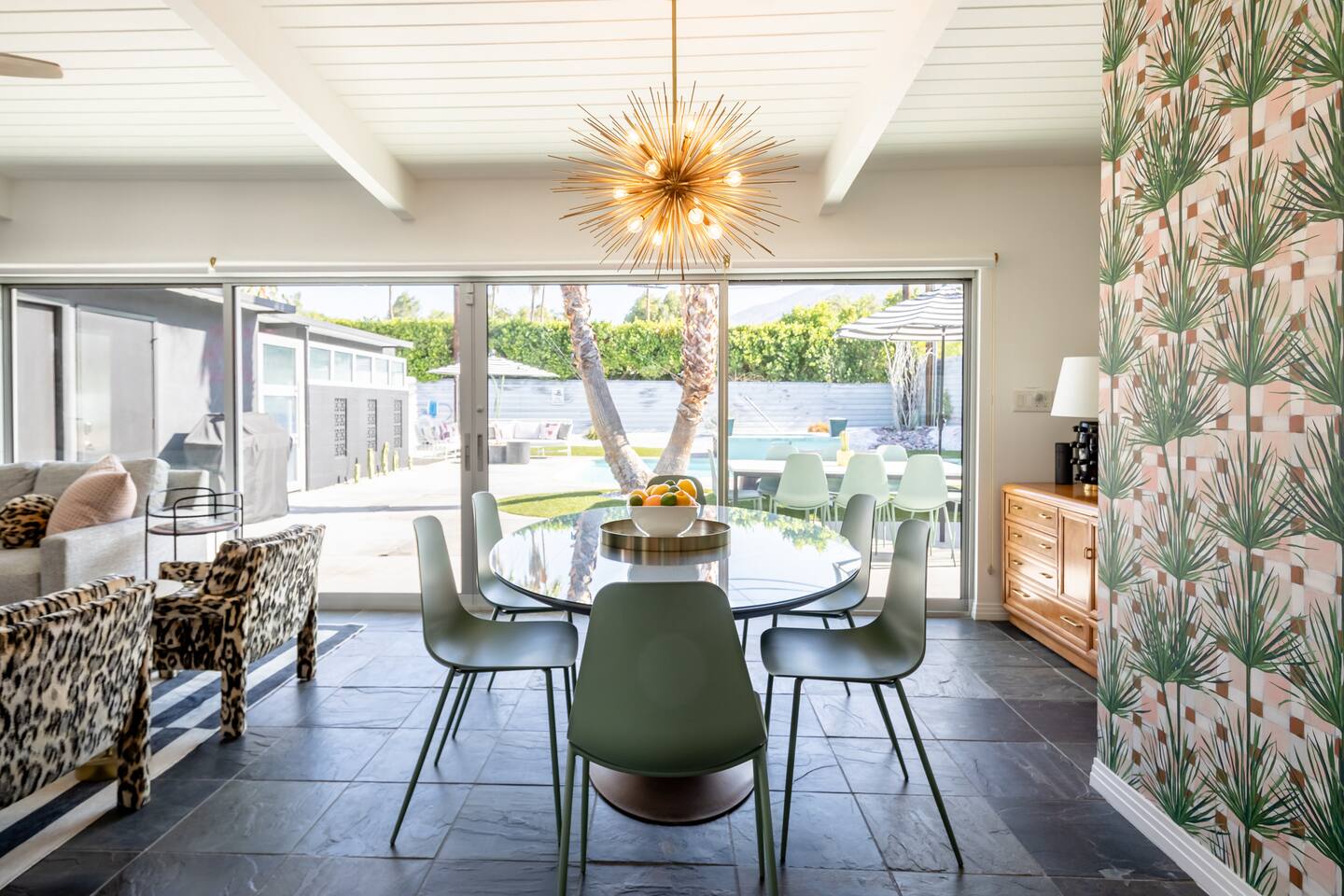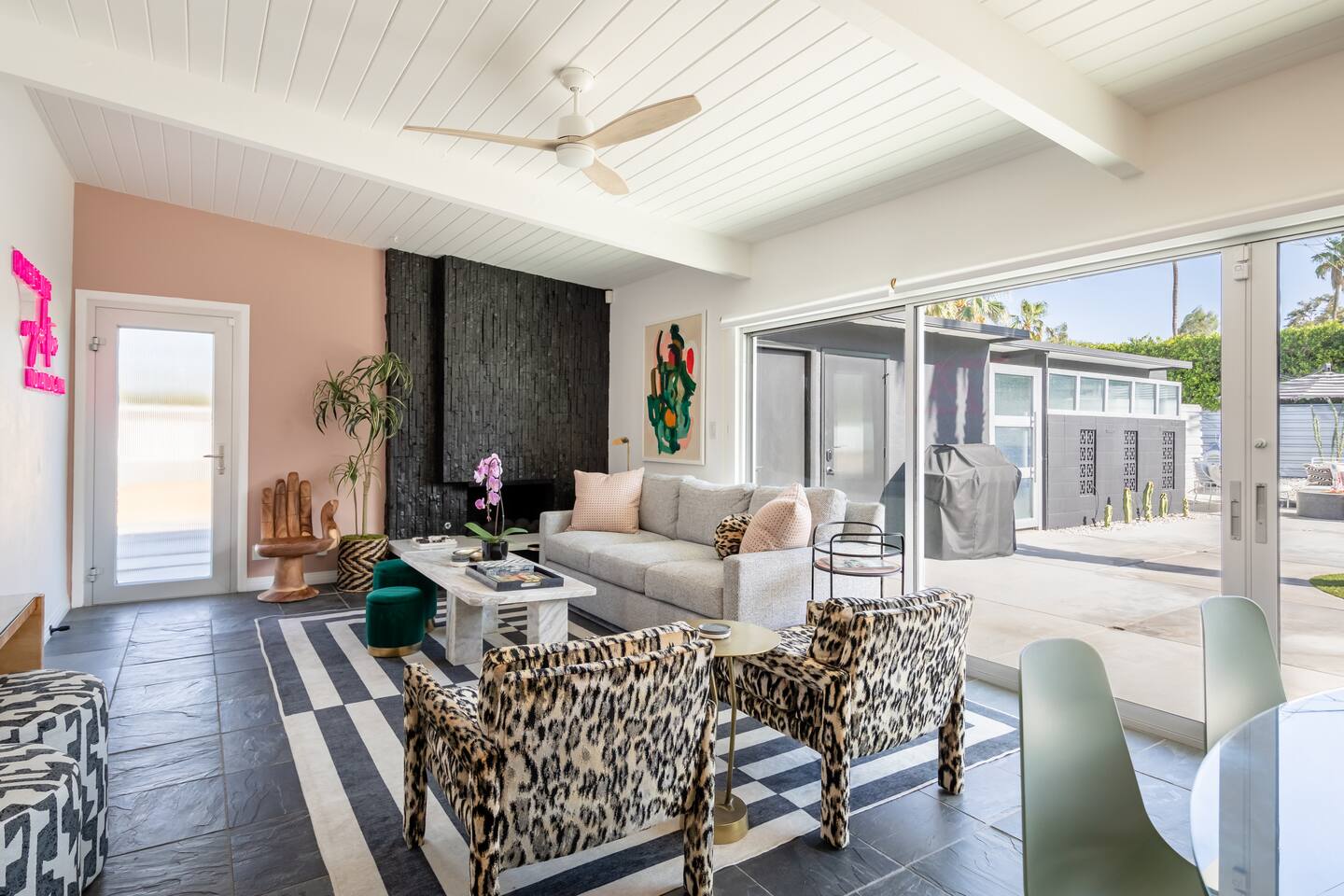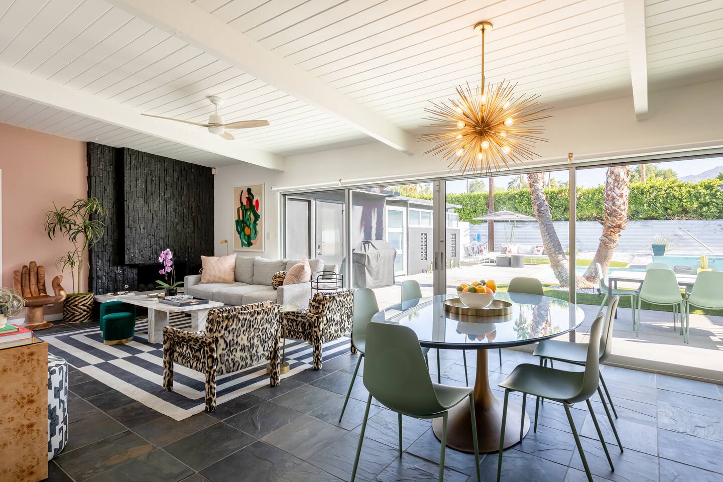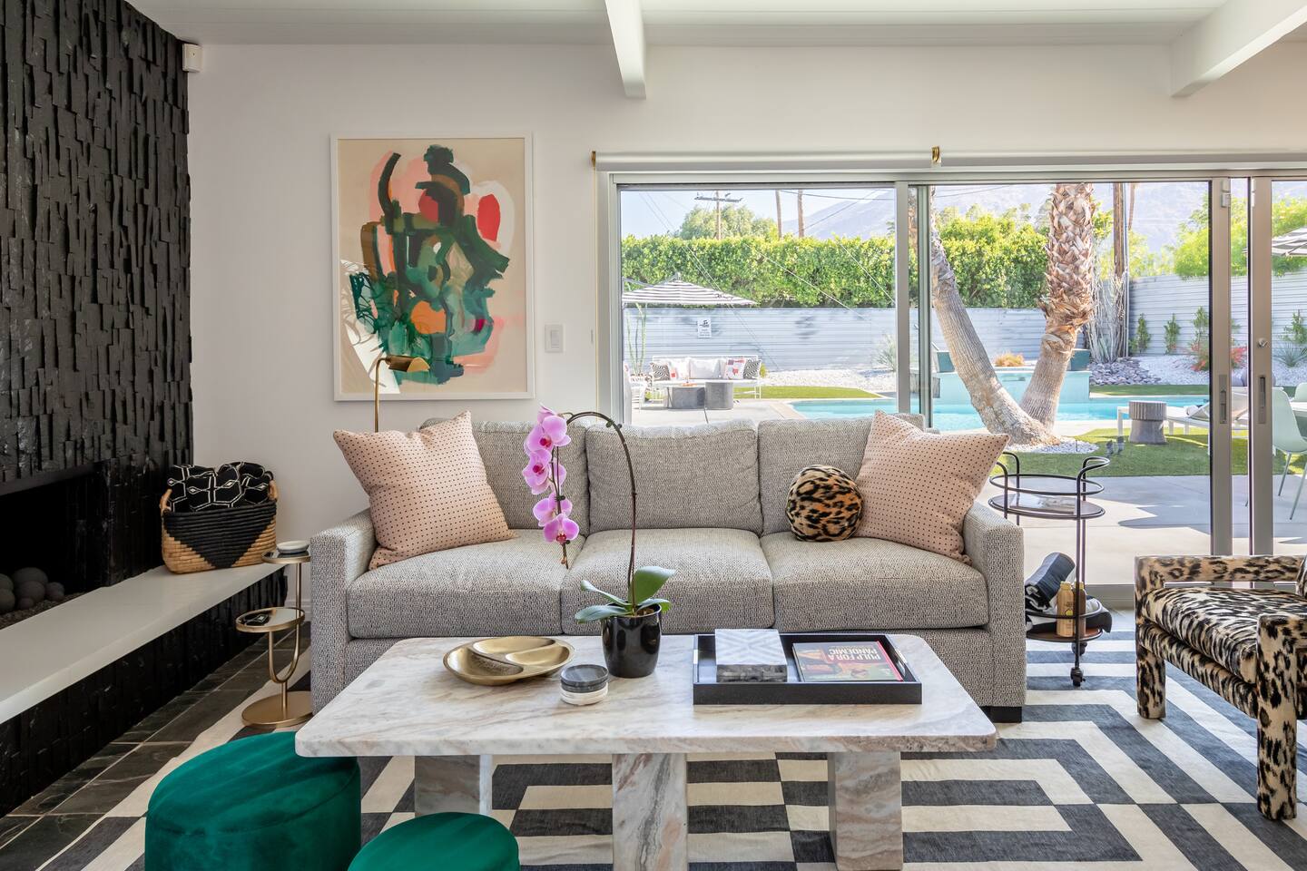 Entering The Pulp House discover a space where incredibly hip decor with slick blacks and cool greys, blush pinks, muted desert greens and earthy dark reds combine with fabulous amenities to create an unsurpassed vacation wonderland. The living room’s black stone fireplace and slate grey floor set the scene, while the chic palm tree wallpaper leaves you in no doubt you’re in Palm Springs. Here you’ll find comfortable lounge seating, a large wall mounted TV and glam dining area, all with expansive views to the pool and yard through the floor-to-ceiling full-width sliding glass doors. The adjacent fully-stocked gourmet kitchen offers everything you need whether you’re whipping up a tasty brunch or creating a cool cocktail-themed dinner party. You can take whatever you’re cooking to the great outdoors too, where the sparkling heated pool (if requested) and large spa await. With superb mountain views as a backdrop, you’ll also find an alfresco dining table, casual seating area, ample sun lounges to work on that desert tan, an outdoor shower and a monumental water feature to up the “Zen” factor. Speaking of Zen, there’s even a designated yoga spot, plus weights for a heavier workout. Accommodations The Pulp House offers sleeping accommodations for six people across three chic bedrooms, each with their own specific themes and decor… The Crane Suite With its ethereal flocks of crane birds featured on its wall paper, The Crane Suite is the home’s primary bedroom and offers a king bed with luxuriously soft mattress and Brooklinen linens, a wall mounted TV, and ample walk-in closet space for every one of your stylish outfits. It also features its own en-suite with walk in shower as well as a sliding door to a private patio area with room for your yoga practice. The Sunset Room The Sunset Room is a sun-filled space with a wall covering that is reminiscent of the Palm Springs sky at dusk. It includes a king-sized bed with Brooklinen linens, large wall-mounted TV, ample closet space for all your chic looks and a sliding door that leads directly to the outdoor area. The Boom Boom Room Named after the iconic lounge, The Boom Boom Room features a geometric-patterned wallpaper, a king bed with quality mattress and Brooklinen linens, wall mounted TV and abundant closet space. There’s also direct access to its own private terrace and the adjacent newly remodeled central bathroom. Uniquely, The Pulp House is all fact and no fiction as both a shoppable vacation rental and a hub for the Pulp team to experiment with designs that reimagine how people live within and interact with their interior spaces. So grab your cast and crew and head on over to The Pulp House - and don’t forget the pups because your four-legged family members are very welcome at the Pulp House too. Amenities: Accommodations for 6 King Beds with plush hotel quality mattresses 1 En-suite bathroom 1 Central bathroom Brooklinen linens TV’s in all bedrooms Private heated salt water pool (if requested with additional fees) Large spa (heating is on demand and included with your reservation) Outdoor shower and waterfall feature Pool towels and floatation toys 6 Sun lounges Ample shade umbrellas Fire pit with abundant seating Gas grill Outdoor dining area with seating for 8 Wall-mounted TV in the living room Fully equipped kitchen Dining table with seating for 6 Washer and dryer