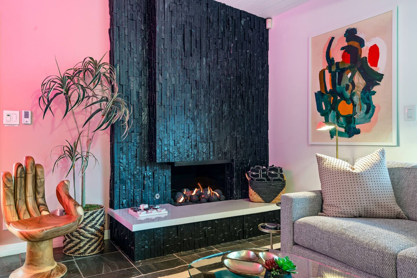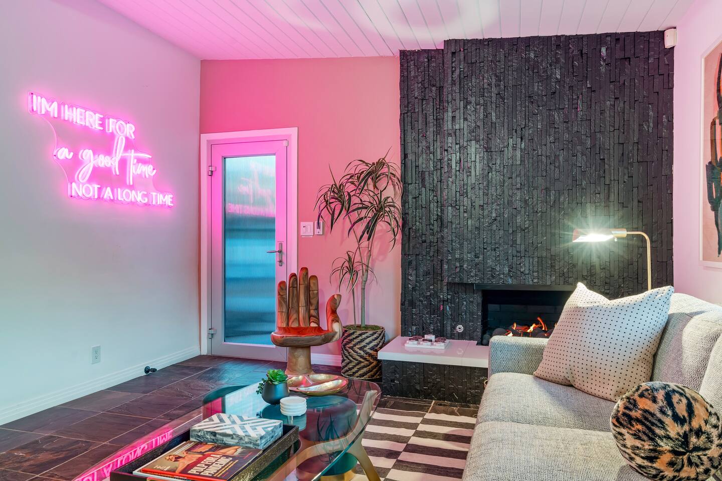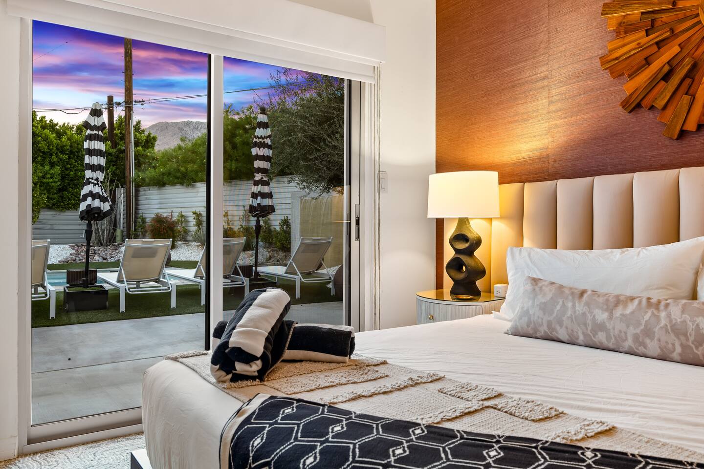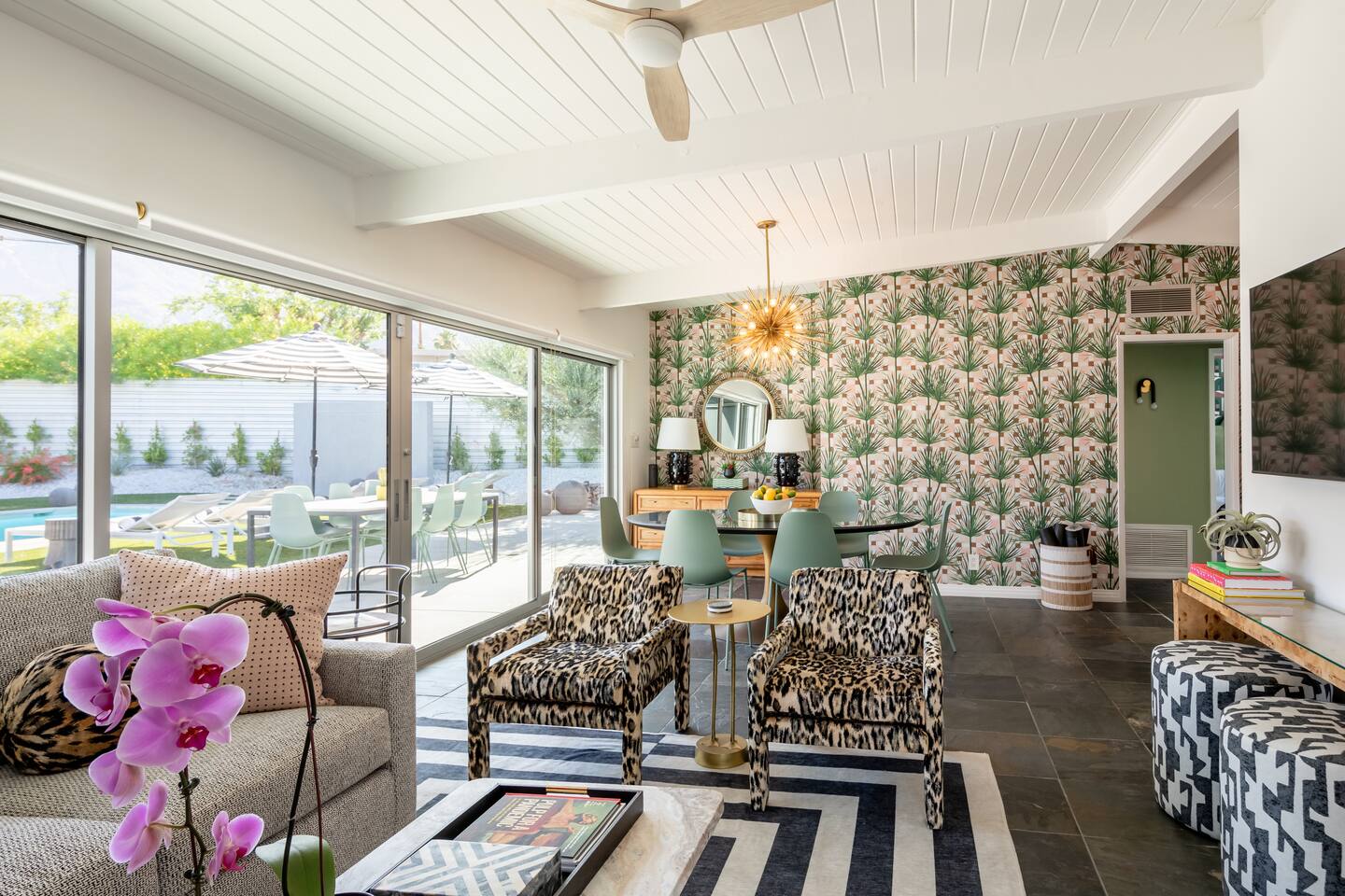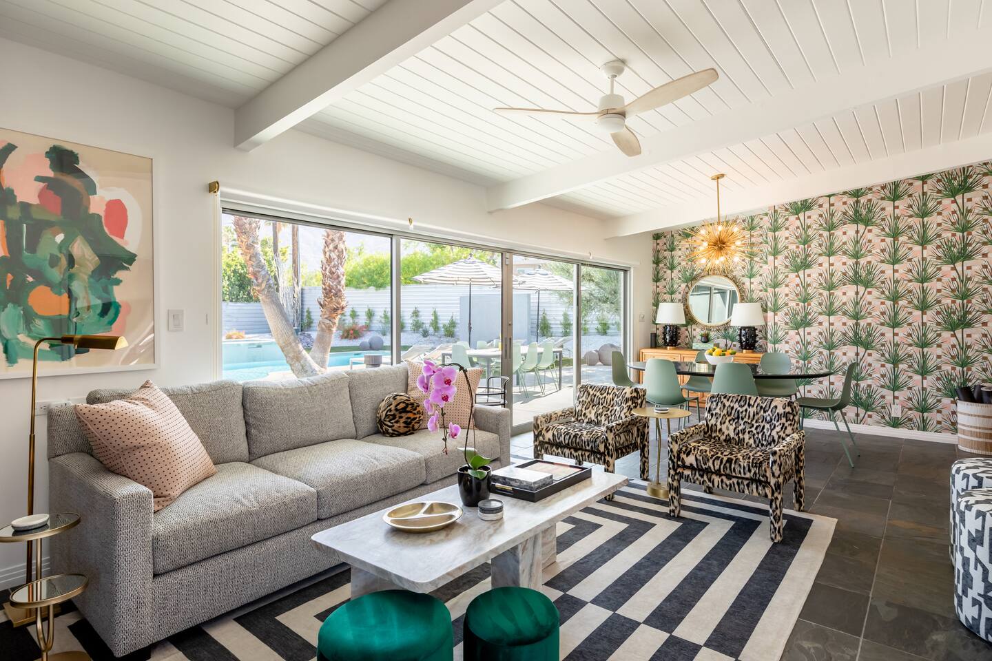 Entering The Pulp House discover a space where incredibly hip decor with slick blacks and cool greys, blush pinks, muted desert greens and earthy dark reds combine with fabulous amenities to create an unsurpassed vacation wonderland. The living room’s black stone fireplace and slate grey floor set the scene, while the chic palm tree wallpaper leaves you in no doubt you’re in Palm Springs. Here you’ll find comfortable lounge seating, a large wall mounted TV and glam dining area, all with expansive views to the pool and yard through the floor-to-ceiling full-width sliding glass doors. The adjacent fully-stocked gourmet kitchen offers everything you need whether you’re whipping up a tasty brunch or creating a cool cocktail-themed dinner party. You can take whatever you’re cooking to the great outdoors too, where the sparkling heated pool (if requested) and large spa await. With superb mountain views as a backdrop, you’ll also find an alfresco dining table, casual seating area, ample sun lounges to work on that desert tan, an outdoor shower and a monumental water feature to up the “Zen” factor. Speaking of Zen, there’s even a designated yoga spot, plus weights for a heavier workout. Accommodations The Pulp House offers sleeping accommodations for six people across three chic bedrooms, each with their own specific themes and decor… The Crane Suite With its ethereal flocks of crane birds featured on its wall paper, The Crane Suite is the home’s primary bedroom and offers a king bed with luxuriously soft mattress and Brooklinen linens, a wall mounted TV, and ample walk-in closet space for every one of your stylish outfits. It also features its own en-suite with walk in shower as well as a sliding door to a private patio area with room for your yoga practice. The Sunset Room The Sunset Room is a sun-filled space with a wall covering that is reminiscent of the Palm Springs sky at dusk. It includes a king-sized bed with Brooklinen linens, large wall-mounted TV, ample closet space for all your chic looks and a sliding door that leads directly to the outdoor area. The Boom Boom Room Named after the iconic lounge, The Boom Boom Room features a geometric-patterned wallpaper, a king bed with quality mattress and Brooklinen linens, wall mounted TV and abundant closet space. There’s also direct access to its own private terrace and the adjacent newly remodeled central bathroom. Uniquely, The Pulp House is all fact and no fiction as both a shoppable vacation rental and a hub for the Pulp team to experiment with designs that reimagine how people live within and interact with their interior spaces. So grab your cast and crew and head on over to The Pulp House - and don’t forget the pups because your four-legged family members are very welcome at the Pulp House too. Amenities: Accommodations for 6 King Beds with plush hotel quality mattresses 1 En-suite bathroom 1 Central bathroom Brooklinen linens TV’s in all bedrooms Private heated salt water pool (if requested with additional fees) Large spa (heating is on demand and included with your reservation) Outdoor shower and waterfall feature Pool towels and floatation toys 6 Sun lounges Ample shade umbrellas Fire pit with abundant seating Gas grill Outdoor dining area with seating for 8 Wall-mounted TV in the living room Fully equipped kitchen Dining table with seating for 6 Washer and dryer