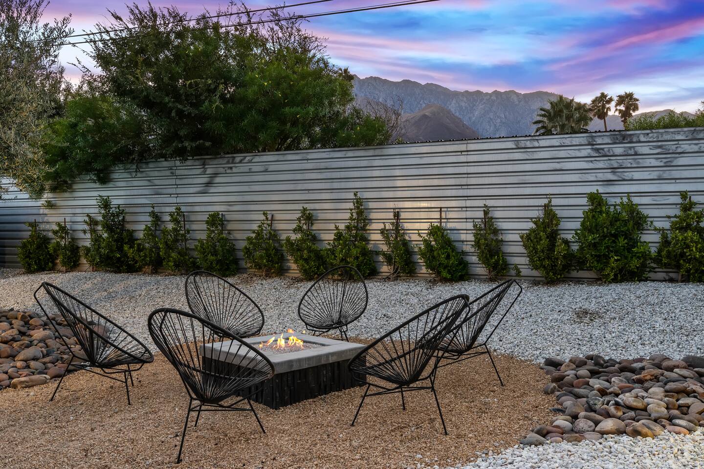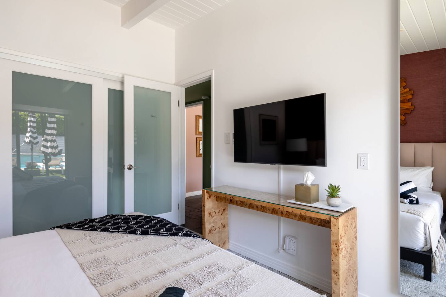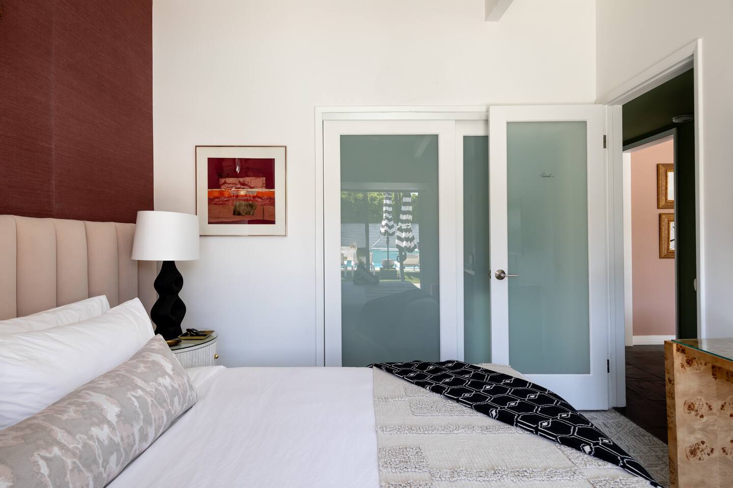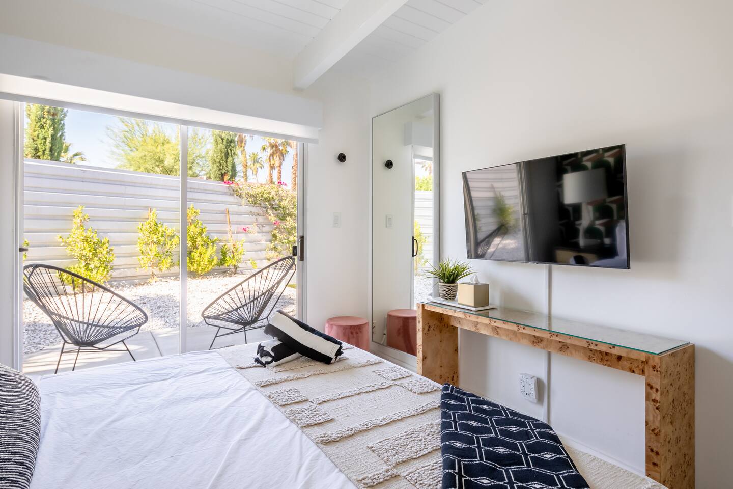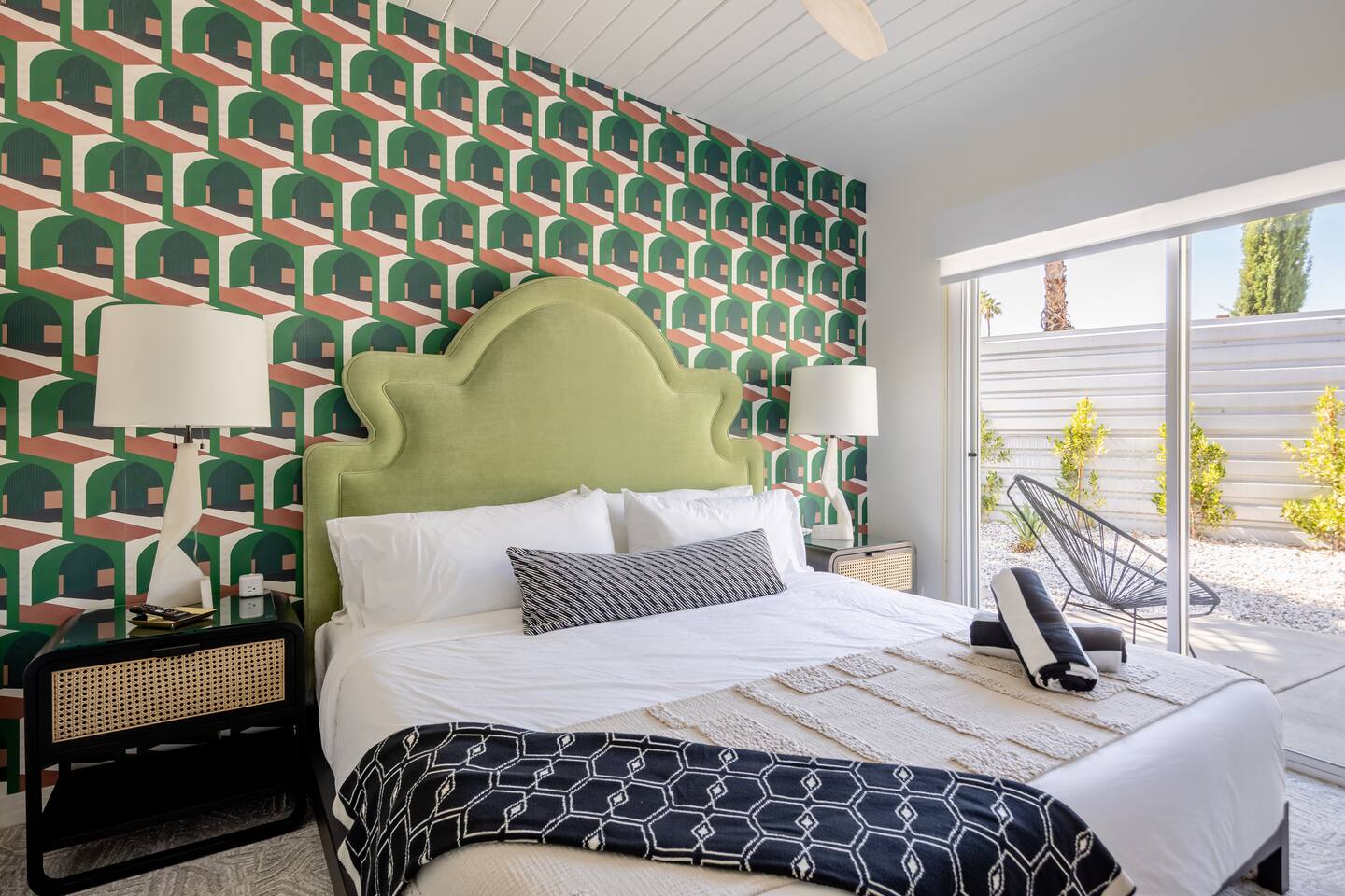 Entering The Pulp House discover a space where incredibly hip decor with slick blacks and cool greys, blush pinks, muted desert greens and earthy dark reds combine with fabulous amenities to create an unsurpassed vacation wonderland. The living room’s black stone fireplace and slate grey floor set the scene, while the chic palm tree wallpaper leaves you in no doubt you’re in Palm Springs. Here you’ll find comfortable lounge seating, a large wall mounted TV and glam dining area, all with expansive views to the pool and yard through the floor-to-ceiling full-width sliding glass doors. The adjacent fully-stocked gourmet kitchen offers everything you need whether you’re whipping up a tasty brunch or creating a cool cocktail-themed dinner party. You can take whatever you’re cooking to the great outdoors too, where the sparkling heated pool (if requested) and large spa await. With superb mountain views as a backdrop, you’ll also find an alfresco dining table, casual seating area, ample sun lounges to work on that desert tan, an outdoor shower and a monumental water feature to up the “Zen” factor. Speaking of Zen, there’s even a designated yoga spot, plus weights for a heavier workout. Accommodations The Pulp House offers sleeping accommodations for six people across three chic bedrooms, each with their own specific themes and decor… The Crane Suite With its ethereal flocks of crane birds featured on its wall paper, The Crane Suite is the home’s primary bedroom and offers a king bed with luxuriously soft mattress and Brooklinen linens, a wall mounted TV, and ample walk-in closet space for every one of your stylish outfits. It also features its own en-suite with walk in shower as well as a sliding door to a private patio area with room for your yoga practice. The Sunset Room The Sunset Room is a sun-filled space with a wall covering that is reminiscent of the Palm Springs sky at dusk. It includes a king-sized bed with Brooklinen linens, large wall-mounted TV, ample closet space for all your chic looks and a sliding door that leads directly to the outdoor area. The Boom Boom Room Named after the iconic lounge, The Boom Boom Room features a geometric-patterned wallpaper, a king bed with quality mattress and Brooklinen linens, wall mounted TV and abundant closet space. There’s also direct access to its own private terrace and the adjacent newly remodeled central bathroom. Uniquely, The Pulp House is all fact and no fiction as both a shoppable vacation rental and a hub for the Pulp team to experiment with designs that reimagine how people live within and interact with their interior spaces. So grab your cast and crew and head on over to The Pulp House - and don’t forget the pups because your four-legged family members are very welcome at the Pulp House too. Amenities: Accommodations for 6 King Beds with plush hotel quality mattresses 1 En-suite bathroom 1 Central bathroom Brooklinen linens TV’s in all bedrooms Private heated salt water pool (if requested with additional fees) Large spa (heating is on demand and included with your reservation) Outdoor shower and waterfall feature Pool towels and floatation toys 6 Sun lounges Ample shade umbrellas Fire pit with abundant seating Gas grill Outdoor dining area with seating for 8 Wall-mounted TV in the living room Fully equipped kitchen Dining table with seating for 6 Washer and dryer