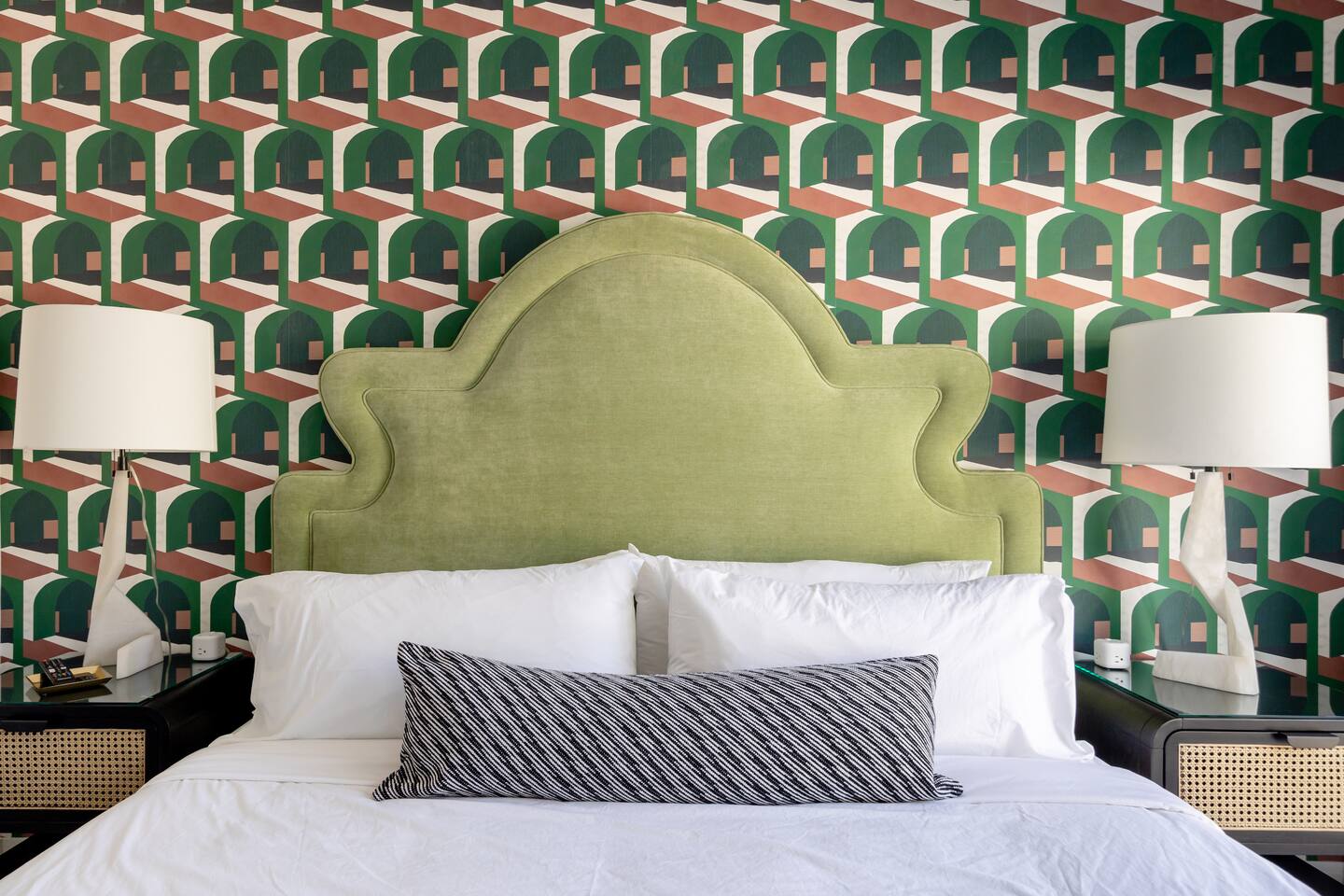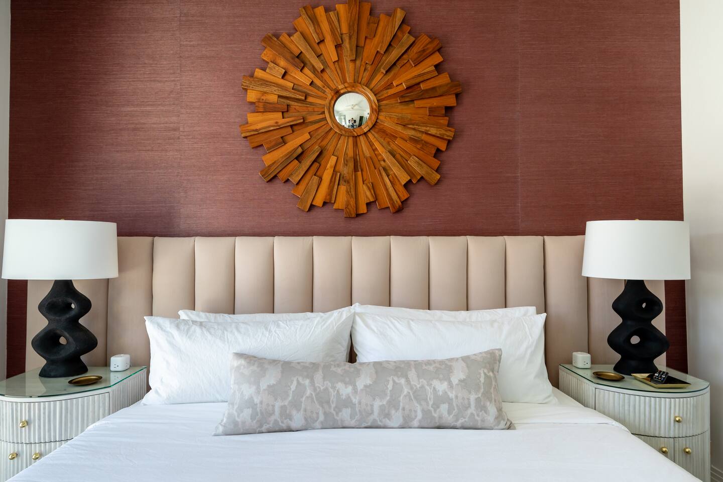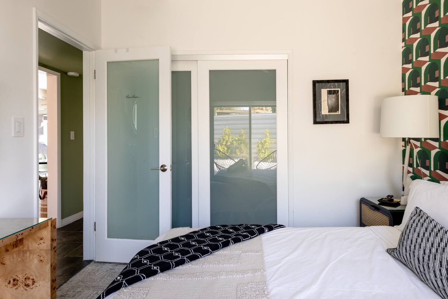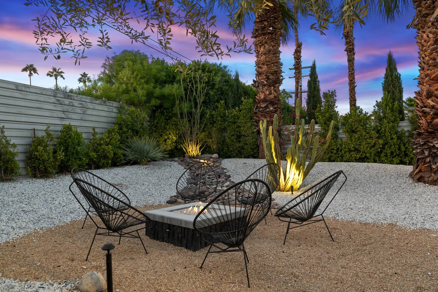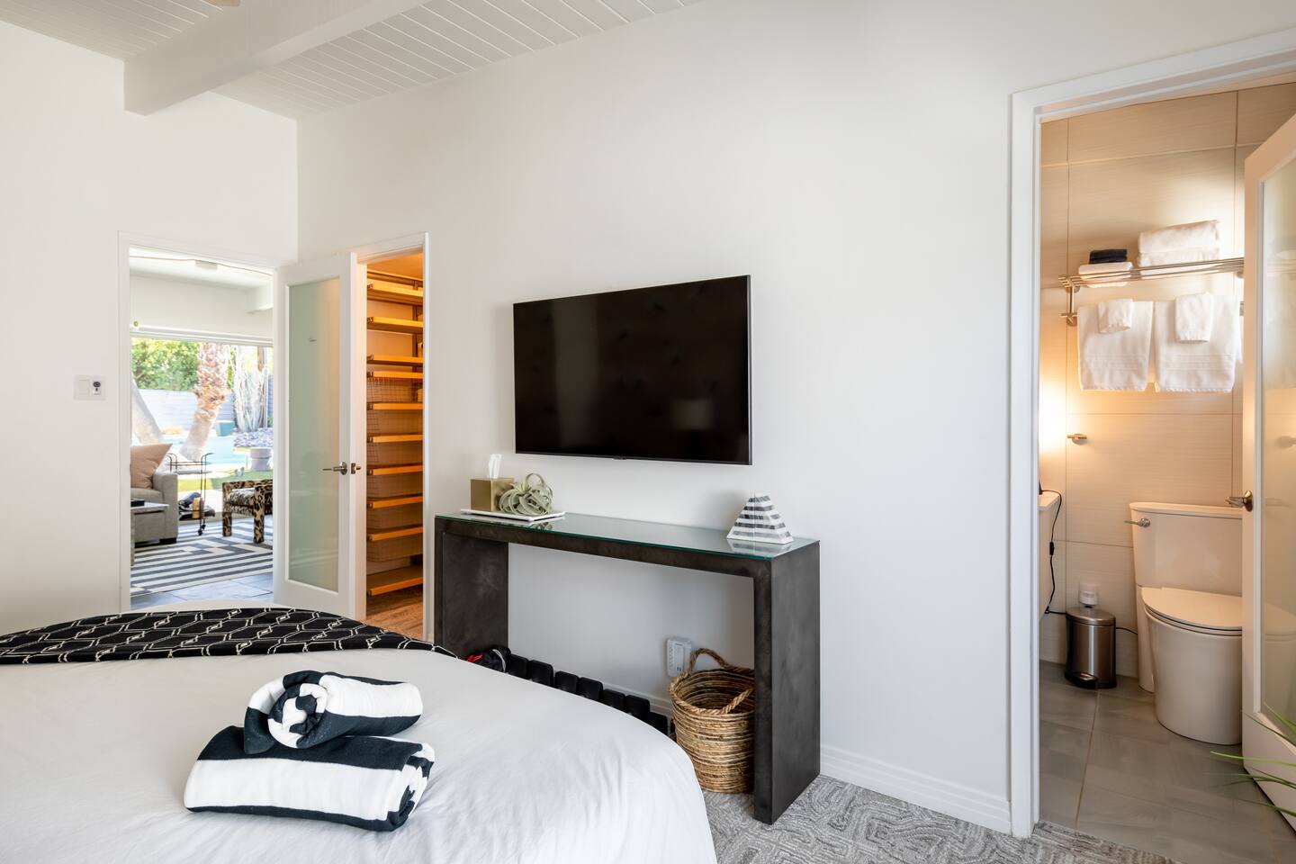 Entering The Pulp House discover a space where incredibly hip decor with slick blacks and cool greys, blush pinks, muted desert greens and earthy dark reds combine with fabulous amenities to create an unsurpassed vacation wonderland. The living room’s black stone fireplace and slate grey floor set the scene, while the chic palm tree wallpaper leaves you in no doubt you’re in Palm Springs. Here you’ll find comfortable lounge seating, a large wall mounted TV and glam dining area, all with expansive views to the pool and yard through the floor-to-ceiling full-width sliding glass doors. The adjacent fully-stocked gourmet kitchen offers everything you need whether you’re whipping up a tasty brunch or creating a cool cocktail-themed dinner party. You can take whatever you’re cooking to the great outdoors too, where the sparkling heated pool (if requested) and large spa await. With superb mountain views as a backdrop, you’ll also find an alfresco dining table, casual seating area, ample sun lounges to work on that desert tan, an outdoor shower and a monumental water feature to up the “Zen” factor. Speaking of Zen, there’s even a designated yoga spot, plus weights for a heavier workout. Accommodations The Pulp House offers sleeping accommodations for six people across three chic bedrooms, each with their own specific themes and decor… The Crane Suite With its ethereal flocks of crane birds featured on its wall paper, The Crane Suite is the home’s primary bedroom and offers a king bed with luxuriously soft mattress and Brooklinen linens, a wall mounted TV, and ample walk-in closet space for every one of your stylish outfits. It also features its own en-suite with walk in shower as well as a sliding door to a private patio area with room for your yoga practice. The Sunset Room The Sunset Room is a sun-filled space with a wall covering that is reminiscent of the Palm Springs sky at dusk. It includes a king-sized bed with Brooklinen linens, large wall-mounted TV, ample closet space for all your chic looks and a sliding door that leads directly to the outdoor area. The Boom Boom Room Named after the iconic lounge, The Boom Boom Room features a geometric-patterned wallpaper, a king bed with quality mattress and Brooklinen linens, wall mounted TV and abundant closet space. There’s also direct access to its own private terrace and the adjacent newly remodeled central bathroom. Uniquely, The Pulp House is all fact and no fiction as both a shoppable vacation rental and a hub for the Pulp team to experiment with designs that reimagine how people live within and interact with their interior spaces. So grab your cast and crew and head on over to The Pulp House - and don’t forget the pups because your four-legged family members are very welcome at the Pulp House too. Amenities: Accommodations for 6 King Beds with plush hotel quality mattresses 1 En-suite bathroom 1 Central bathroom Brooklinen linens TV’s in all bedrooms Private heated salt water pool (if requested with additional fees) Large spa (heating is on demand and included with your reservation) Outdoor shower and waterfall feature Pool towels and floatation toys 6 Sun lounges Ample shade umbrellas Fire pit with abundant seating Gas grill Outdoor dining area with seating for 8 Wall-mounted TV in the living room Fully equipped kitchen Dining table with seating for 6 Washer and dryer