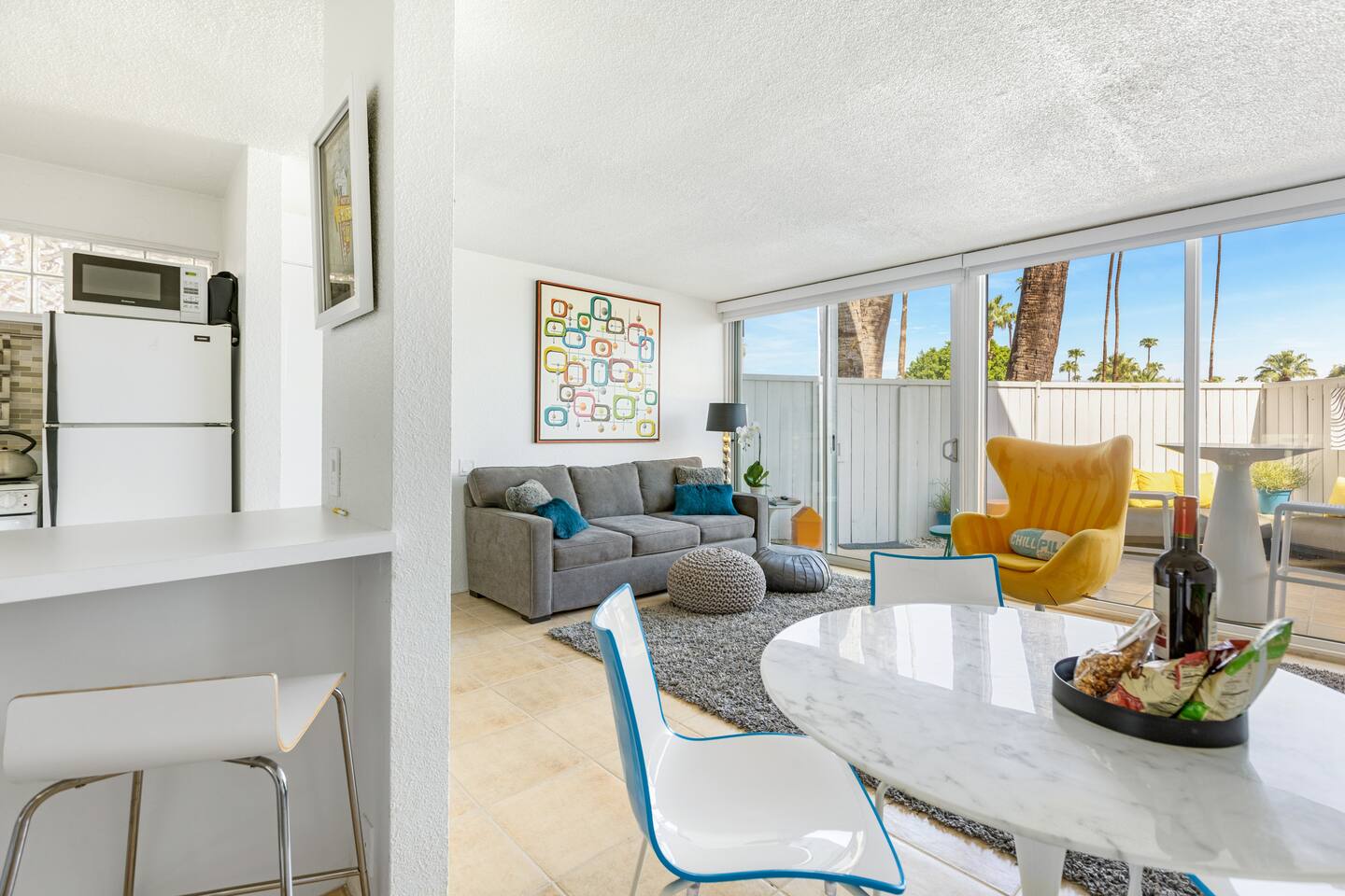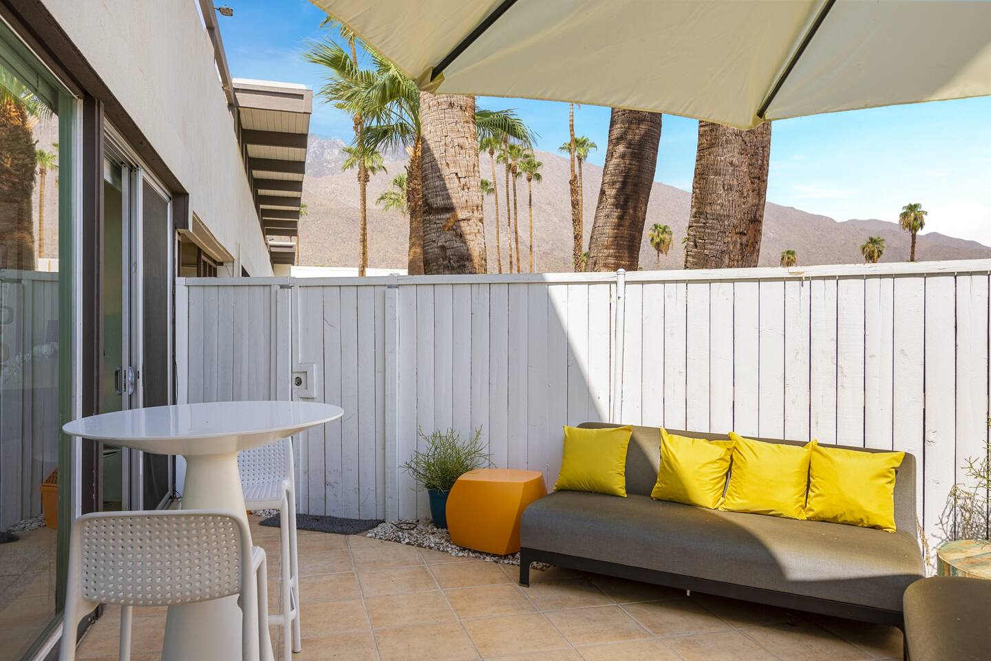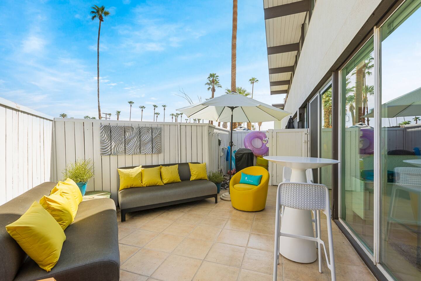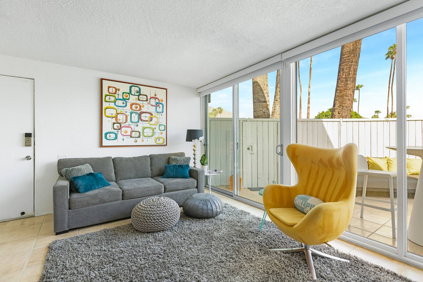 This popular rental is a Modern, colorful one bedroom hotel-like suite in the incredible Ocotillo Lodge, a mid-century classic with historic roots and a HUGE champagne-cork shaped pool (with two hot tubs!), two bar areas, and gym! Air conditioning and an indoor/outdoor private patio which make this a unique unit. Live in the lap of the palm trees in the heart of 350 days of sunshine and poolside life. PS City ID #004255