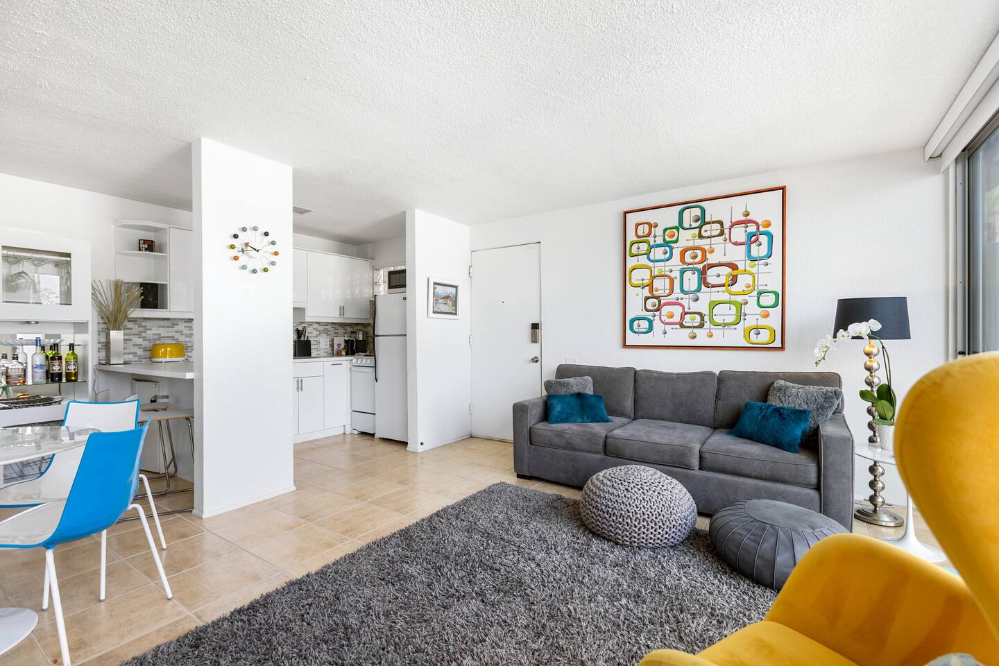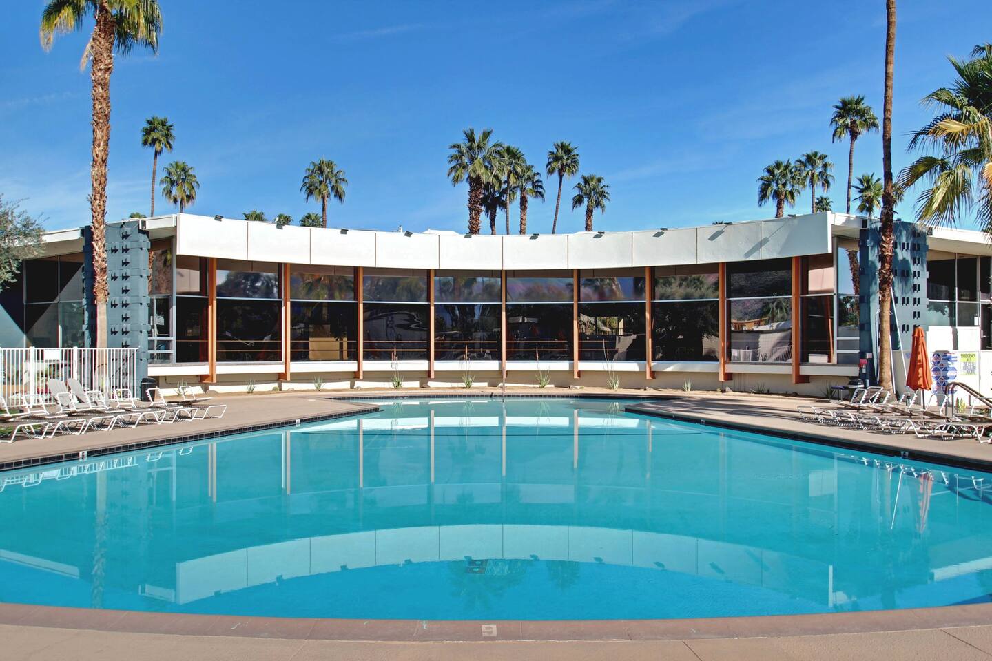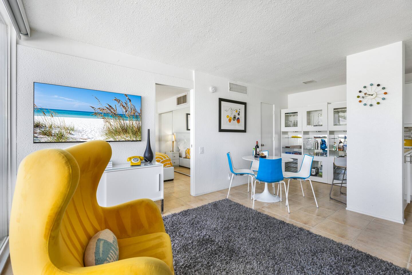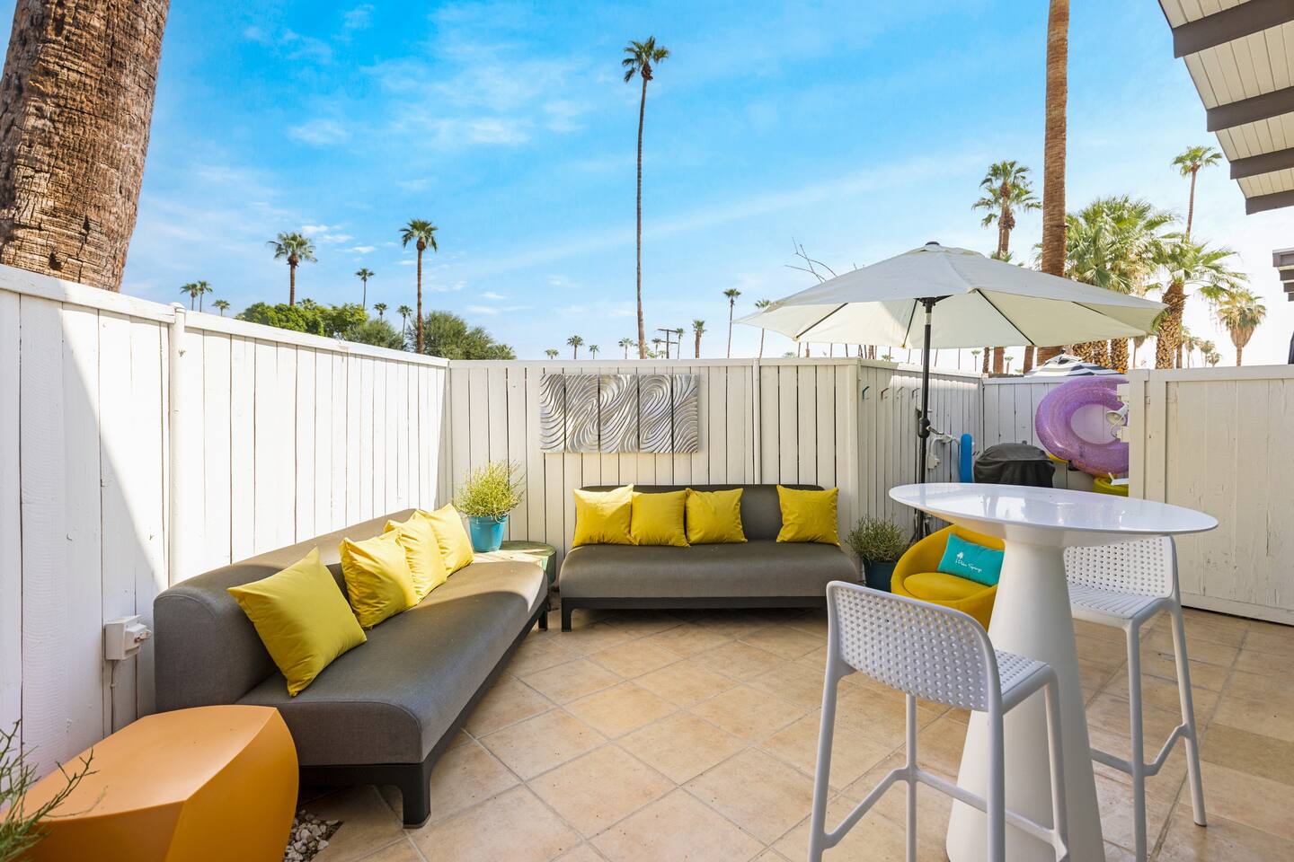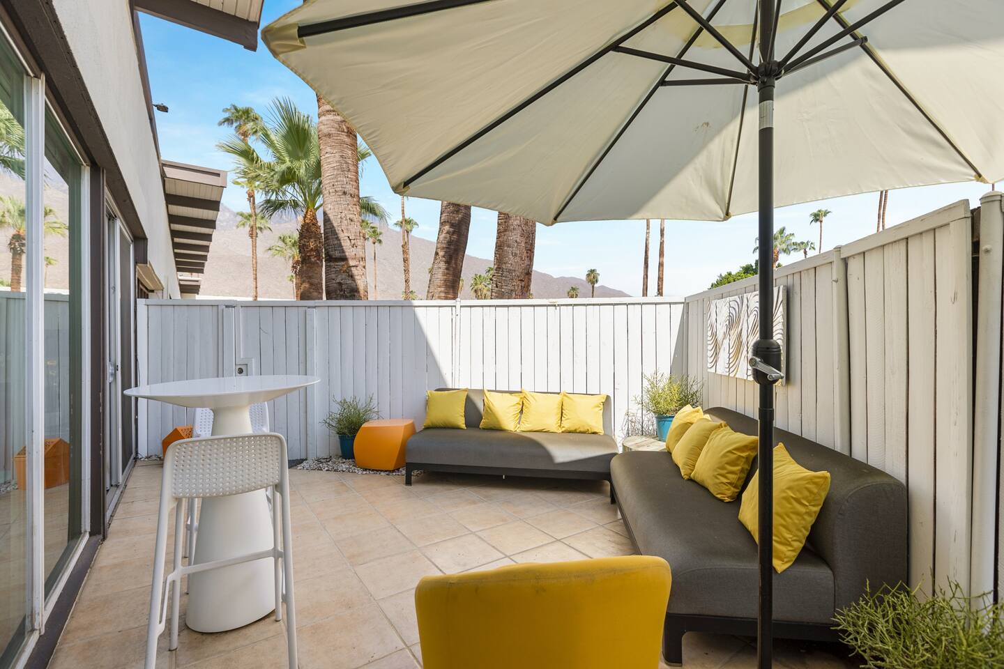 This popular rental is a Modern, colorful one bedroom hotel-like suite in the incredible Ocotillo Lodge, a mid-century classic with historic roots and a HUGE champagne-cork shaped pool (with two hot tubs!), two bar areas, and gym! Air conditioning and an indoor/outdoor private patio which make this a unique unit. Live in the lap of the palm trees in the heart of 350 days of sunshine and poolside life. PS City ID #004255