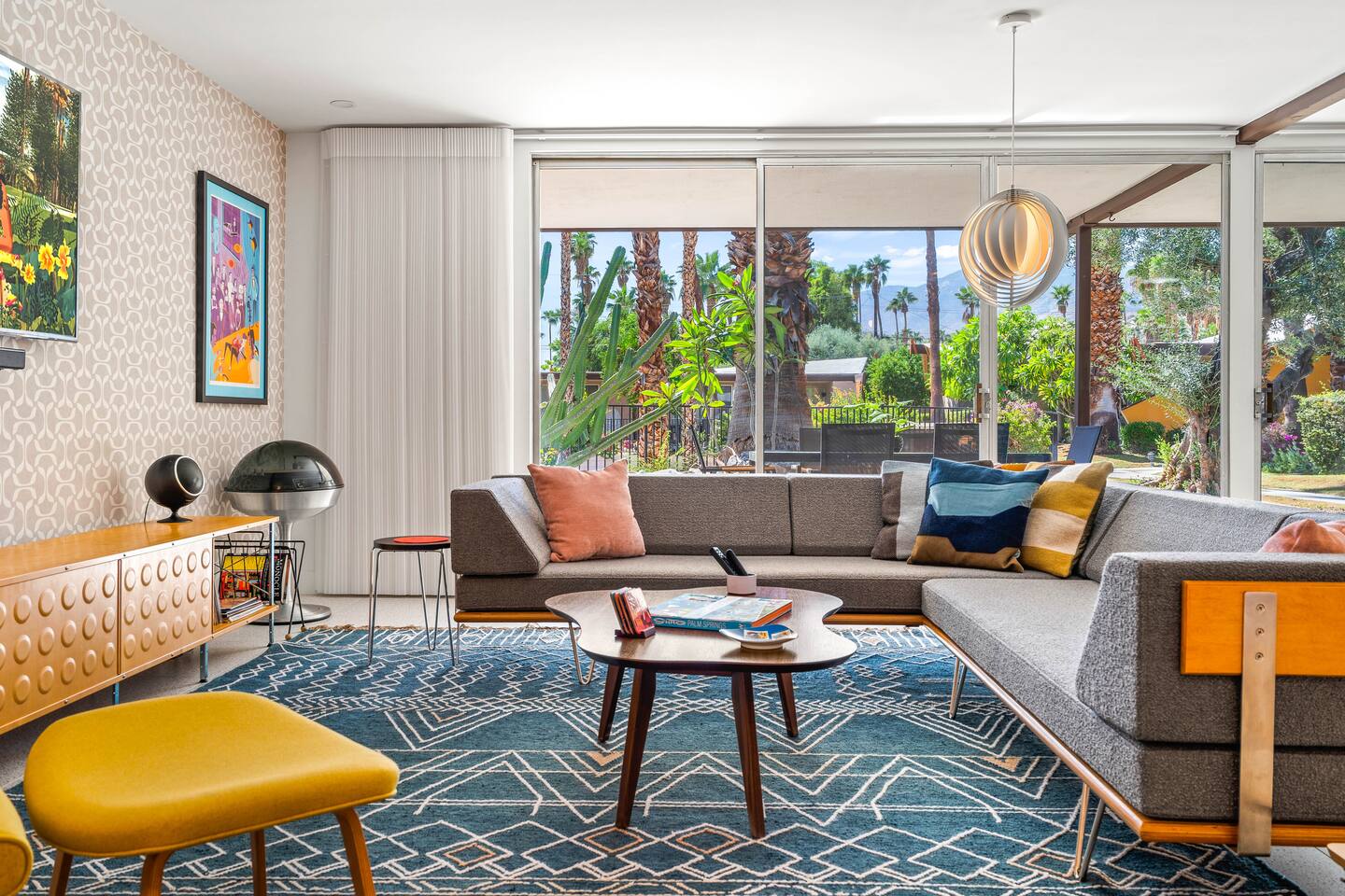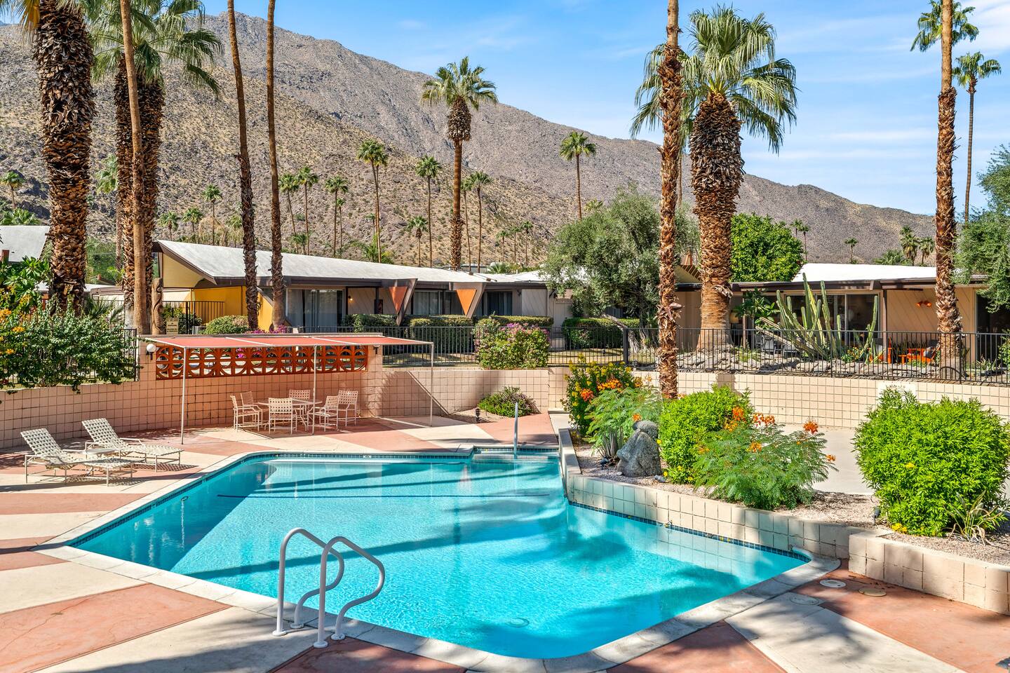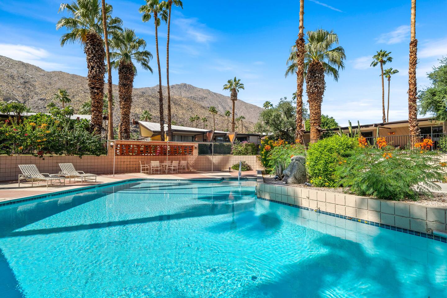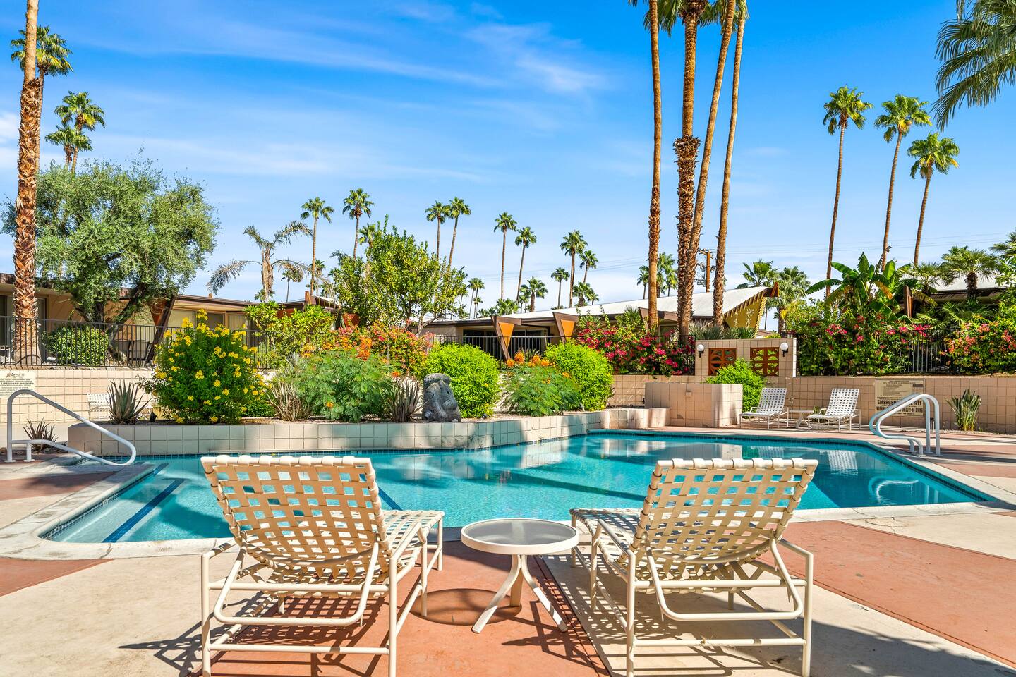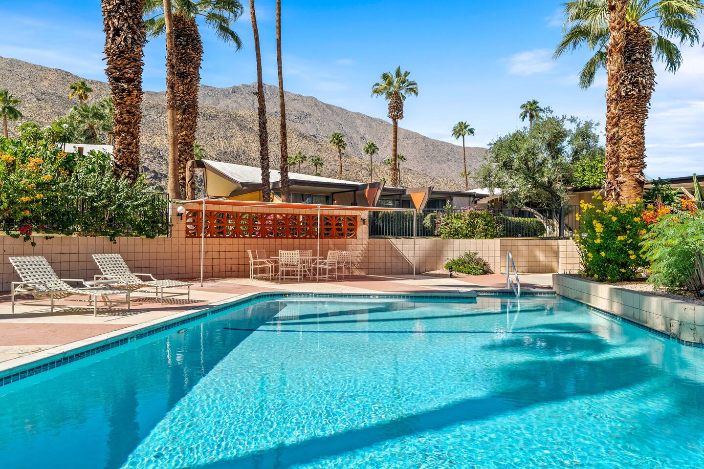 This stunning two-bedroom condo is in the landmark Royal Hawaiian Estates, Palm Springs’ first designated Class 1 Historic Residential District. This home boasts vintage and new modernist furnishings, lighting and artwork from Modernica, Blue Dot, Herman Miller, Eero Saarinen, Vernor Panton, George Nelson, Alexander Girard, Shag, William Krisel and Gary Wexler. As you approach the Royal Hawaiian, you’ll notice the tropics-influenced architecture. Bright oranges and yellows accent jungle browns. The famous “flying sevens” are a stunning detail, capping each building with outrigger-inspired eye candy. Enter the oasis-like grounds and notice the many tiki gods standing amidst the tropical and desert flora to welcome you. When you cross the threshold into this beautiful home, the thoughtful mid-century modern look and décor will make you “aha” as you realize the perfection of the name Tropical Modernism. And the view — just look at those photos! Situated at the foot of the majestic San Jacinto mountains at the prized south end of Palm Springs, the desert scenery and vibe will sooth you better than any cocktail...but why not have a Mai Tai?! Accommodations: Enter the spacious living room and be wowed by the clever combination of vintage and new modern furniture and décor. The soft ochre hues immediately begin to relax you. The navy, patterned rug guides your eye to the television wall and its wonderfully accented wallpaper. Whimsical art, a Vintage Electrohome Apollo 711 Turntable & Ball Speakers (1971), and a yellow Grasshopper Chair & Ottoman designed by Eero Saarinen beckon you to relax. Terrazzo floor tiles lead you around to the dining area where you’ll find a classic Saarinen pedestal table and tulip chairs. The kitchen, again in that soothing ochre with clean white accents, is a perfect combination of original mid-century style plus modern appliances. Open the sliding patio door and be transported to paradise! Your patio overlooks one of the 2 pools at Royal Hawaiian, visible through the lush tropical foliage that provides you with privacy. And you are just steps away from the hot tub! Make your way to the master bedroom suite where the Modernica king bed and Brooklinen linens will lull you to sleep, then awaken to the beautiful nature just outside another sliding door to the patio. A "Stash" desk and chair are available for any work from home needs. And dig the unchanged ensuite bath with its original sunken Roman bath! The second bedroom also features fun wallpaper, Mode Desk by Herman Miller and chair for any work from home needs, and the hotel quality queen bed and Brooklinen linens will send you to dreamland. So mix up a tiki drink, lounge poolside, and bask in the serene beauty that is Tropical Modernism at the Royal Hawaiian Estates! Amenities: • Accommodations for 4 (plus 2 kids on the day beds) • 2 bedrooms (1 King and 1 Queen) with plush, hotel quality mattresses • 1 ensuite master bathroom • 1 central bathroom • Brooklinen luxury linens • Two heated community pools and a hot tub with stunning mountain views • Gas grill • Wall-mounted TV in the living room • Fully equipped kitchen • Dining table with seating for 4 as well as island seating for 3 • Private patio with dining table with seating for 6 as well as 2 Adirondack chairs • Washer and dryer in the condo • Your own car port plus extra on-site parking for up to two more cars