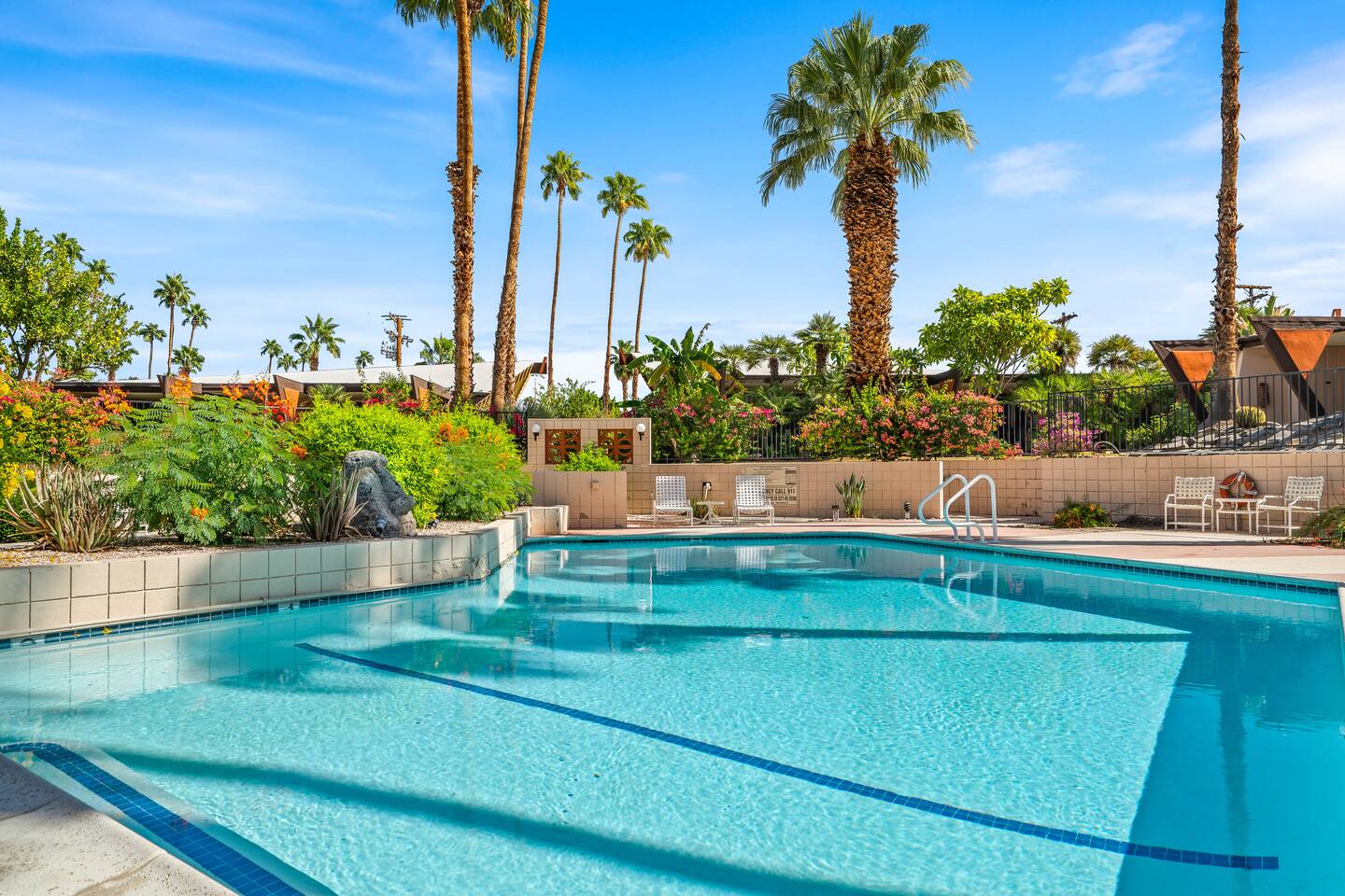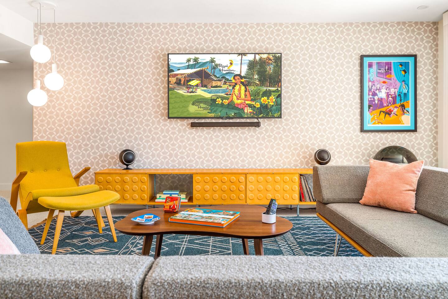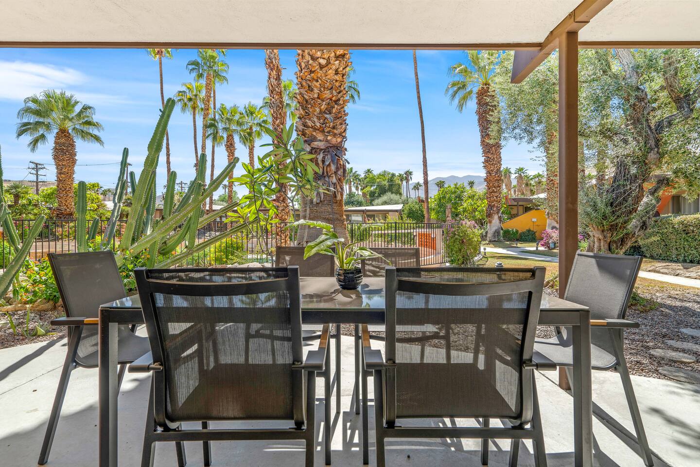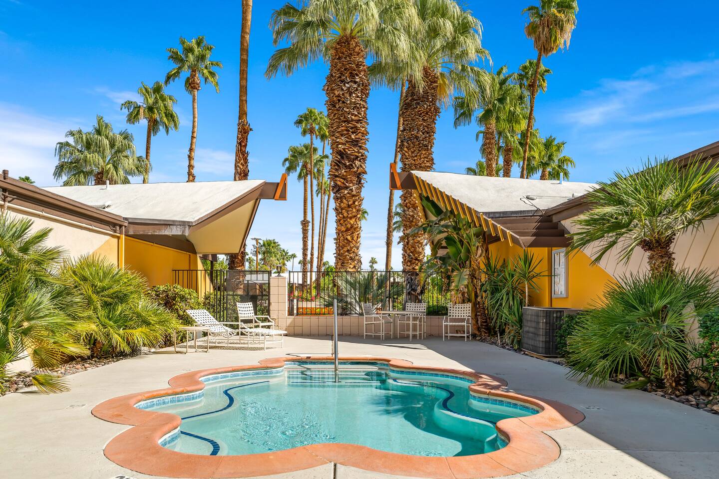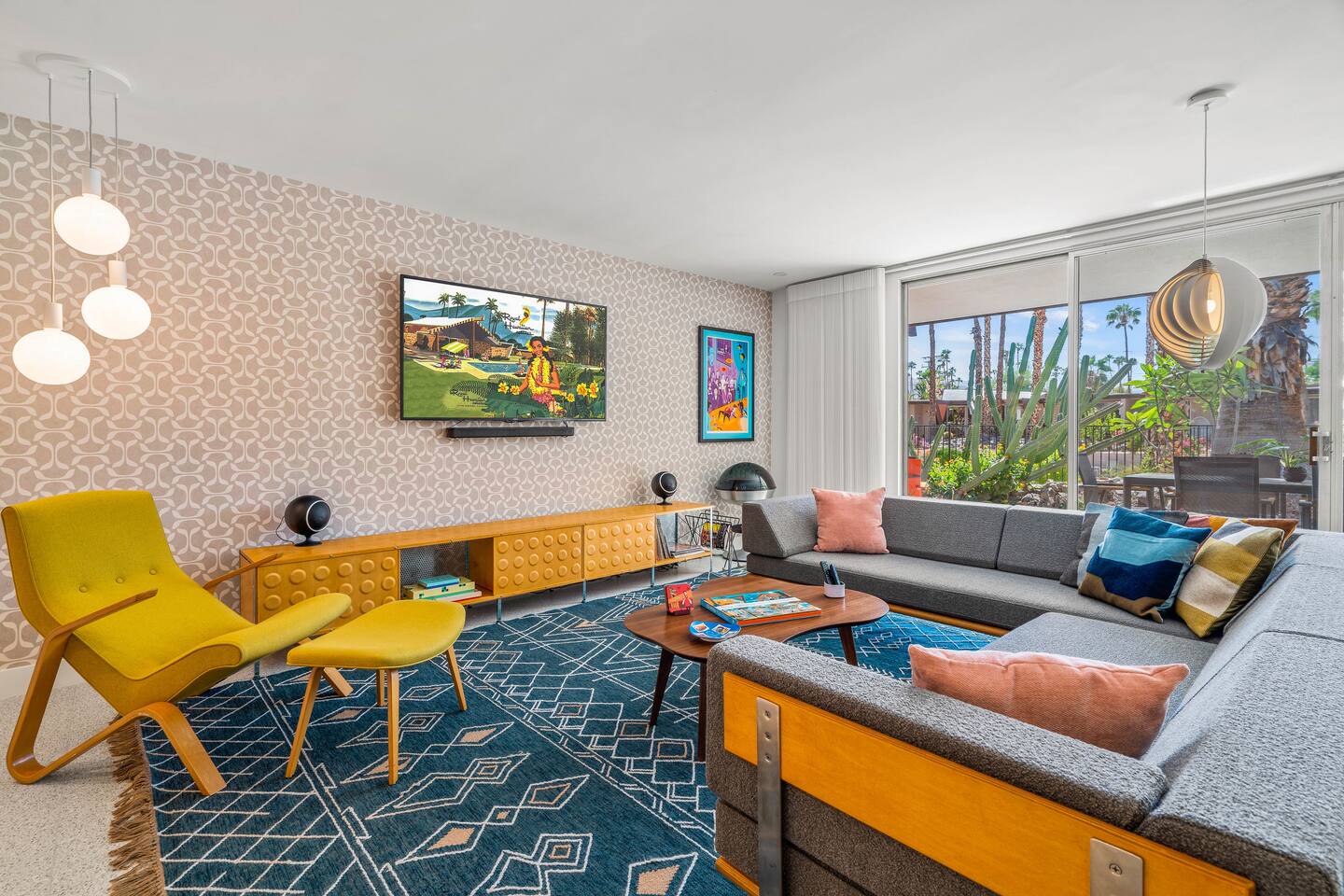 This stunning two-bedroom condo is in the landmark Royal Hawaiian Estates, Palm Springs’ first designated Class 1 Historic Residential District. This home boasts vintage and new modernist furnishings, lighting and artwork from Modernica, Blue Dot, Herman Miller, Eero Saarinen, Vernor Panton, George Nelson, Alexander Girard, Shag, William Krisel and Gary Wexler. As you approach the Royal Hawaiian, you’ll notice the tropics-influenced architecture. Bright oranges and yellows accent jungle browns. The famous “flying sevens” are a stunning detail, capping each building with outrigger-inspired eye candy. Enter the oasis-like grounds and notice the many tiki gods standing amidst the tropical and desert flora to welcome you. When you cross the threshold into this beautiful home, the thoughtful mid-century modern look and décor will make you “aha” as you realize the perfection of the name Tropical Modernism. And the view — just look at those photos! Situated at the foot of the majestic San Jacinto mountains at the prized south end of Palm Springs, the desert scenery and vibe will sooth you better than any cocktail...but why not have a Mai Tai?! Accommodations: Enter the spacious living room and be wowed by the clever combination of vintage and new modern furniture and décor. The soft ochre hues immediately begin to relax you. The navy, patterned rug guides your eye to the television wall and its wonderfully accented wallpaper. Whimsical art, a Vintage Electrohome Apollo 711 Turntable & Ball Speakers (1971), and a yellow Grasshopper Chair & Ottoman designed by Eero Saarinen beckon you to relax. Terrazzo floor tiles lead you around to the dining area where you’ll find a classic Saarinen pedestal table and tulip chairs. The kitchen, again in that soothing ochre with clean white accents, is a perfect combination of original mid-century style plus modern appliances. Open the sliding patio door and be transported to paradise! Your patio overlooks one of the 2 pools at Royal Hawaiian, visible through the lush tropical foliage that provides you with privacy. And you are just steps away from the hot tub! Make your way to the master bedroom suite where the Modernica king bed and Brooklinen linens will lull you to sleep, then awaken to the beautiful nature just outside another sliding door to the patio. A "Stash" desk and chair are available for any work from home needs. And dig the unchanged ensuite bath with its original sunken Roman bath! The second bedroom also features fun wallpaper, Mode Desk by Herman Miller and chair for any work from home needs, and the hotel quality queen bed and Brooklinen linens will send you to dreamland. So mix up a tiki drink, lounge poolside, and bask in the serene beauty that is Tropical Modernism at the Royal Hawaiian Estates! Amenities: • Accommodations for 4 (plus 2 kids on the day beds) • 2 bedrooms (1 King and 1 Queen) with plush, hotel quality mattresses • 1 ensuite master bathroom • 1 central bathroom • Brooklinen luxury linens • Two heated community pools and a hot tub with stunning mountain views • Gas grill • Wall-mounted TV in the living room • Fully equipped kitchen • Dining table with seating for 4 as well as island seating for 3 • Private patio with dining table with seating for 6 as well as 2 Adirondack chairs • Washer and dryer in the condo • Your own car port plus extra on-site parking for up to two more cars
