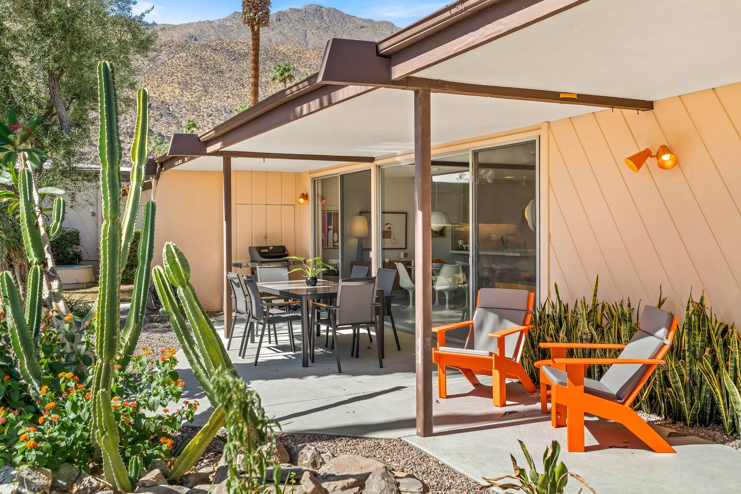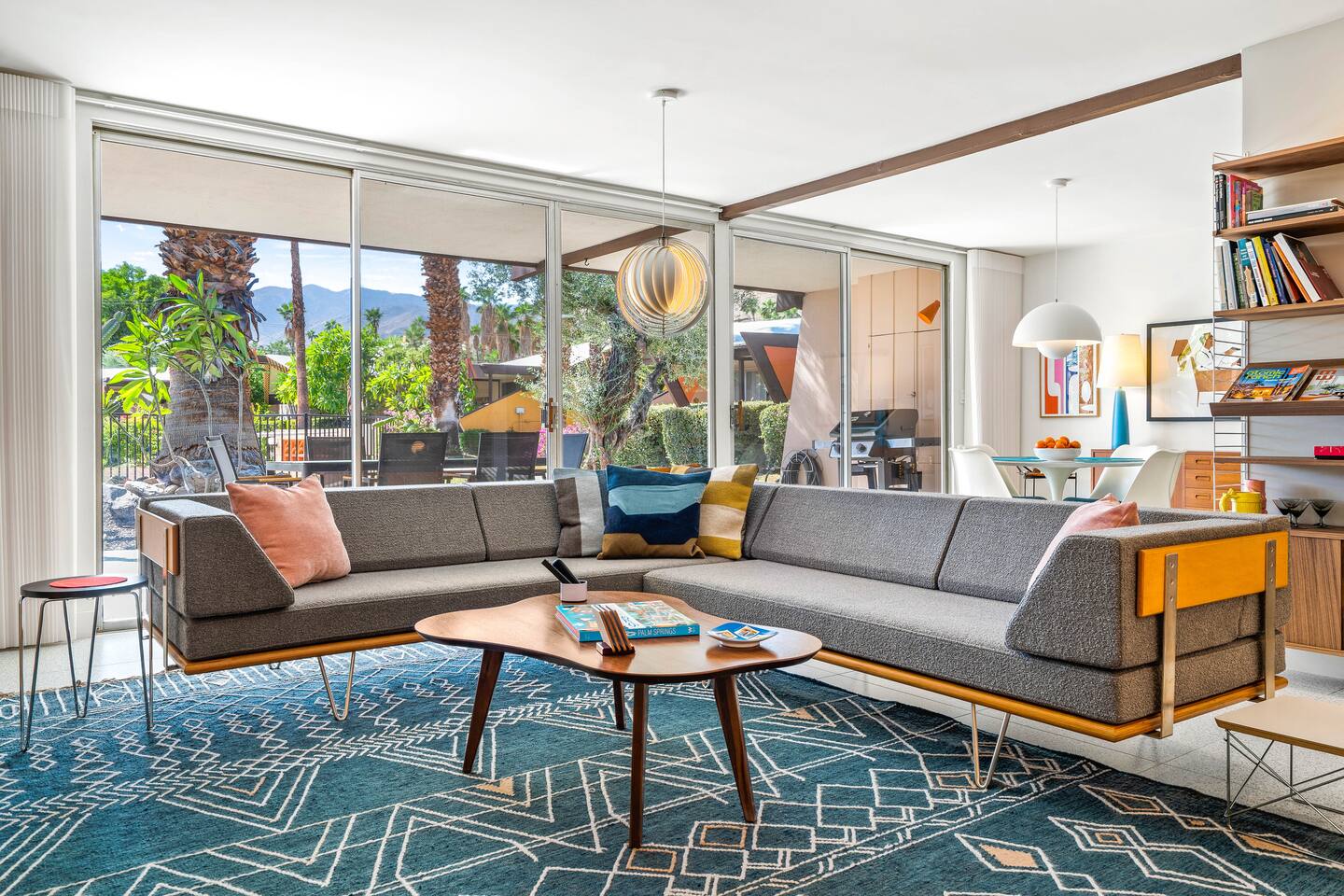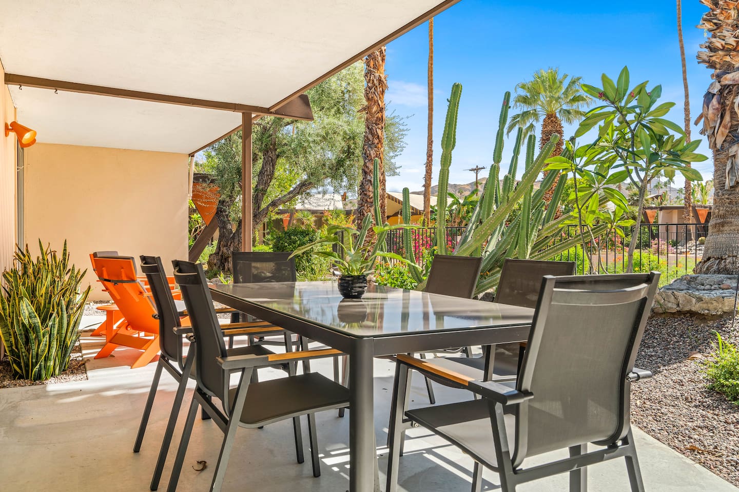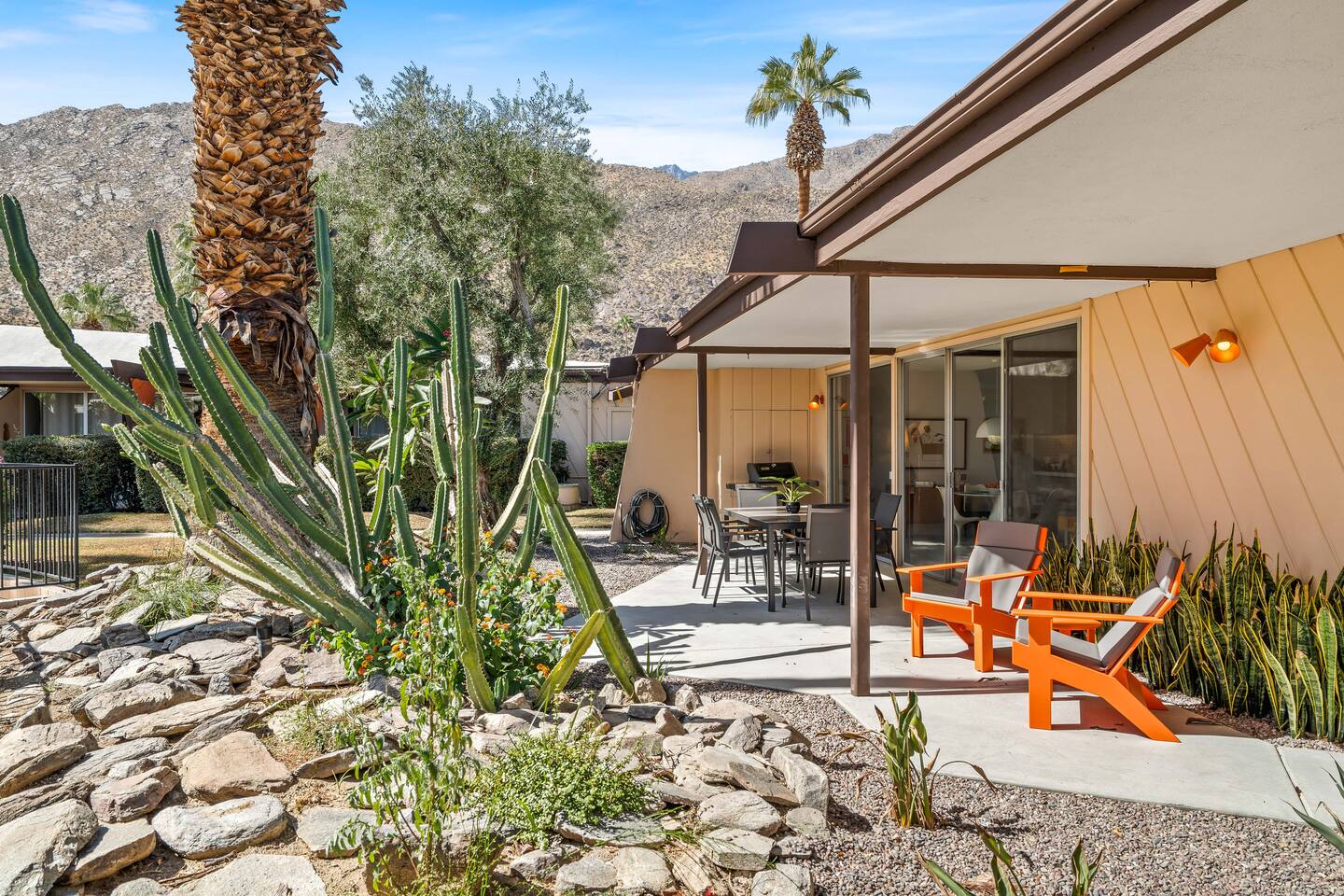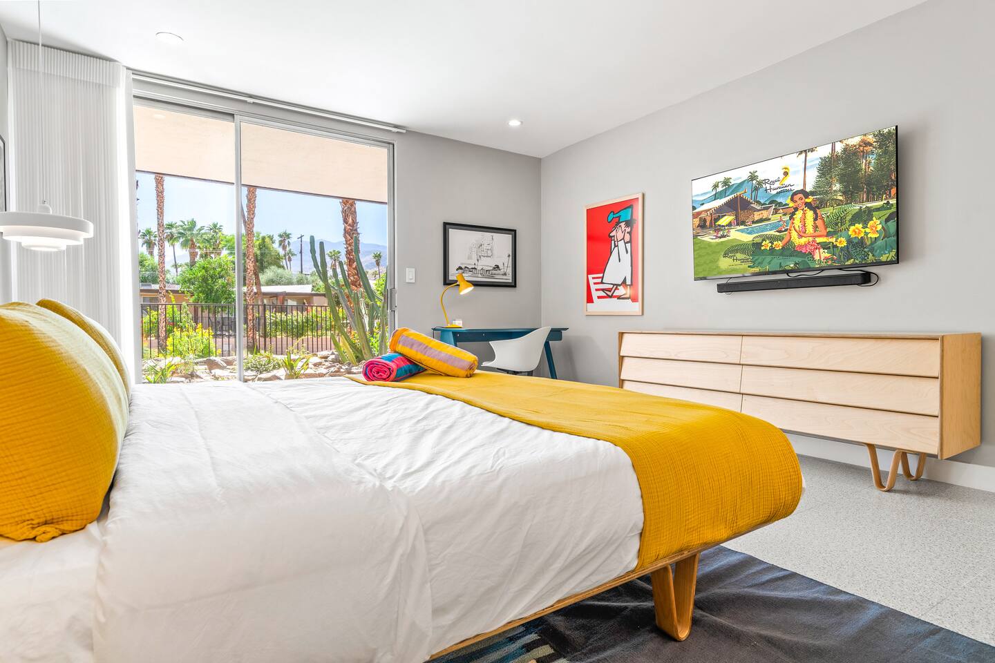 This stunning two-bedroom condo is in the landmark Royal Hawaiian Estates, Palm Springs’ first designated Class 1 Historic Residential District. This home boasts vintage and new modernist furnishings, lighting and artwork from Modernica, Blue Dot, Herman Miller, Eero Saarinen, Vernor Panton, George Nelson, Alexander Girard, Shag, William Krisel and Gary Wexler. As you approach the Royal Hawaiian, you’ll notice the tropics-influenced architecture. Bright oranges and yellows accent jungle browns. The famous “flying sevens” are a stunning detail, capping each building with outrigger-inspired eye candy. Enter the oasis-like grounds and notice the many tiki gods standing amidst the tropical and desert flora to welcome you. When you cross the threshold into this beautiful home, the thoughtful mid-century modern look and décor will make you “aha” as you realize the perfection of the name Tropical Modernism. And the view — just look at those photos! Situated at the foot of the majestic San Jacinto mountains at the prized south end of Palm Springs, the desert scenery and vibe will sooth you better than any cocktail...but why not have a Mai Tai?! Accommodations: Enter the spacious living room and be wowed by the clever combination of vintage and new modern furniture and décor. The soft ochre hues immediately begin to relax you. The navy, patterned rug guides your eye to the television wall and its wonderfully accented wallpaper. Whimsical art, a Vintage Electrohome Apollo 711 Turntable & Ball Speakers (1971), and a yellow Grasshopper Chair & Ottoman designed by Eero Saarinen beckon you to relax. Terrazzo floor tiles lead you around to the dining area where you’ll find a classic Saarinen pedestal table and tulip chairs. The kitchen, again in that soothing ochre with clean white accents, is a perfect combination of original mid-century style plus modern appliances. Open the sliding patio door and be transported to paradise! Your patio overlooks one of the 2 pools at Royal Hawaiian, visible through the lush tropical foliage that provides you with privacy. And you are just steps away from the hot tub! Make your way to the master bedroom suite where the Modernica king bed and Brooklinen linens will lull you to sleep, then awaken to the beautiful nature just outside another sliding door to the patio. A "Stash" desk and chair are available for any work from home needs. And dig the unchanged ensuite bath with its original sunken Roman bath! The second bedroom also features fun wallpaper, Mode Desk by Herman Miller and chair for any work from home needs, and the hotel quality queen bed and Brooklinen linens will send you to dreamland. So mix up a tiki drink, lounge poolside, and bask in the serene beauty that is Tropical Modernism at the Royal Hawaiian Estates! Amenities: • Accommodations for 4 (plus 2 kids on the day beds) • 2 bedrooms (1 King and 1 Queen) with plush, hotel quality mattresses • 1 ensuite master bathroom • 1 central bathroom • Brooklinen luxury linens • Two heated community pools and a hot tub with stunning mountain views • Gas grill • Wall-mounted TV in the living room • Fully equipped kitchen • Dining table with seating for 4 as well as island seating for 3 • Private patio with dining table with seating for 6 as well as 2 Adirondack chairs • Washer and dryer in the condo • Your own car port plus extra on-site parking for up to two more cars