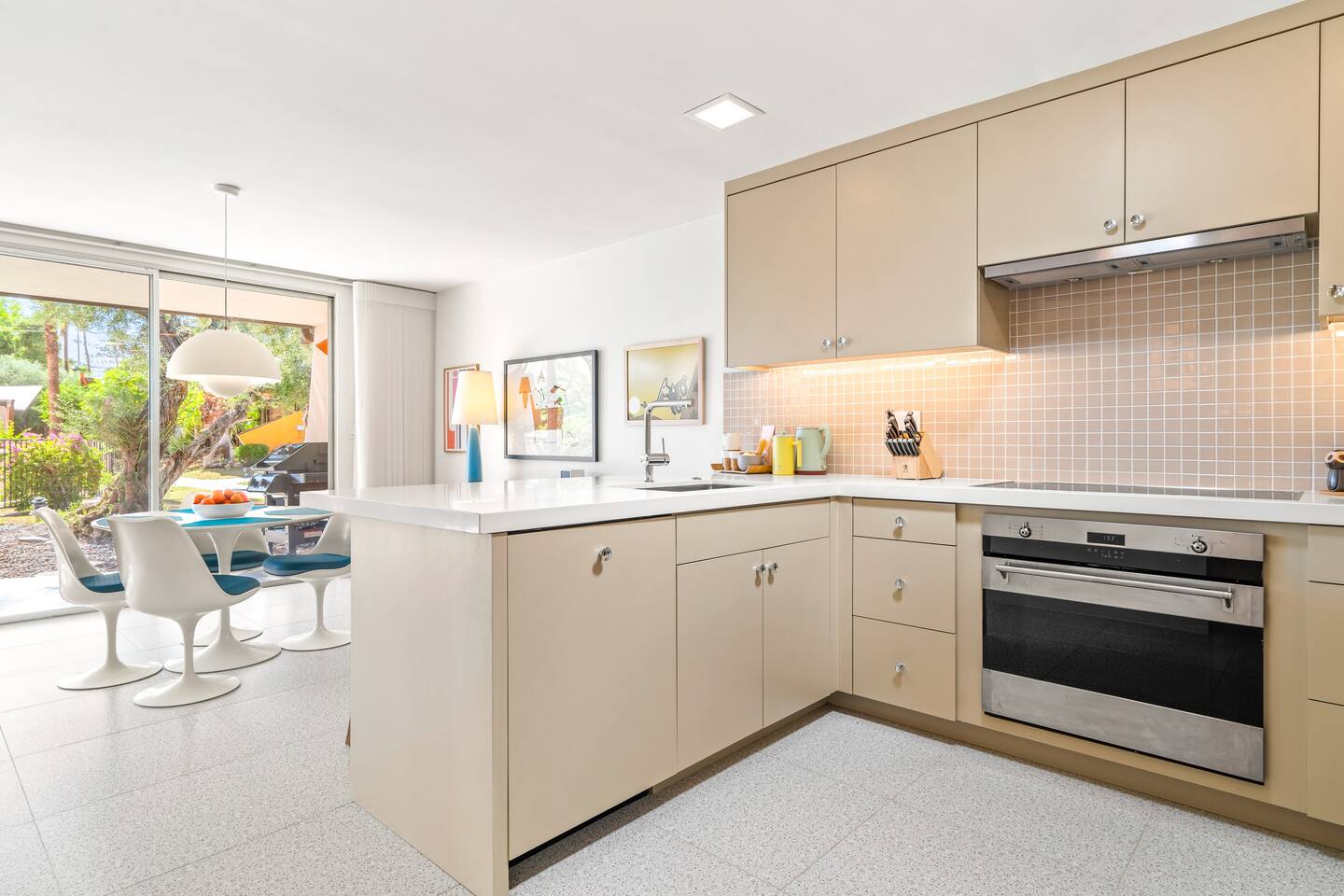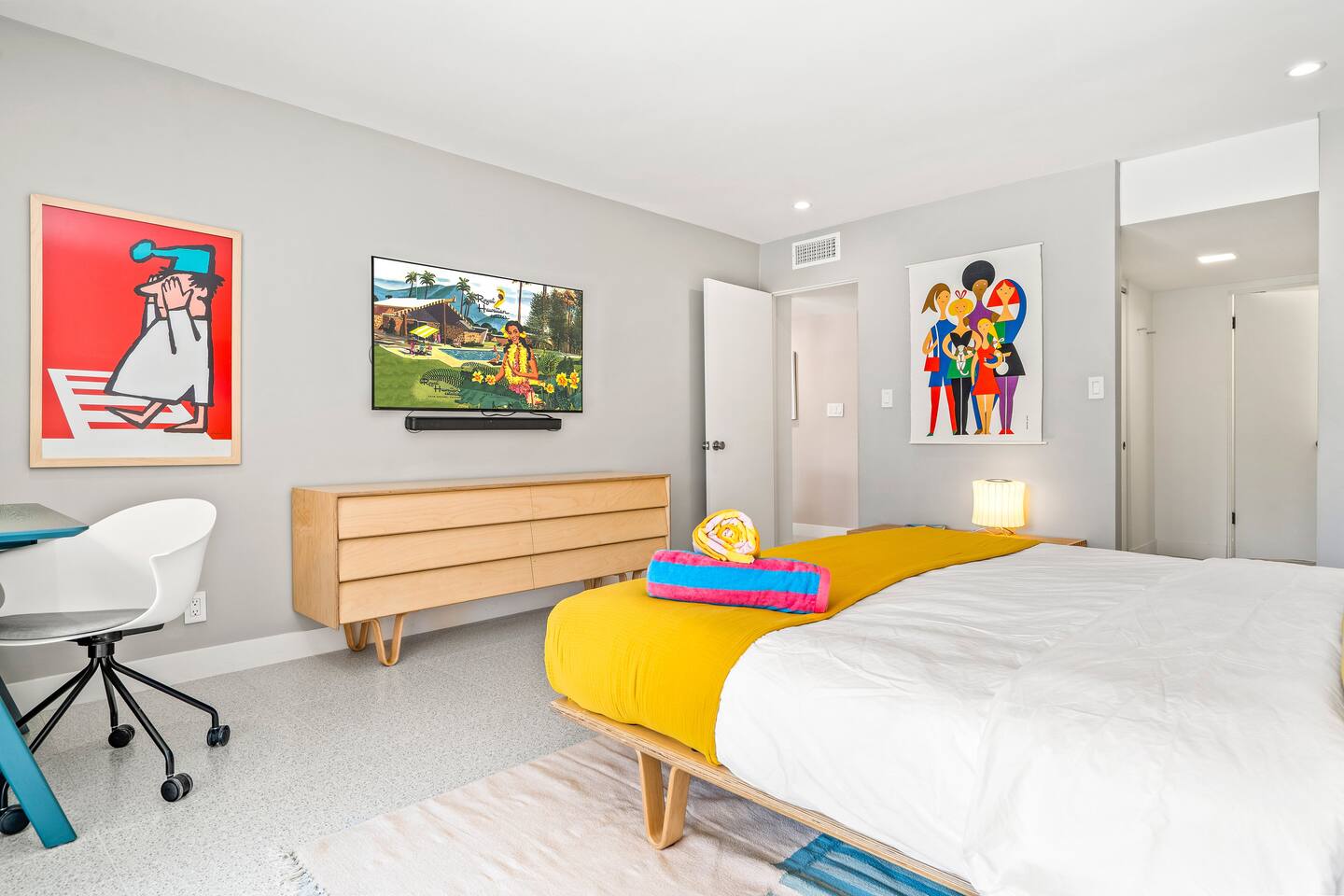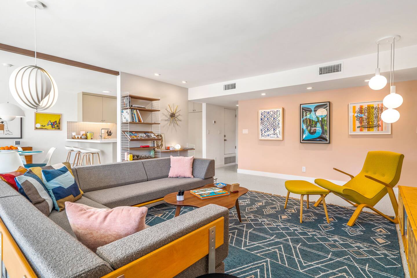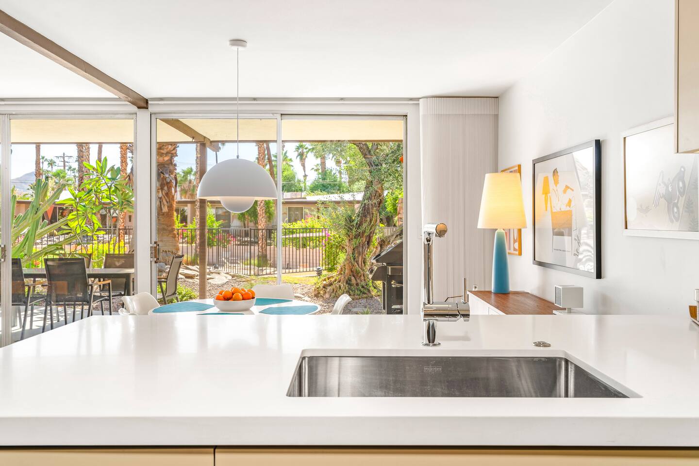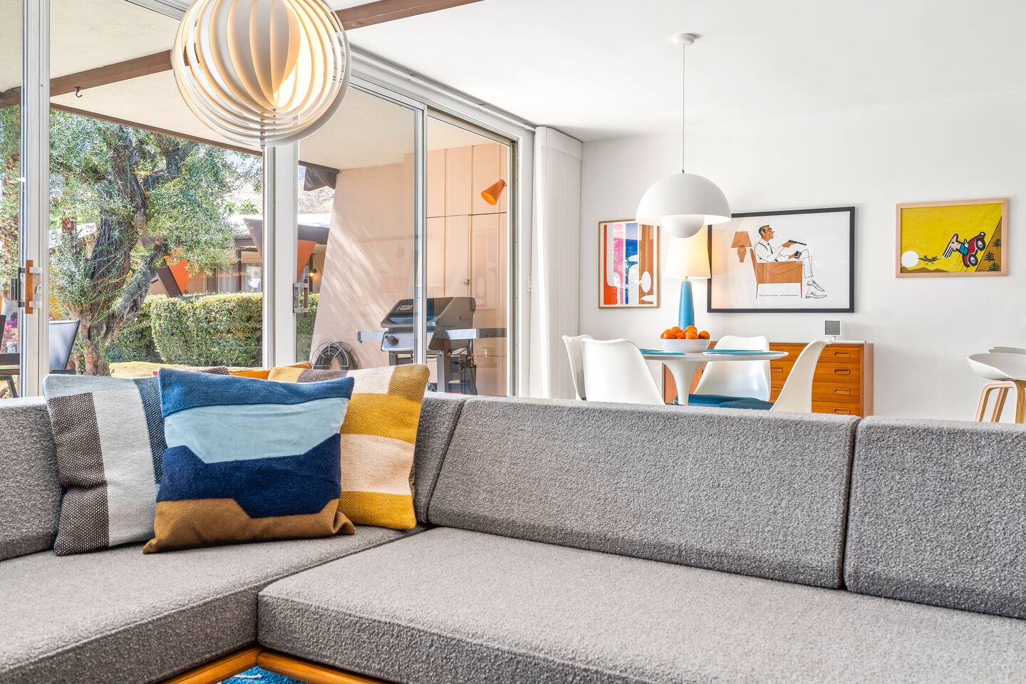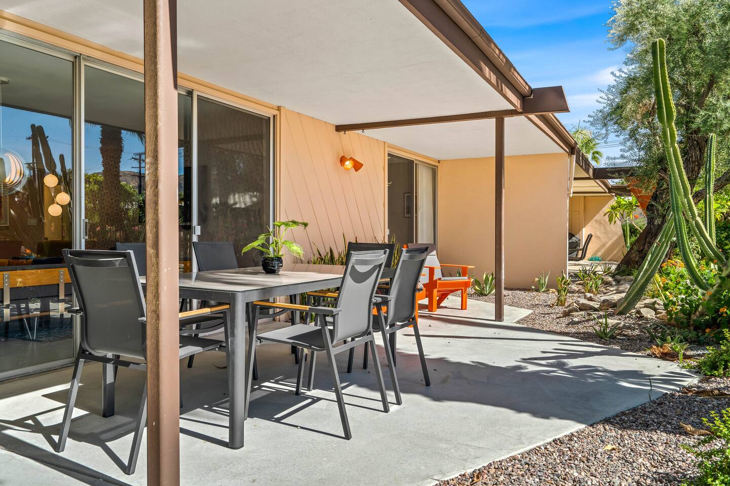This stunning two-bedroom condo is in the landmark Royal Hawaiian Estates, Palm Springs’ first designated Class 1 Historic Residential District. This home boasts vintage and new modernist furnishings, lighting and artwork from Modernica, Blue Dot, Herman Miller, Eero Saarinen, Vernor Panton, George Nelson, Alexander Girard, Shag, William Krisel and Gary Wexler. As you approach the Royal Hawaiian, you’ll notice the tropics-influenced architecture. Bright oranges and yellows accent jungle browns. The famous “flying sevens” are a stunning detail, capping each building with outrigger-inspired eye candy. Enter the oasis-like grounds and notice the many tiki gods standing amidst the tropical and desert flora to welcome you. When you cross the threshold into this beautiful home, the thoughtful mid-century modern look and décor will make you “aha” as you realize the perfection of the name Tropical Modernism. And the view — just look at those photos! Situated at the foot of the majestic San Jacinto mountains at the prized south end of Palm Springs, the desert scenery and vibe will sooth you better than any cocktail...but why not have a Mai Tai?! Accommodations: Enter the spacious living room and be wowed by the clever combination of vintage and new modern furniture and décor. The soft ochre hues immediately begin to relax you. The navy, patterned rug guides your eye to the television wall and its wonderfully accented wallpaper. Whimsical art, a Vintage Electrohome Apollo 711 Turntable & Ball Speakers (1971), and a yellow Grasshopper Chair & Ottoman designed by Eero Saarinen beckon you to relax. Terrazzo floor tiles lead you around to the dining area where you’ll find a classic Saarinen pedestal table and tulip chairs. The kitchen, again in that soothing ochre with clean white accents, is a perfect combination of original mid-century style plus modern appliances. Open the sliding patio door and be transported to paradise! Your patio overlooks one of the 2 pools at Royal Hawaiian, visible through the lush tropical foliage that provides you with privacy. And you are just steps away from the hot tub! Make your way to the master bedroom suite where the Modernica king bed and Brooklinen linens will lull you to sleep, then awaken to the beautiful nature just outside another sliding door to the patio. A "Stash" desk and chair are available for any work from home needs. And dig the unchanged ensuite bath with its original sunken Roman bath! The second bedroom also features fun wallpaper, Mode Desk by Herman Miller and chair for any work from home needs, and the hotel quality queen bed and Brooklinen linens will send you to dreamland. So mix up a tiki drink, lounge poolside, and bask in the serene beauty that is Tropical Modernism at the Royal Hawaiian Estates! Amenities: • Accommodations for 4 (plus 2 kids on the day beds) • 2 bedrooms (1 King and 1 Queen) with plush, hotel quality mattresses • 1 ensuite master bathroom • 1 central bathroom • Brooklinen luxury linens • Two heated community pools and a hot tub with stunning mountain views • Gas grill • Wall-mounted TV in the living room • Fully equipped kitchen • Dining table with seating for 4 as well as island seating for 3 • Private patio with dining table with seating for 6 as well as 2 Adirondack chairs • Washer and dryer in the condo • Your own car port plus extra on-site parking for up to two more cars