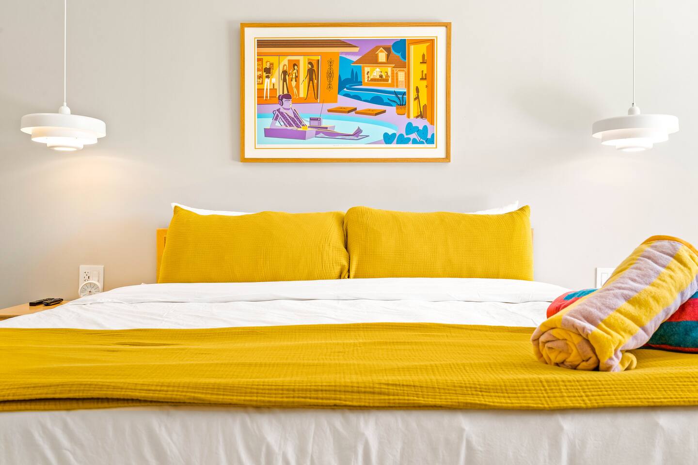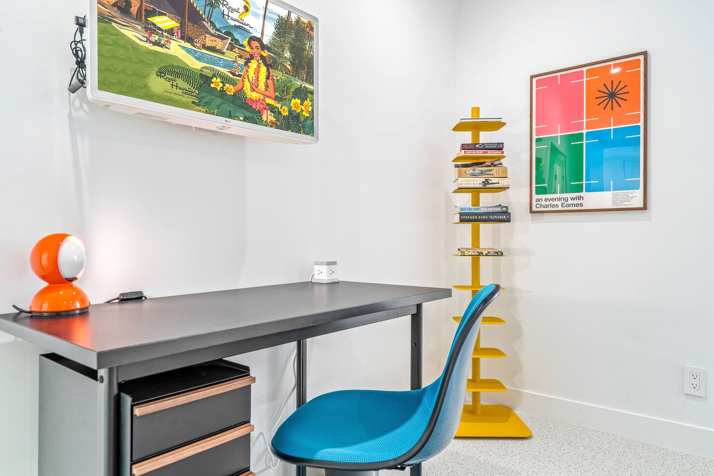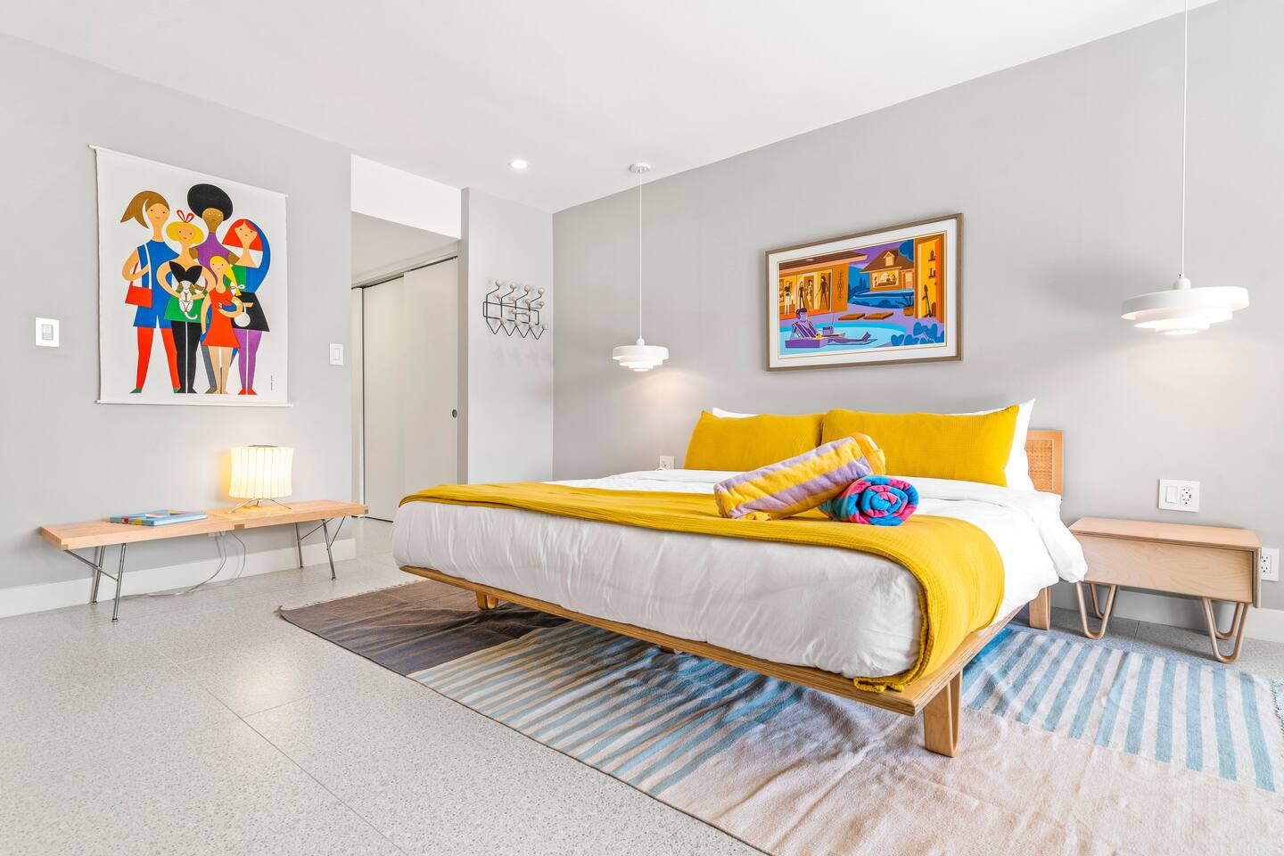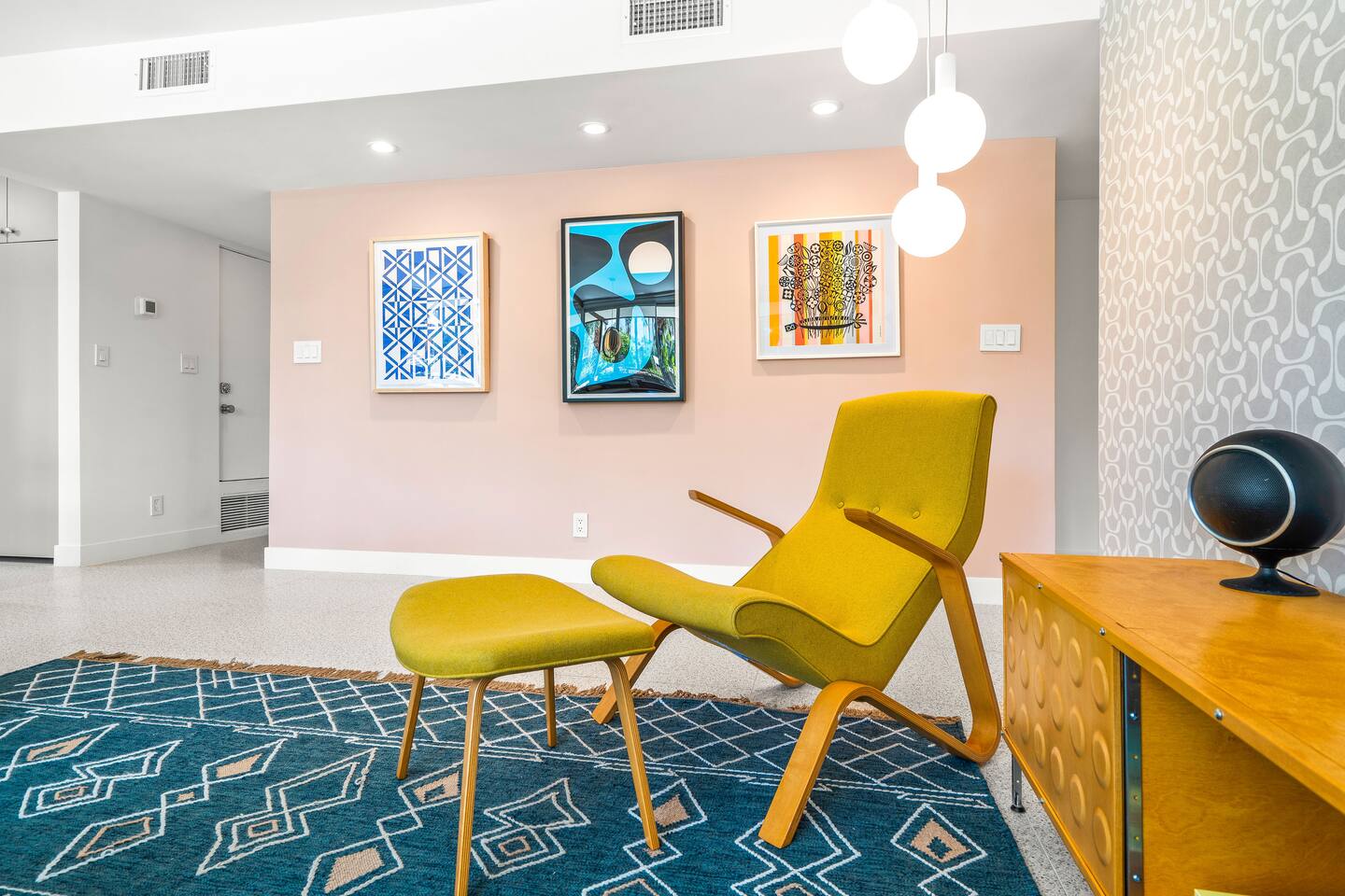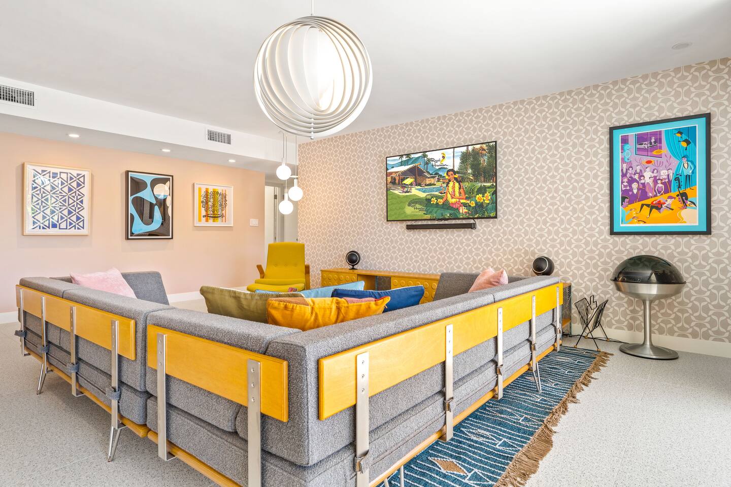 This stunning two-bedroom condo is in the landmark Royal Hawaiian Estates, Palm Springs’ first designated Class 1 Historic Residential District. This home boasts vintage and new modernist furnishings, lighting and artwork from Modernica, Blue Dot, Herman Miller, Eero Saarinen, Vernor Panton, George Nelson, Alexander Girard, Shag, William Krisel and Gary Wexler. As you approach the Royal Hawaiian, you’ll notice the tropics-influenced architecture. Bright oranges and yellows accent jungle browns. The famous “flying sevens” are a stunning detail, capping each building with outrigger-inspired eye candy. Enter the oasis-like grounds and notice the many tiki gods standing amidst the tropical and desert flora to welcome you. When you cross the threshold into this beautiful home, the thoughtful mid-century modern look and décor will make you “aha” as you realize the perfection of the name Tropical Modernism. And the view — just look at those photos! Situated at the foot of the majestic San Jacinto mountains at the prized south end of Palm Springs, the desert scenery and vibe will sooth you better than any cocktail...but why not have a Mai Tai?! Accommodations: Enter the spacious living room and be wowed by the clever combination of vintage and new modern furniture and décor. The soft ochre hues immediately begin to relax you. The navy, patterned rug guides your eye to the television wall and its wonderfully accented wallpaper. Whimsical art, a Vintage Electrohome Apollo 711 Turntable & Ball Speakers (1971), and a yellow Grasshopper Chair & Ottoman designed by Eero Saarinen beckon you to relax. Terrazzo floor tiles lead you around to the dining area where you’ll find a classic Saarinen pedestal table and tulip chairs. The kitchen, again in that soothing ochre with clean white accents, is a perfect combination of original mid-century style plus modern appliances. Open the sliding patio door and be transported to paradise! Your patio overlooks one of the 2 pools at Royal Hawaiian, visible through the lush tropical foliage that provides you with privacy. And you are just steps away from the hot tub! Make your way to the master bedroom suite where the Modernica king bed and Brooklinen linens will lull you to sleep, then awaken to the beautiful nature just outside another sliding door to the patio. A "Stash" desk and chair are available for any work from home needs. And dig the unchanged ensuite bath with its original sunken Roman bath! The second bedroom also features fun wallpaper, Mode Desk by Herman Miller and chair for any work from home needs, and the hotel quality queen bed and Brooklinen linens will send you to dreamland. So mix up a tiki drink, lounge poolside, and bask in the serene beauty that is Tropical Modernism at the Royal Hawaiian Estates! Amenities: • Accommodations for 4 (plus 2 kids on the day beds) • 2 bedrooms (1 King and 1 Queen) with plush, hotel quality mattresses • 1 ensuite master bathroom • 1 central bathroom • Brooklinen luxury linens • Two heated community pools and a hot tub with stunning mountain views • Gas grill • Wall-mounted TV in the living room • Fully equipped kitchen • Dining table with seating for 4 as well as island seating for 3 • Private patio with dining table with seating for 6 as well as 2 Adirondack chairs • Washer and dryer in the condo • Your own car port plus extra on-site parking for up to two more cars