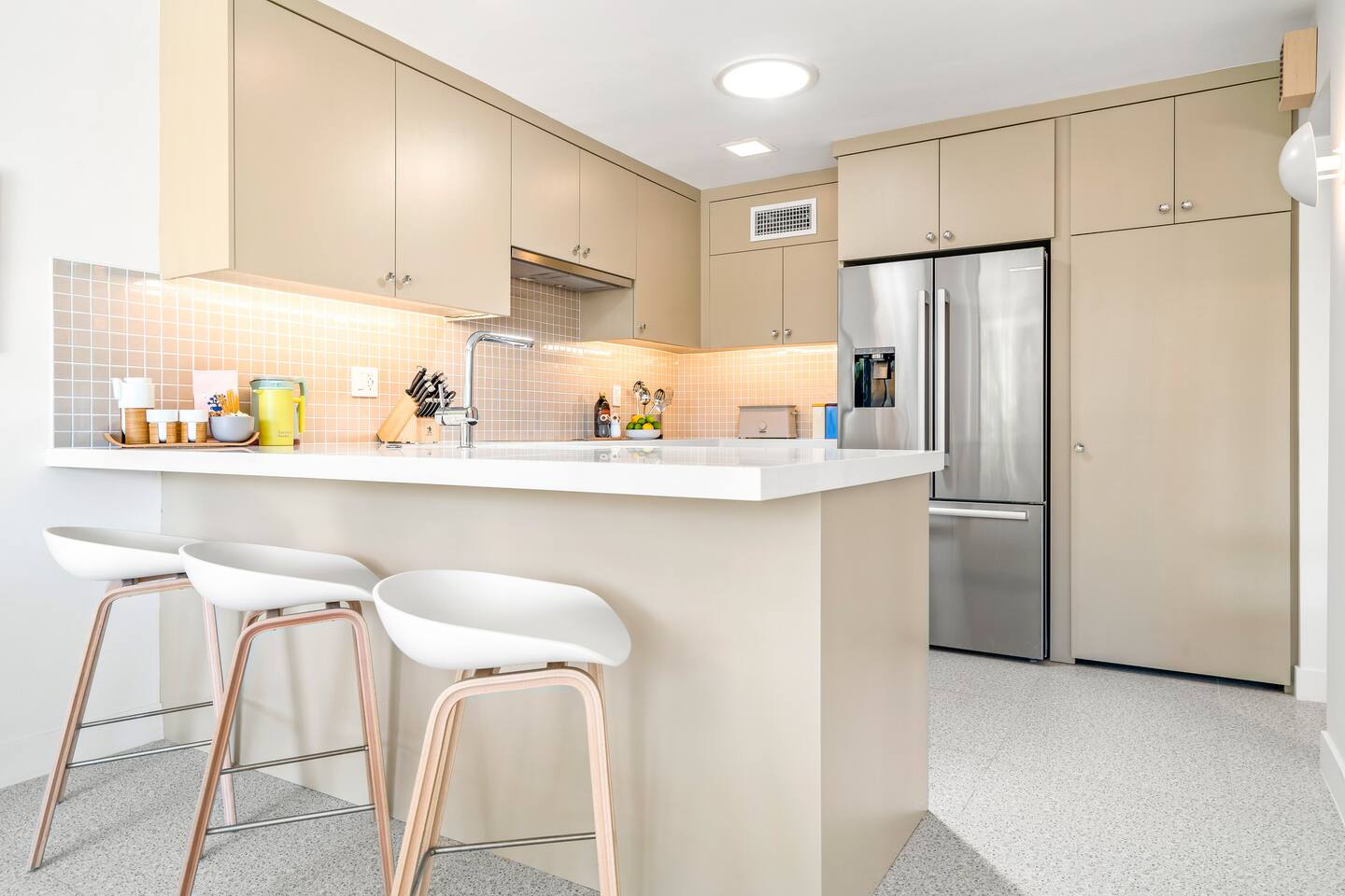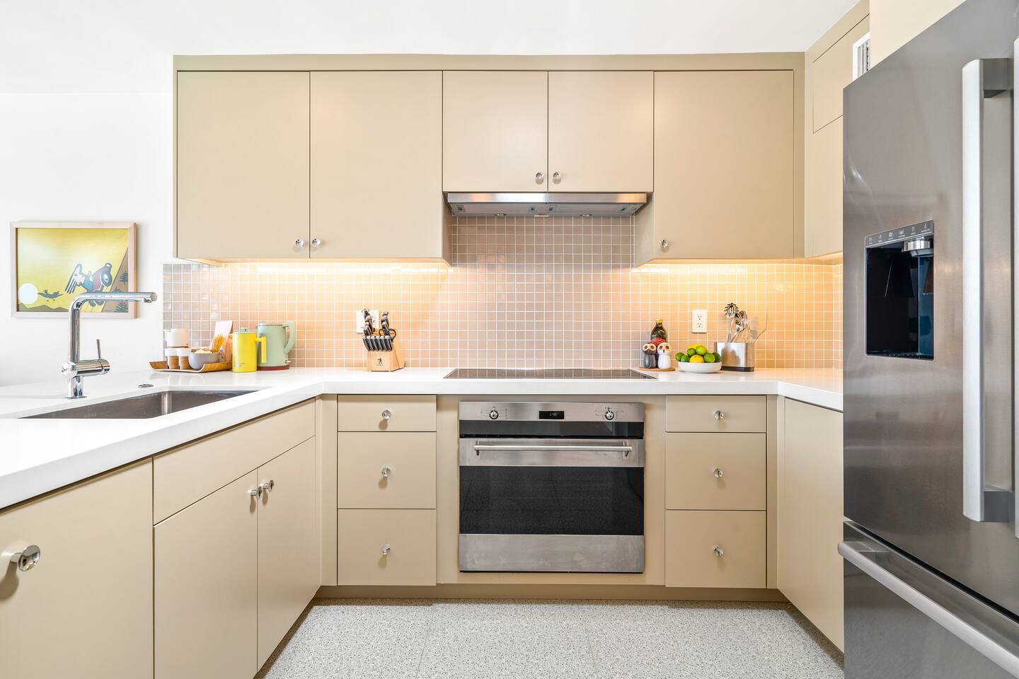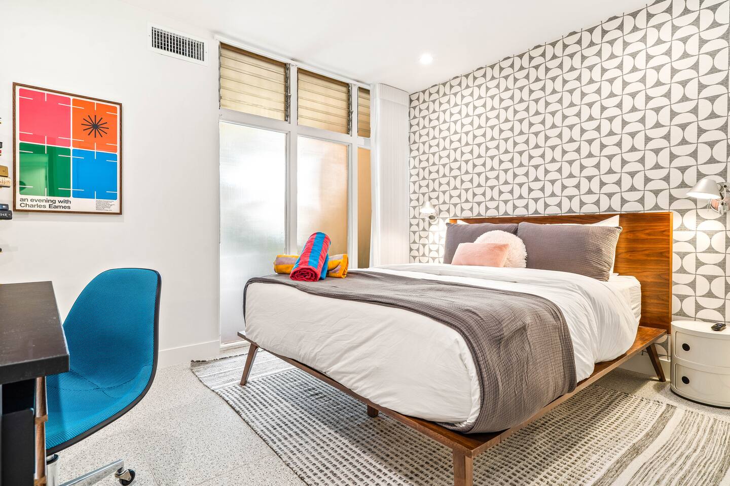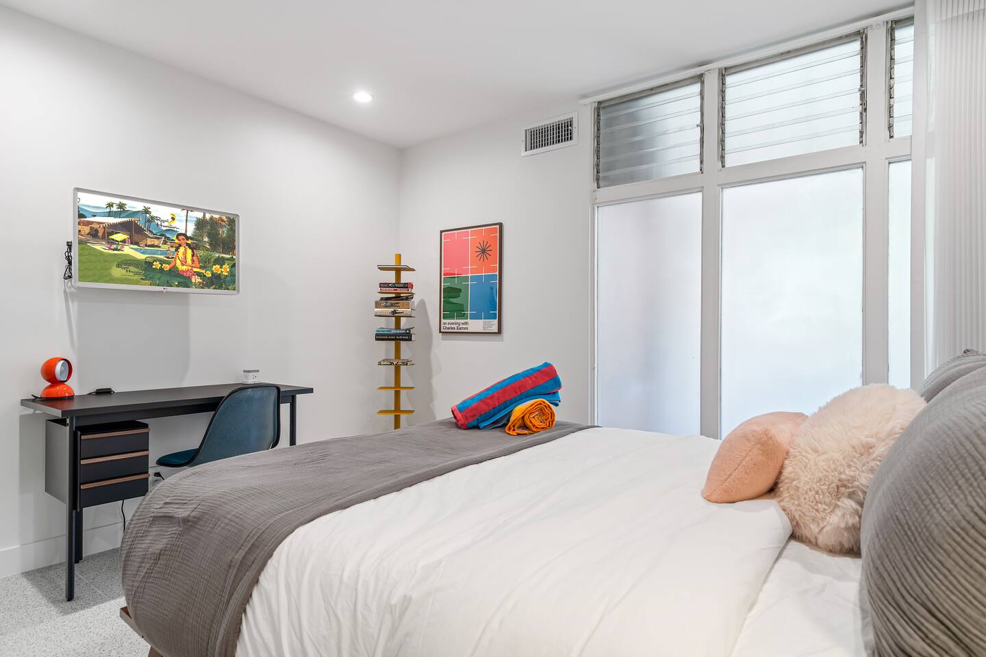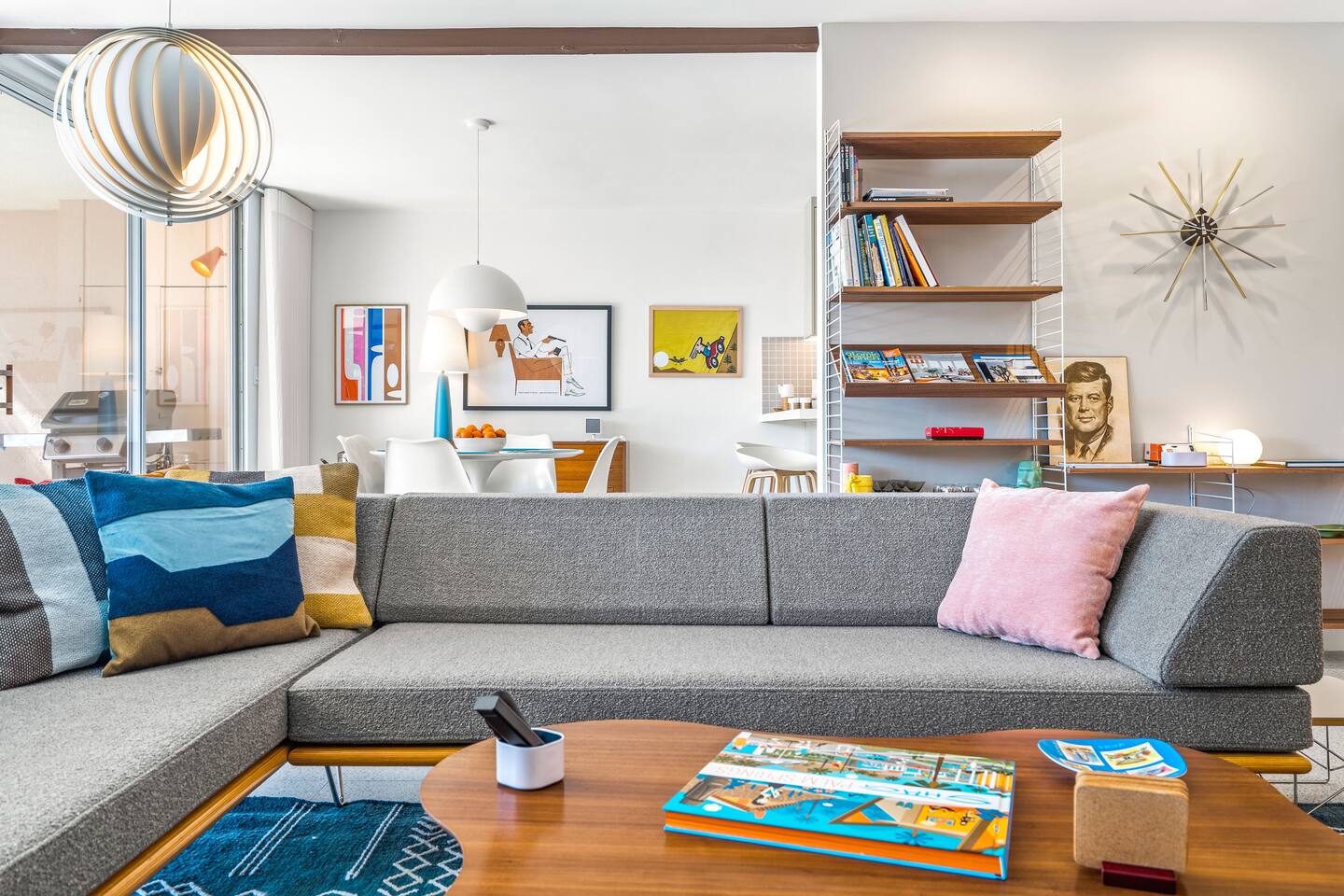 This stunning two-bedroom condo is in the landmark Royal Hawaiian Estates, Palm Springs’ first designated Class 1 Historic Residential District. This home boasts vintage and new modernist furnishings, lighting and artwork from Modernica, Blue Dot, Herman Miller, Eero Saarinen, Vernor Panton, George Nelson, Alexander Girard, Shag, William Krisel and Gary Wexler. As you approach the Royal Hawaiian, you’ll notice the tropics-influenced architecture. Bright oranges and yellows accent jungle browns. The famous “flying sevens” are a stunning detail, capping each building with outrigger-inspired eye candy. Enter the oasis-like grounds and notice the many tiki gods standing amidst the tropical and desert flora to welcome you. When you cross the threshold into this beautiful home, the thoughtful mid-century modern look and décor will make you “aha” as you realize the perfection of the name Tropical Modernism. And the view — just look at those photos! Situated at the foot of the majestic San Jacinto mountains at the prized south end of Palm Springs, the desert scenery and vibe will sooth you better than any cocktail...but why not have a Mai Tai?! Accommodations: Enter the spacious living room and be wowed by the clever combination of vintage and new modern furniture and décor. The soft ochre hues immediately begin to relax you. The navy, patterned rug guides your eye to the television wall and its wonderfully accented wallpaper. Whimsical art, a Vintage Electrohome Apollo 711 Turntable & Ball Speakers (1971), and a yellow Grasshopper Chair & Ottoman designed by Eero Saarinen beckon you to relax. Terrazzo floor tiles lead you around to the dining area where you’ll find a classic Saarinen pedestal table and tulip chairs. The kitchen, again in that soothing ochre with clean white accents, is a perfect combination of original mid-century style plus modern appliances. Open the sliding patio door and be transported to paradise! Your patio overlooks one of the 2 pools at Royal Hawaiian, visible through the lush tropical foliage that provides you with privacy. And you are just steps away from the hot tub! Make your way to the master bedroom suite where the Modernica king bed and Brooklinen linens will lull you to sleep, then awaken to the beautiful nature just outside another sliding door to the patio. A "Stash" desk and chair are available for any work from home needs. And dig the unchanged ensuite bath with its original sunken Roman bath! The second bedroom also features fun wallpaper, Mode Desk by Herman Miller and chair for any work from home needs, and the hotel quality queen bed and Brooklinen linens will send you to dreamland. So mix up a tiki drink, lounge poolside, and bask in the serene beauty that is Tropical Modernism at the Royal Hawaiian Estates! Amenities: • Accommodations for 4 (plus 2 kids on the day beds) • 2 bedrooms (1 King and 1 Queen) with plush, hotel quality mattresses • 1 ensuite master bathroom • 1 central bathroom • Brooklinen luxury linens • Two heated community pools and a hot tub with stunning mountain views • Gas grill • Wall-mounted TV in the living room • Fully equipped kitchen • Dining table with seating for 4 as well as island seating for 3 • Private patio with dining table with seating for 6 as well as 2 Adirondack chairs • Washer and dryer in the condo • Your own car port plus extra on-site parking for up to two more cars