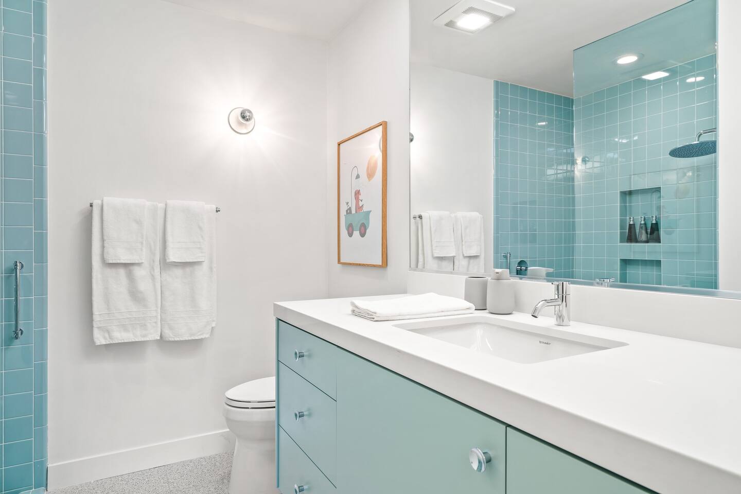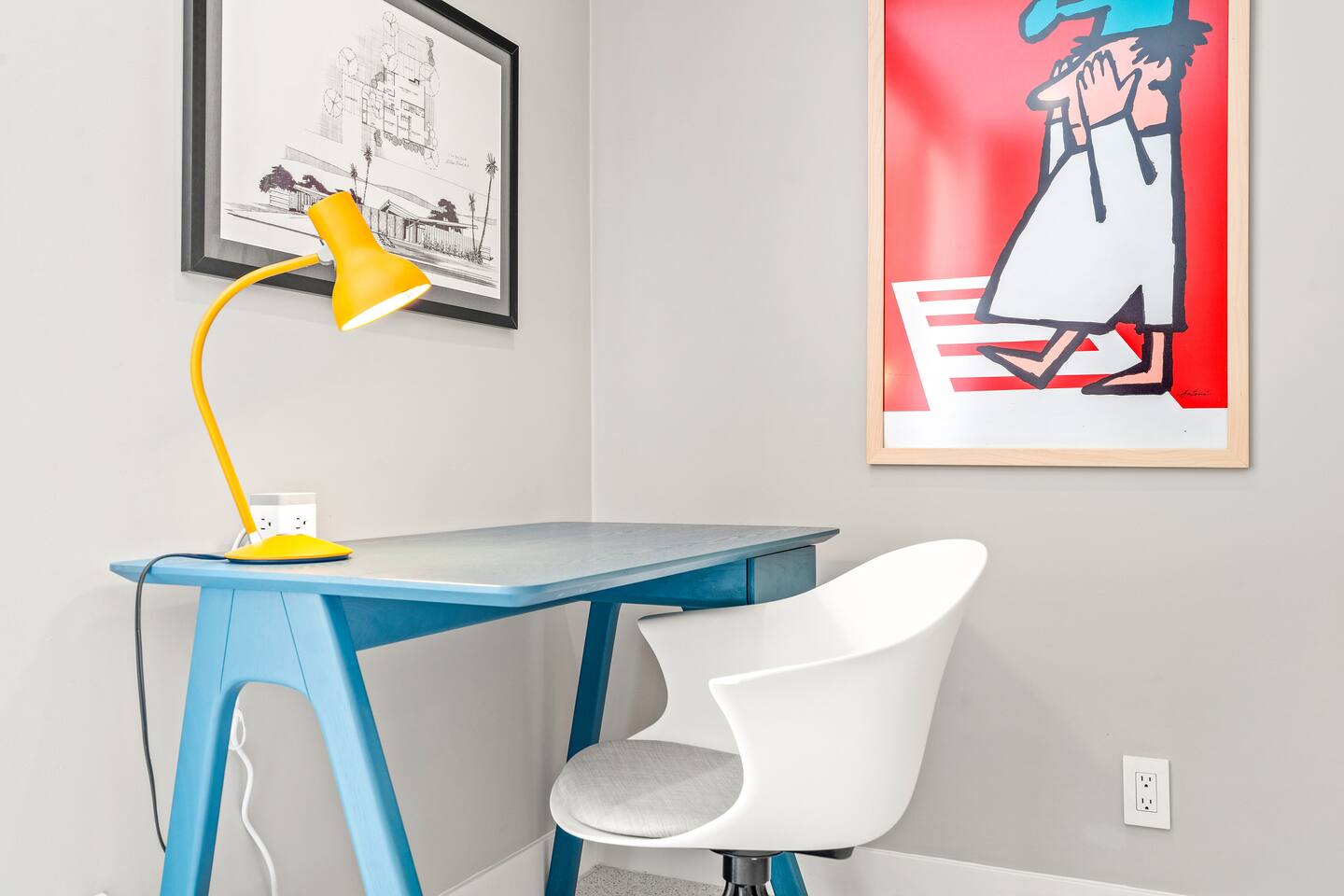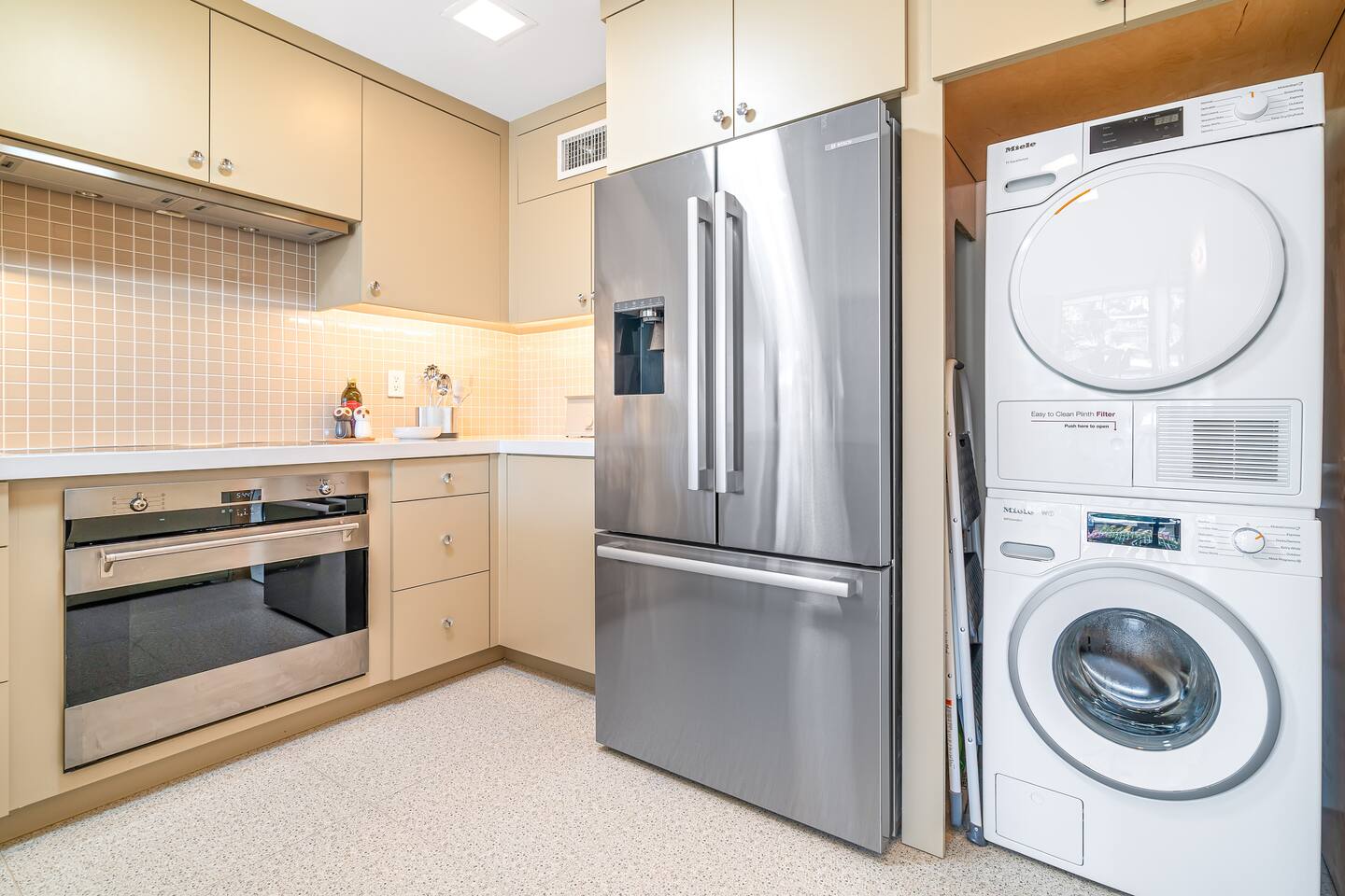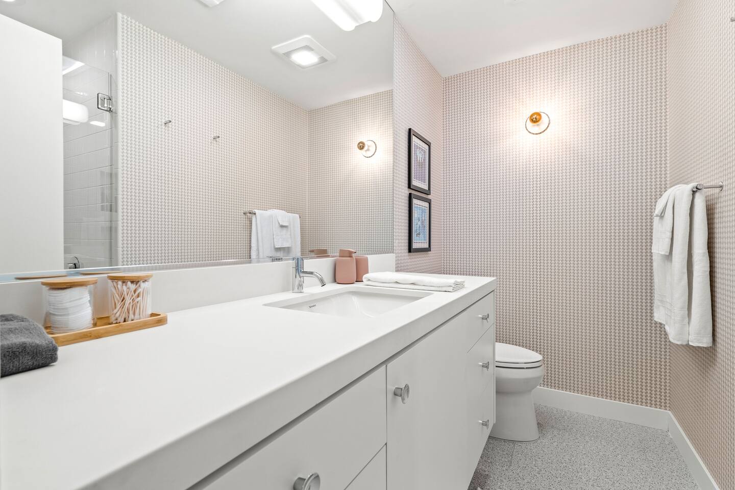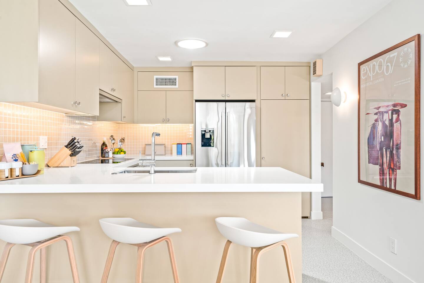 This stunning two-bedroom condo is in the landmark Royal Hawaiian Estates, Palm Springs’ first designated Class 1 Historic Residential District. This home boasts vintage and new modernist furnishings, lighting and artwork from Modernica, Blue Dot, Herman Miller, Eero Saarinen, Vernor Panton, George Nelson, Alexander Girard, Shag, William Krisel and Gary Wexler. As you approach the Royal Hawaiian, you’ll notice the tropics-influenced architecture. Bright oranges and yellows accent jungle browns. The famous “flying sevens” are a stunning detail, capping each building with outrigger-inspired eye candy. Enter the oasis-like grounds and notice the many tiki gods standing amidst the tropical and desert flora to welcome you. When you cross the threshold into this beautiful home, the thoughtful mid-century modern look and décor will make you “aha” as you realize the perfection of the name Tropical Modernism. And the view — just look at those photos! Situated at the foot of the majestic San Jacinto mountains at the prized south end of Palm Springs, the desert scenery and vibe will sooth you better than any cocktail...but why not have a Mai Tai?! Accommodations: Enter the spacious living room and be wowed by the clever combination of vintage and new modern furniture and décor. The soft ochre hues immediately begin to relax you. The navy, patterned rug guides your eye to the television wall and its wonderfully accented wallpaper. Whimsical art, a Vintage Electrohome Apollo 711 Turntable & Ball Speakers (1971), and a yellow Grasshopper Chair & Ottoman designed by Eero Saarinen beckon you to relax. Terrazzo floor tiles lead you around to the dining area where you’ll find a classic Saarinen pedestal table and tulip chairs. The kitchen, again in that soothing ochre with clean white accents, is a perfect combination of original mid-century style plus modern appliances. Open the sliding patio door and be transported to paradise! Your patio overlooks one of the 2 pools at Royal Hawaiian, visible through the lush tropical foliage that provides you with privacy. And you are just steps away from the hot tub! Make your way to the master bedroom suite where the Modernica king bed and Brooklinen linens will lull you to sleep, then awaken to the beautiful nature just outside another sliding door to the patio. A "Stash" desk and chair are available for any work from home needs. And dig the unchanged ensuite bath with its original sunken Roman bath! The second bedroom also features fun wallpaper, Mode Desk by Herman Miller and chair for any work from home needs, and the hotel quality queen bed and Brooklinen linens will send you to dreamland. So mix up a tiki drink, lounge poolside, and bask in the serene beauty that is Tropical Modernism at the Royal Hawaiian Estates! Amenities: • Accommodations for 4 (plus 2 kids on the day beds) • 2 bedrooms (1 King and 1 Queen) with plush, hotel quality mattresses • 1 ensuite master bathroom • 1 central bathroom • Brooklinen luxury linens • Two heated community pools and a hot tub with stunning mountain views • Gas grill • Wall-mounted TV in the living room • Fully equipped kitchen • Dining table with seating for 4 as well as island seating for 3 • Private patio with dining table with seating for 6 as well as 2 Adirondack chairs • Washer and dryer in the condo • Your own car port plus extra on-site parking for up to two more cars
